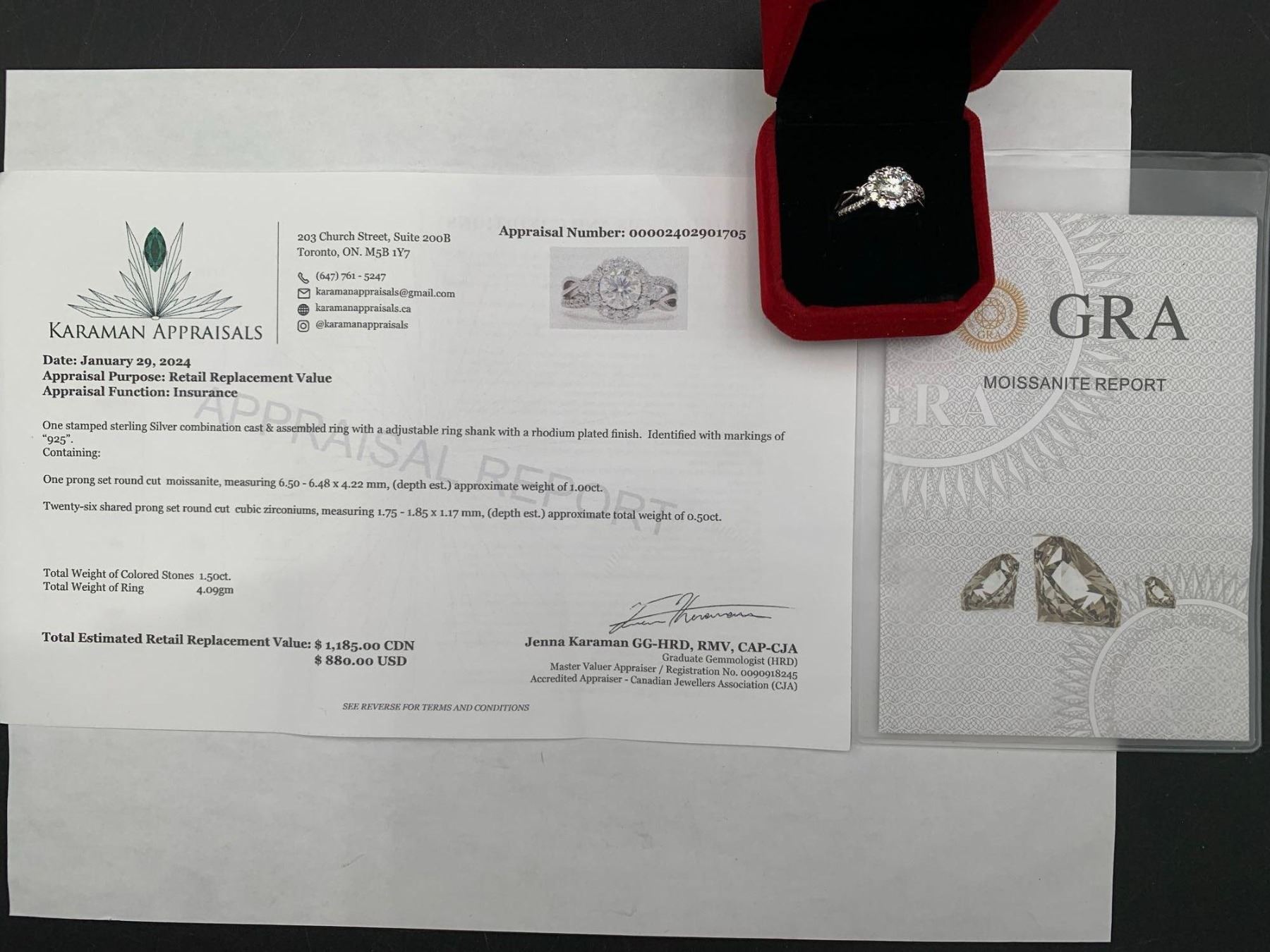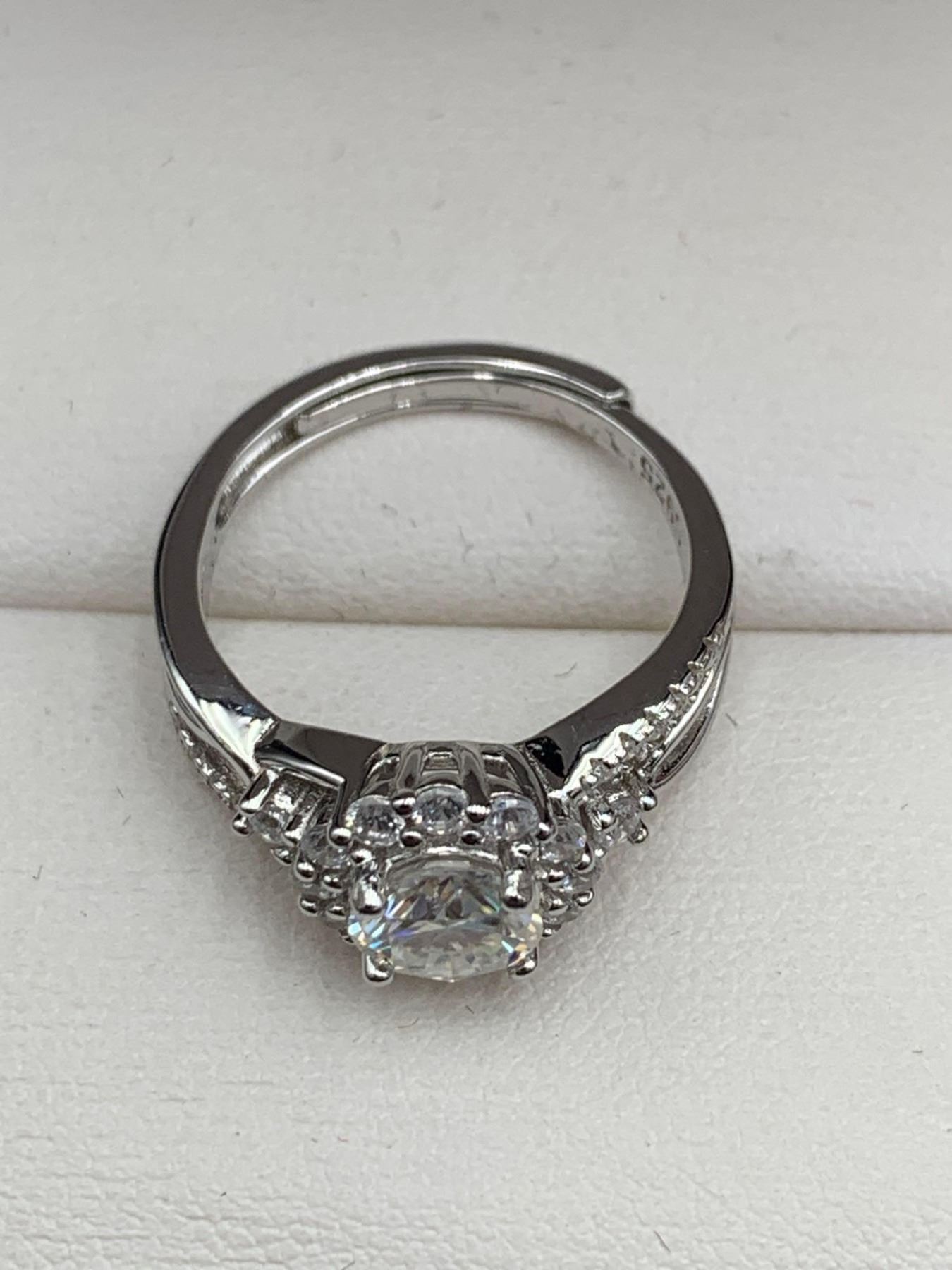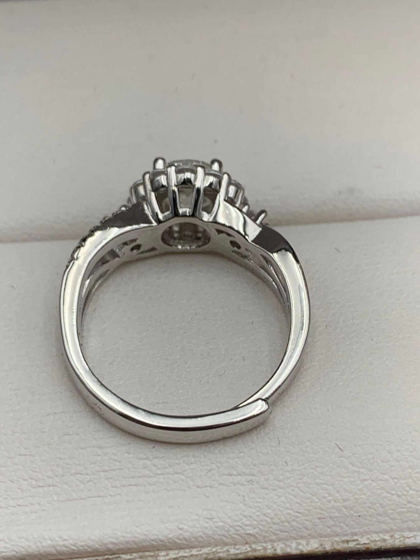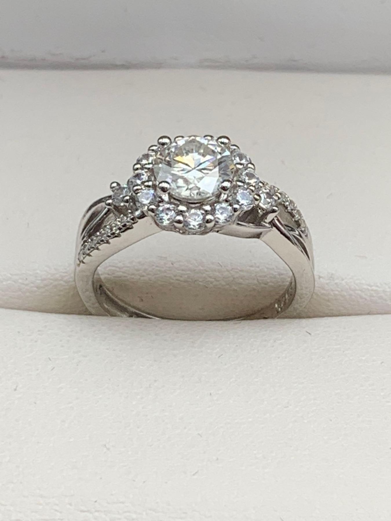 1.00 CT GRA CERTIFIED MOISSANITE VVS D COLOR SURROUNDED BY ROUND HALO WITH ROUND CUT CUBIC ZIRCONIUM AND MORE SET IN THE SHOULDERS WEIGHING A TOTAL 0.50 CT RETAIL VALUE $1,185.00