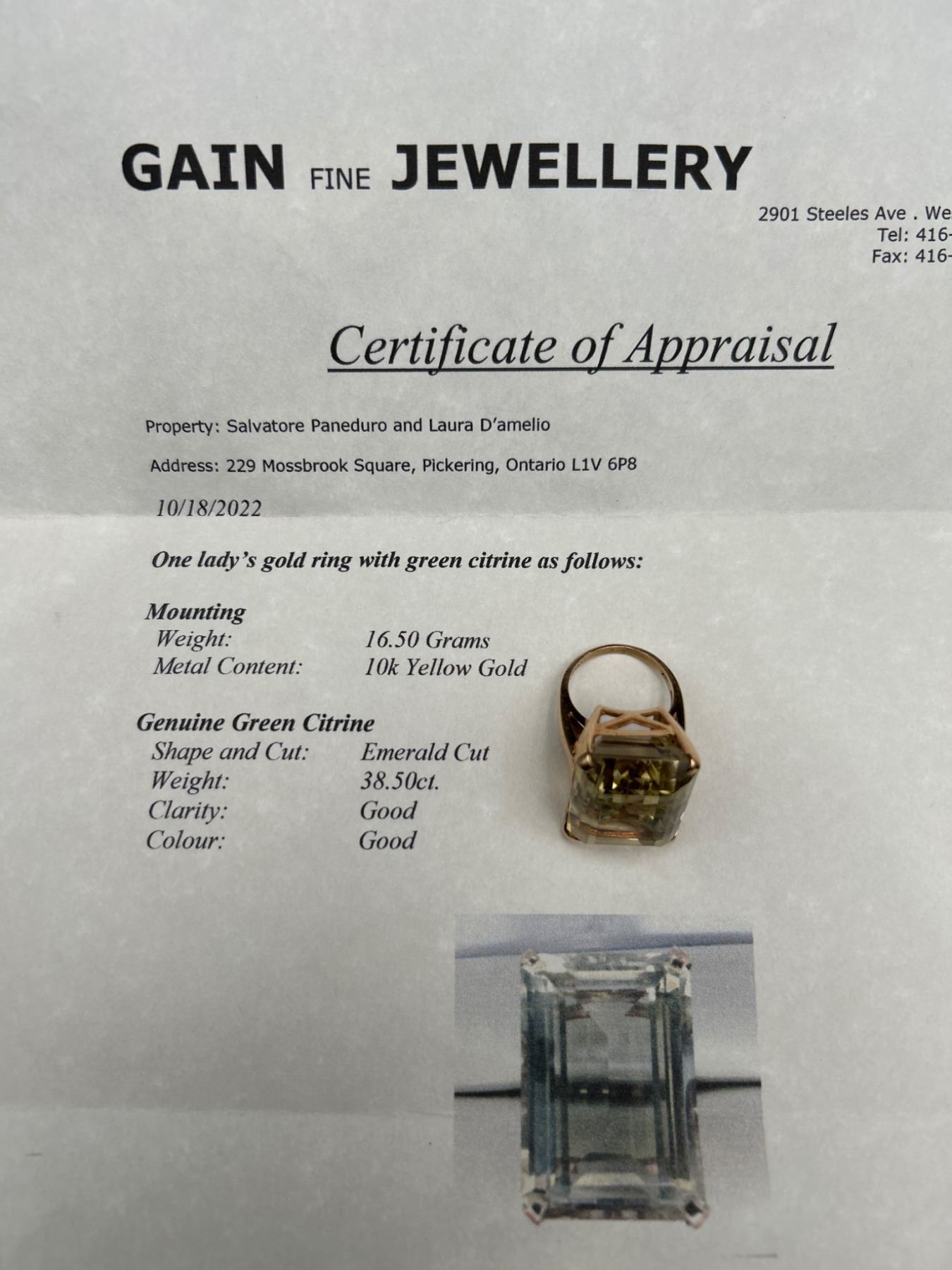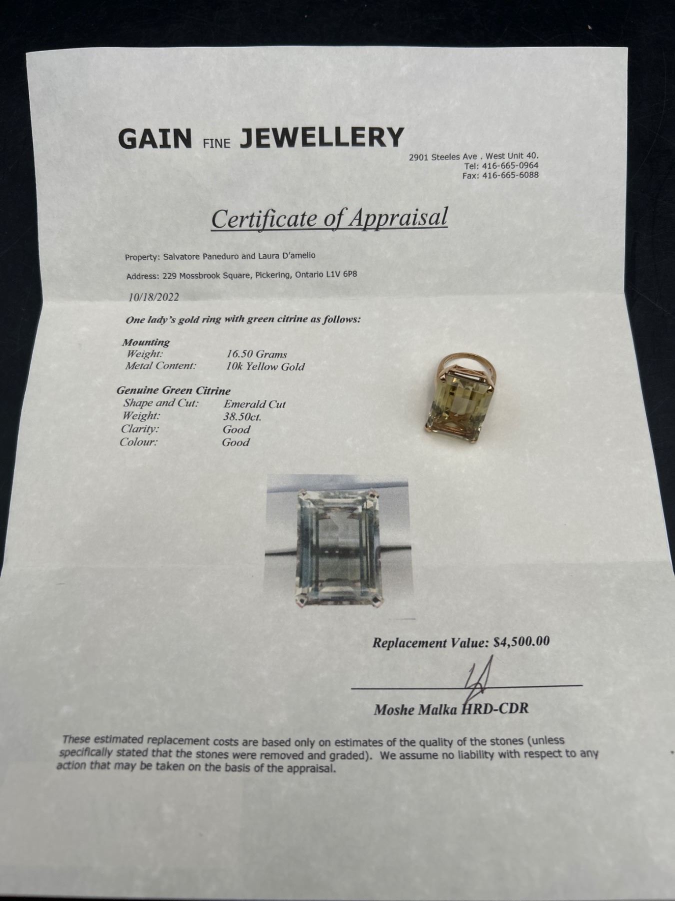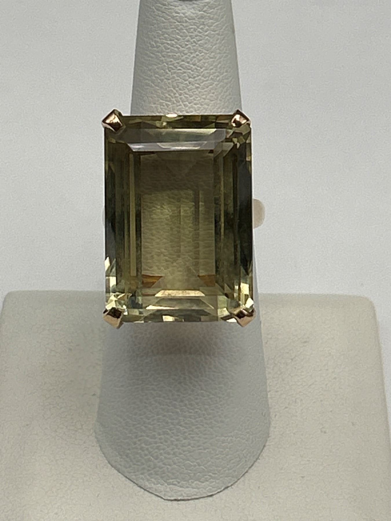 This lot includes a 10K gold ring featuring a green citrine gemstone. The piece is crafted with a total weight of 38.50 grams and features a 16.50 carat emerald-cut green citrine. The clarity and color of the gemstone are noted as good. The document indicates appraisal details, including a replacement value of $4,500.Size 9