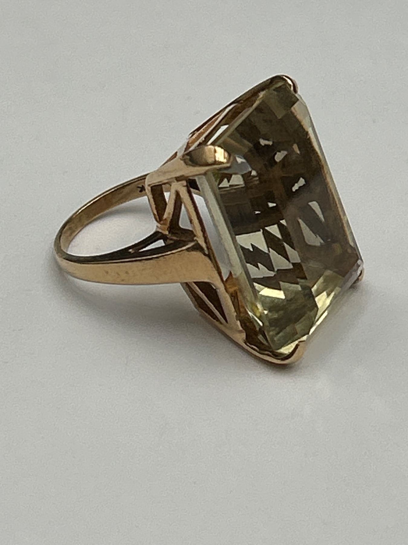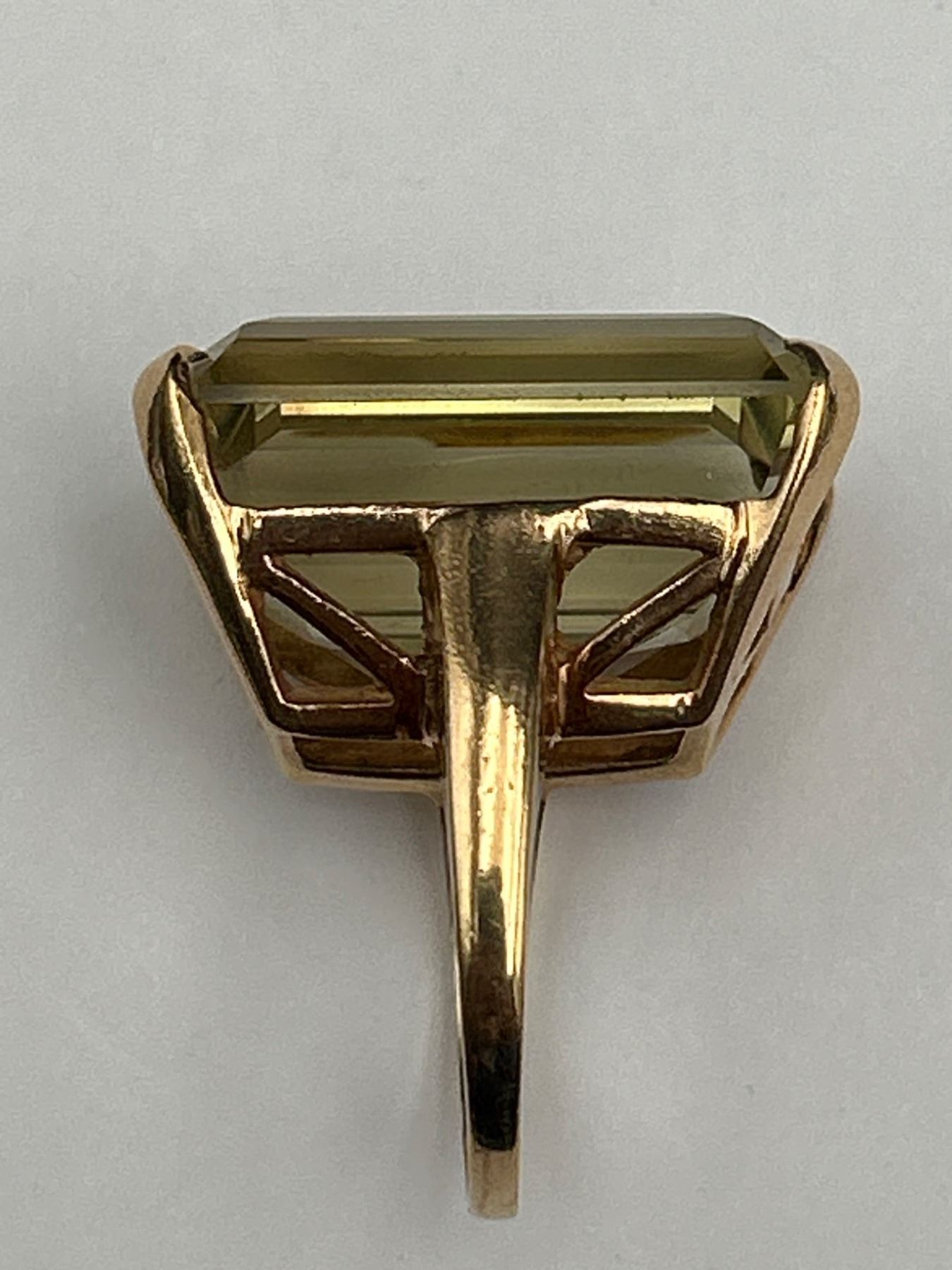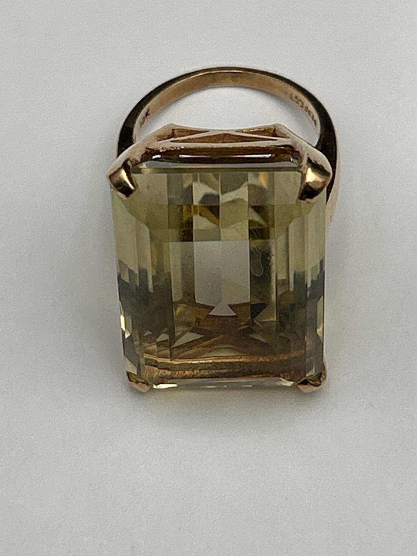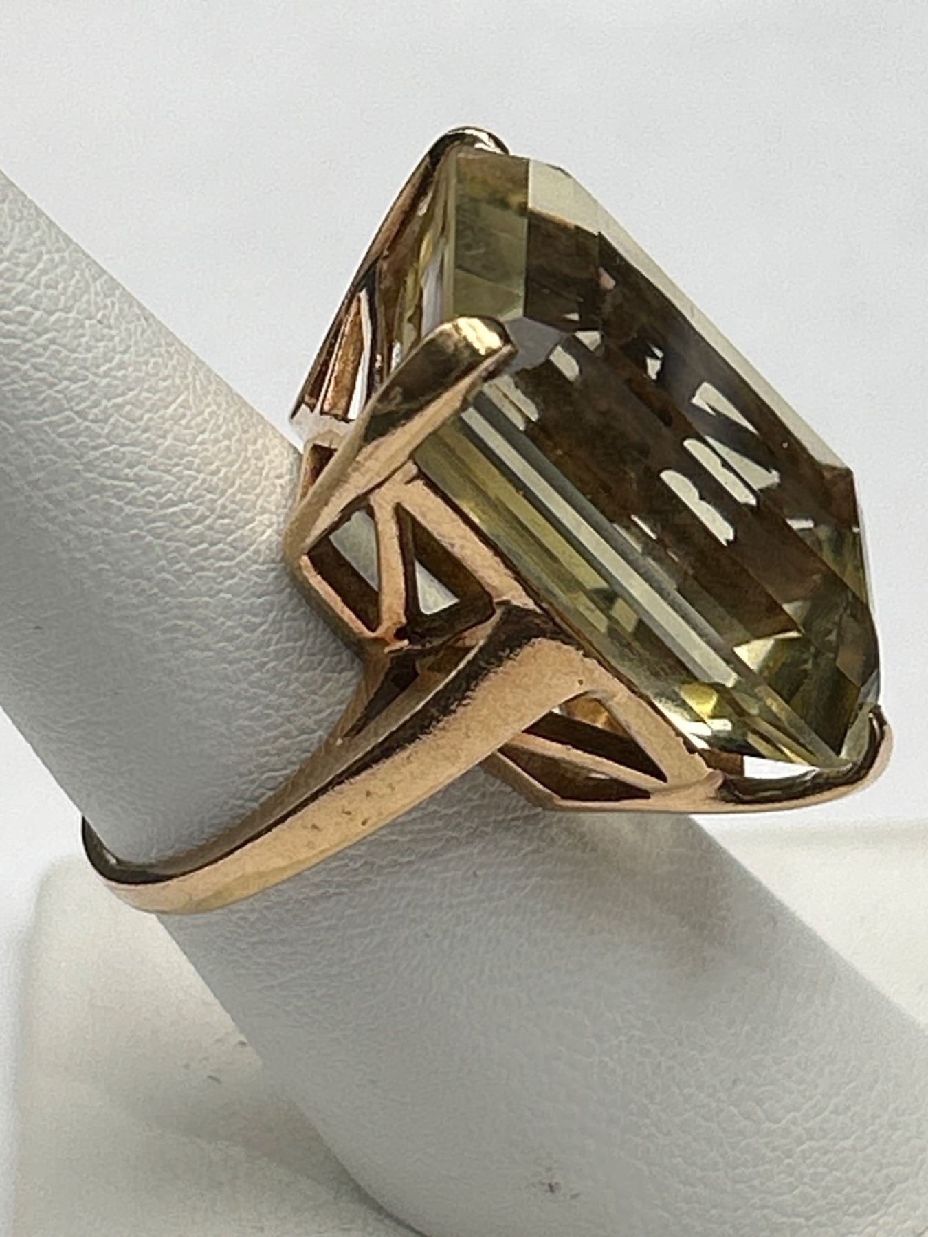 This lot includes a 10K gold ring featuring a green citrine gemstone. The piece is crafted with a total weight of 38.50 grams and features a 16.50 carat emerald-cut green citrine. The clarity and color of the gemstone are noted as good. The document indicates appraisal details, including a replacement value of $4,500.Size 9