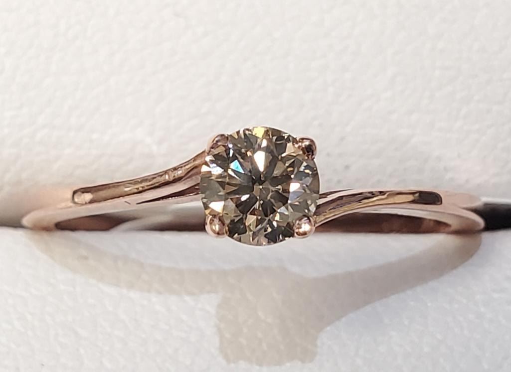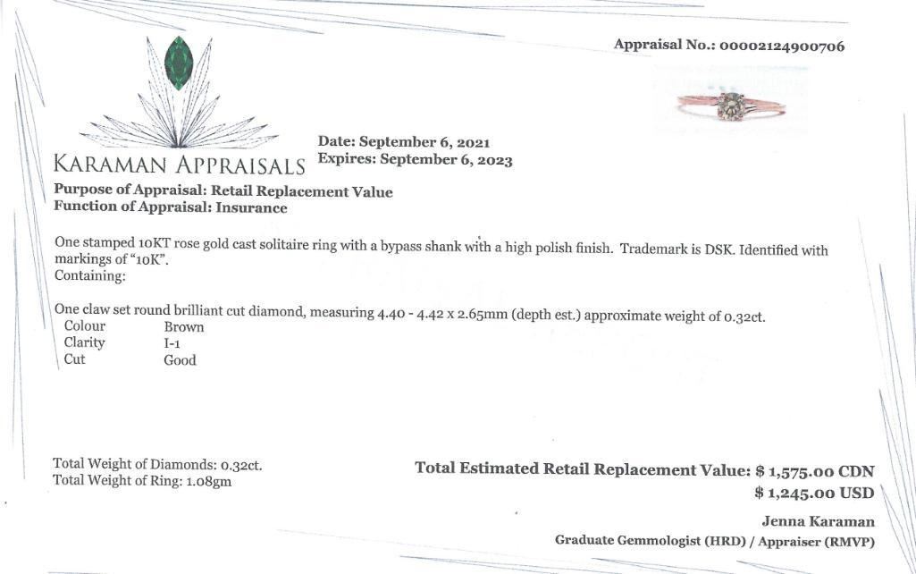 10K Rose Gold Diamond(0.32Ct,I1,Brown) With A Bypass Shank, Solitaire Ring (~Size 6.5) (~weight 1.08g), Made in Canada, Appraised Retail $1575