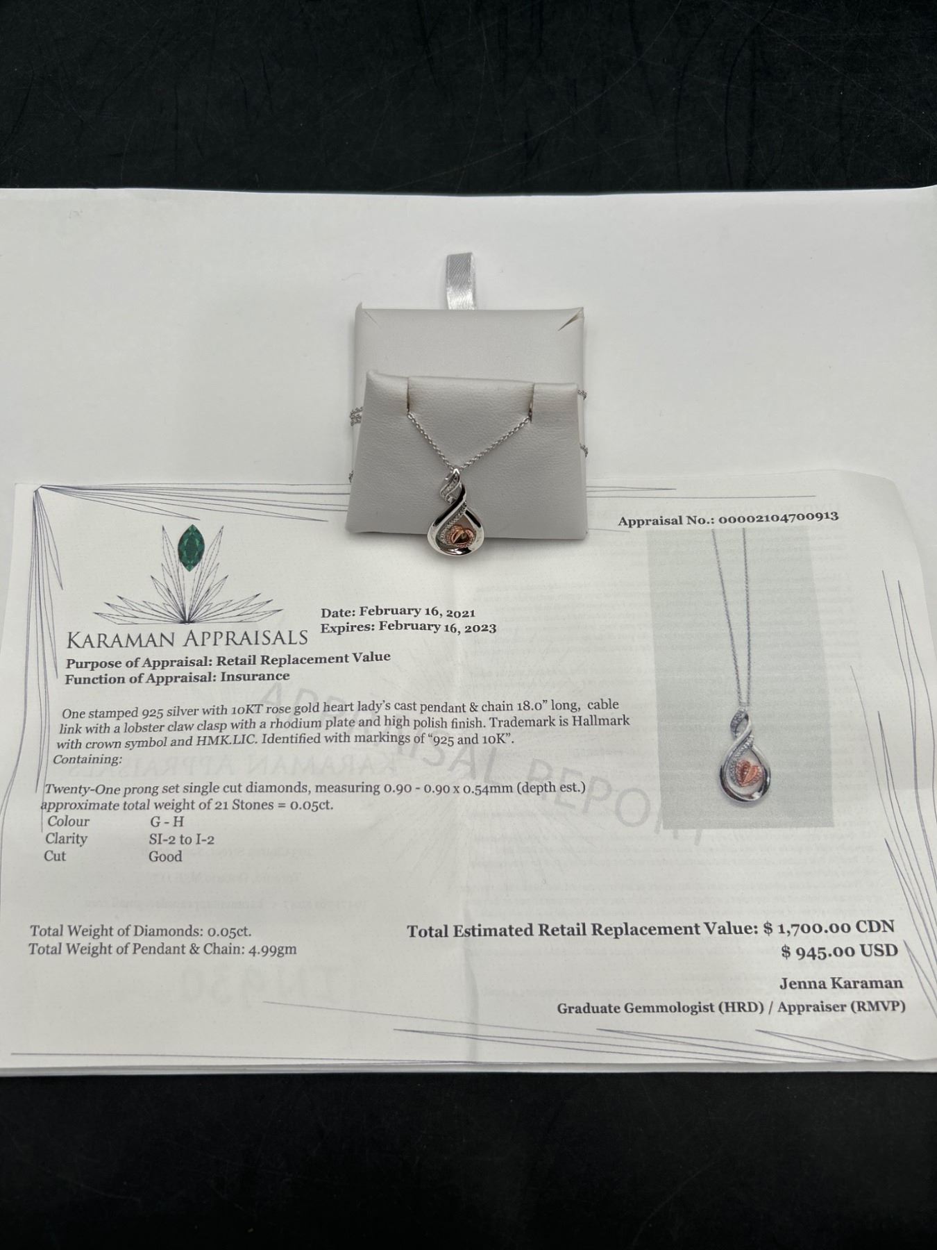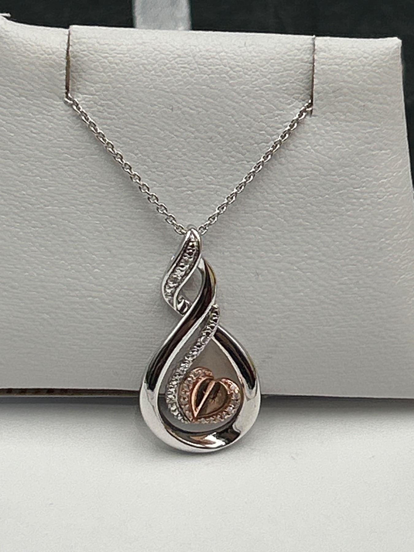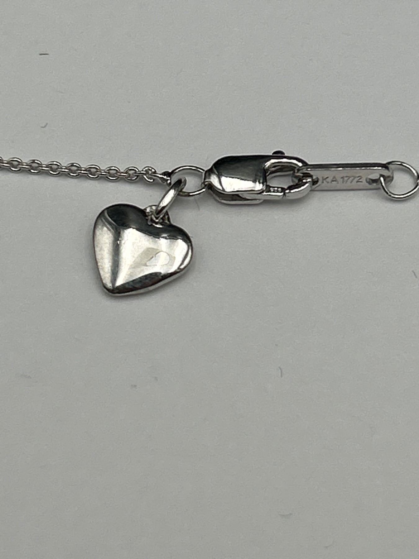 This item is a sterling silver necklace featuring a teardrop-shaped pendant with a 10K rose gold heart at its center. Accentuated with diamonds on the frame, the necklace has a lobster clasp closure with a small heart tag marked with ‘KA1772’. Total weight of diamonds is 0.05ct, and the weight of the pendant and chain is 4.99g. This elegant piece is appraised with a replacement value of $1,700 CAD.