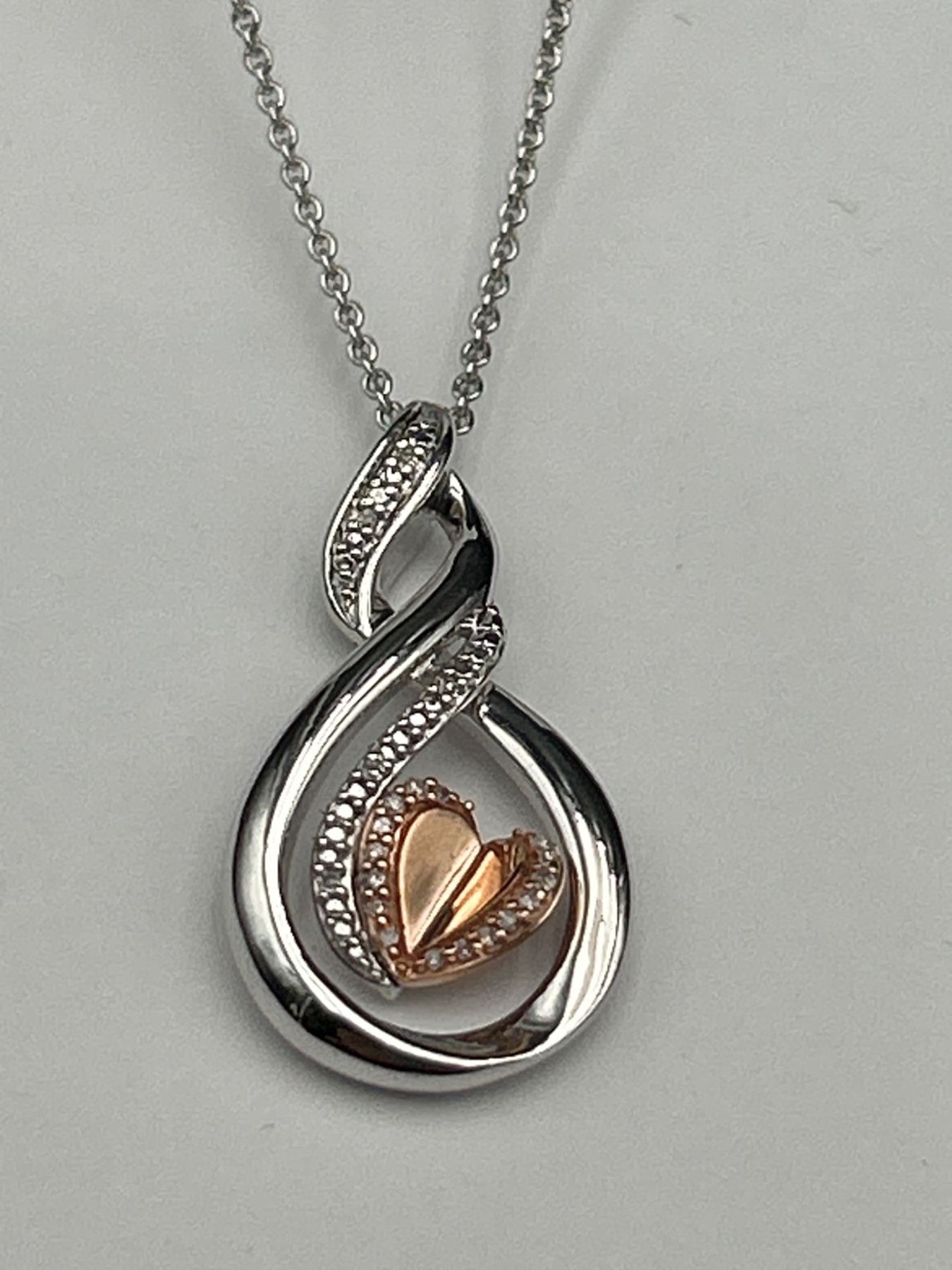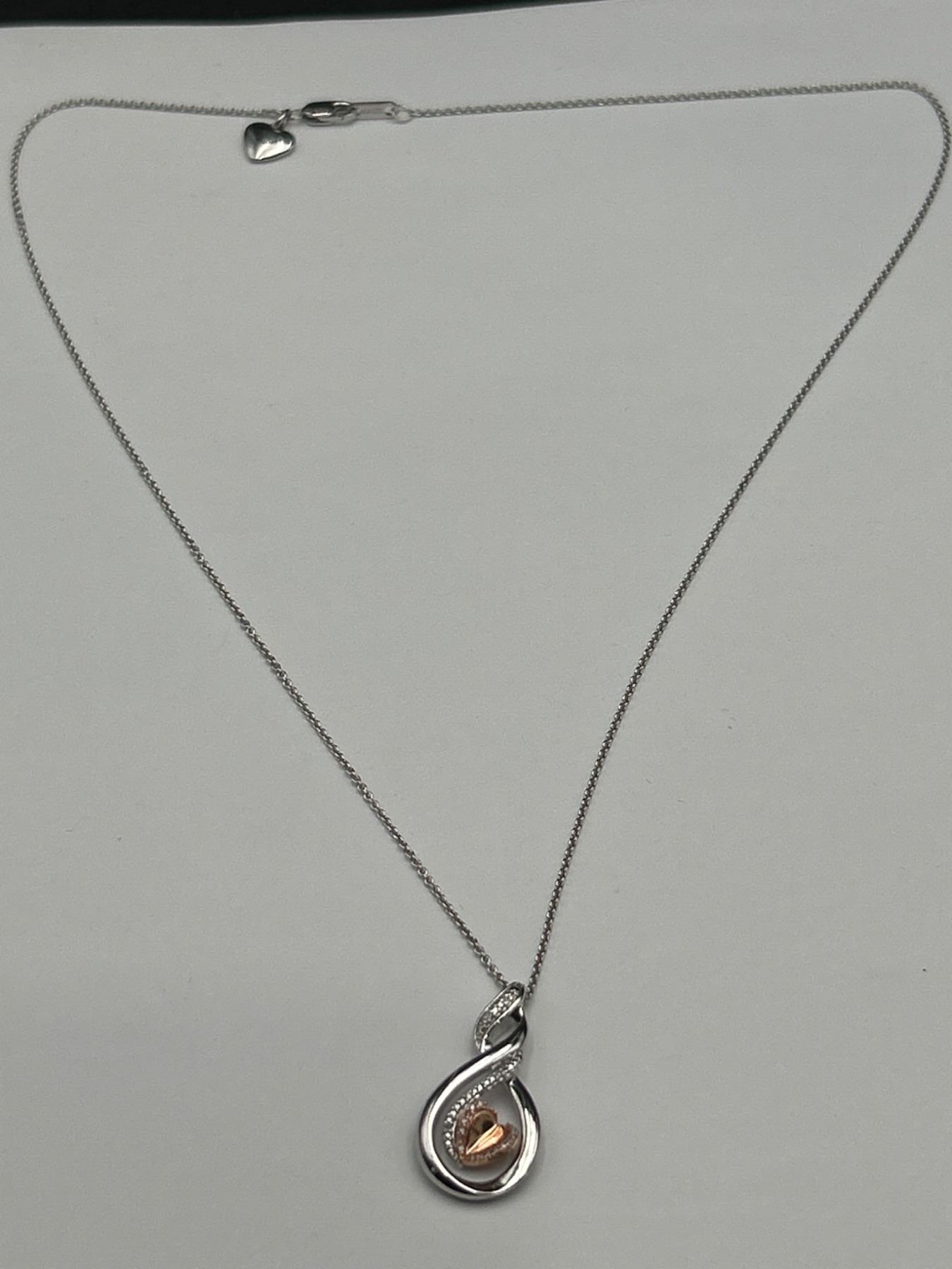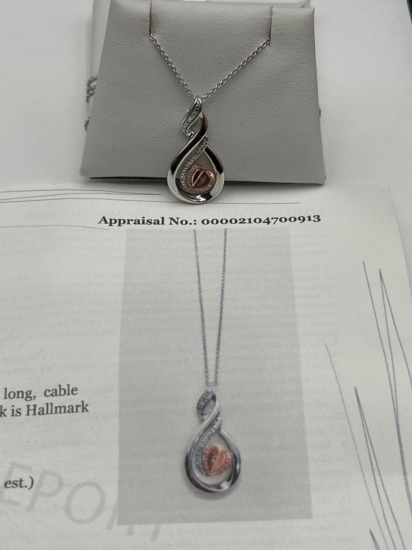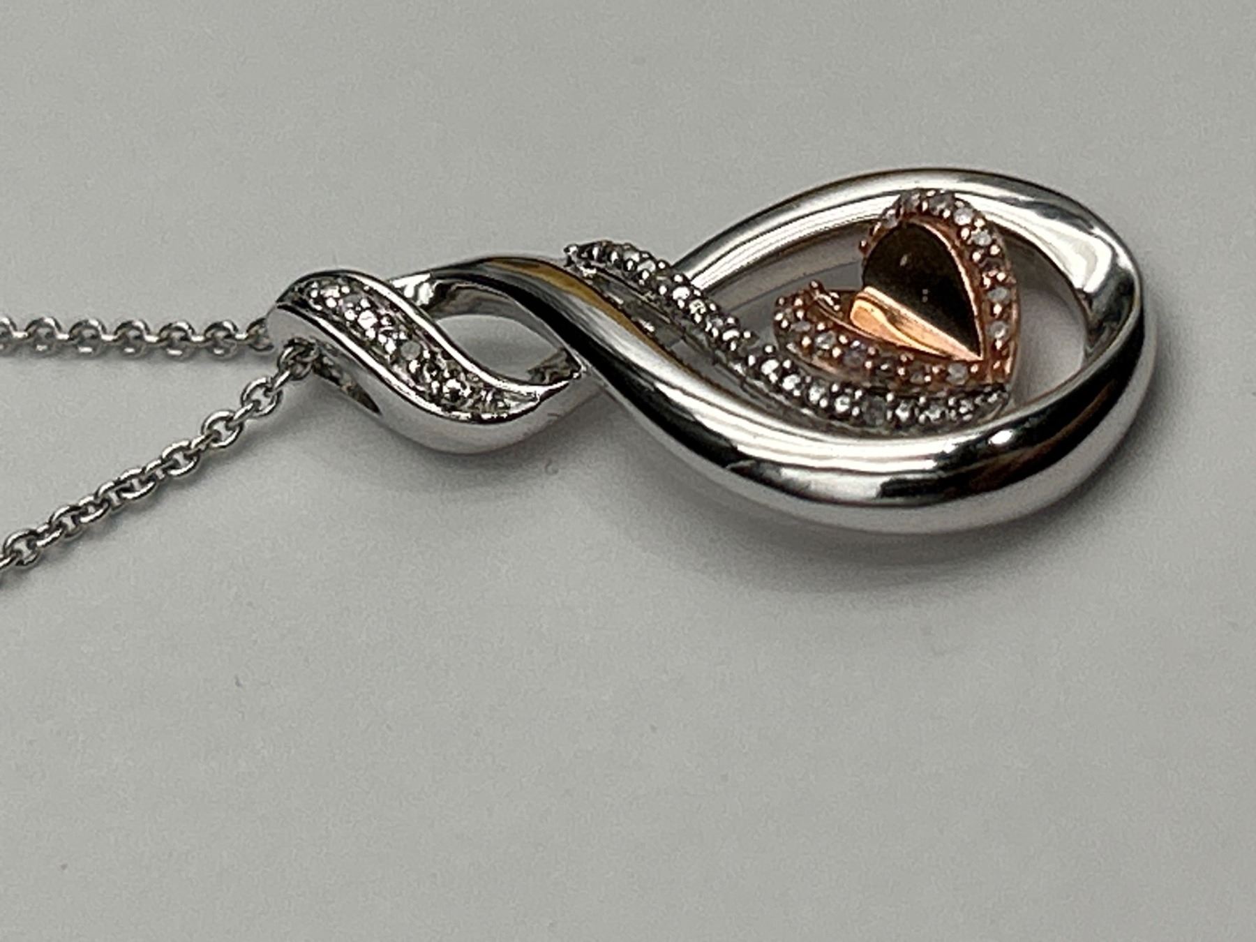 This item is a sterling silver necklace featuring a teardrop-shaped pendant with a 10K rose gold heart at its center. Accentuated with diamonds on the frame, the necklace has a lobster clasp closure with a small heart tag marked with ‘KA1772’. Total weight of diamonds is 0.05ct, and the weight of the pendant and chain is 4.99g. This elegant piece is appraised with a replacement value of $1,700 CAD.