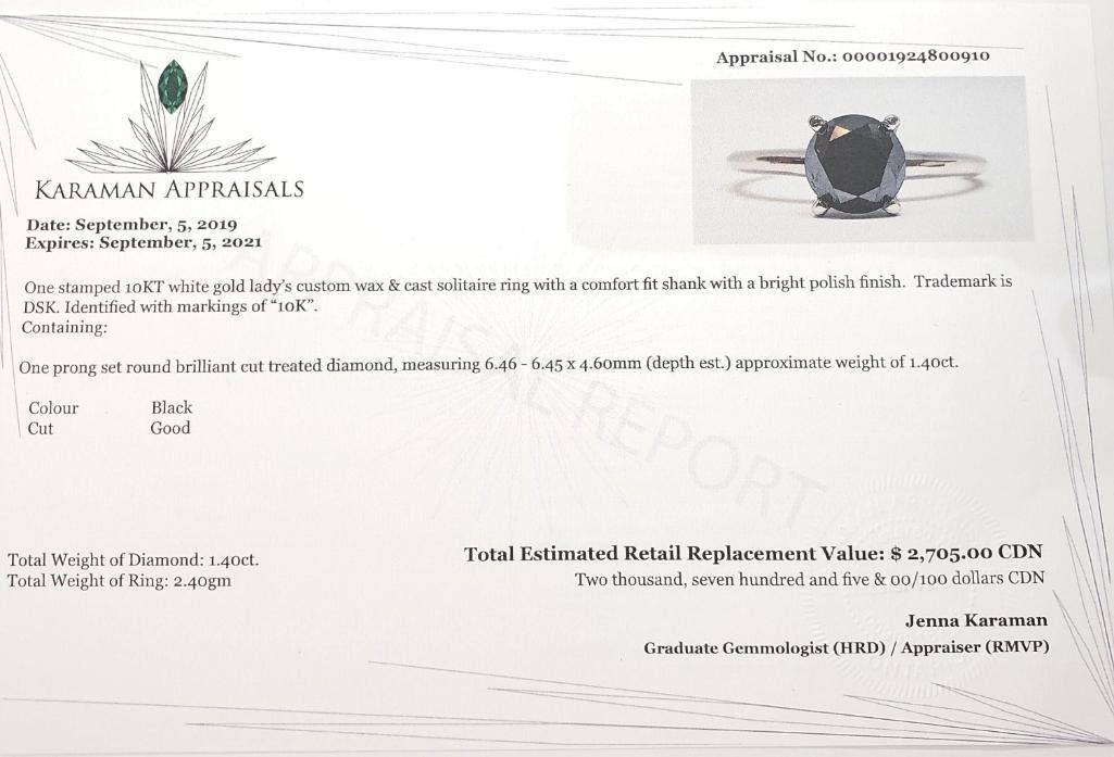 10K White Gold Black Diamond(1.4ct) Ring (~Size 6) (~weight 2.4g), Made in Canada, Appraised Retail $2705