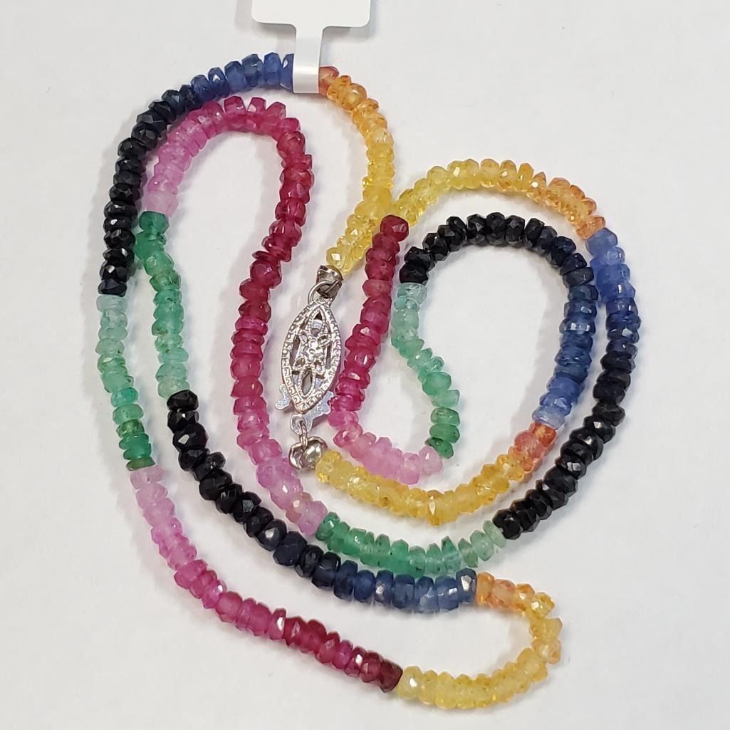 10K White Gold Blue And Yellow Sapphires, Rubies And Emeralds(36ct) 220 Gemstones, With A Filigree Fish Hook Clasp Necklace (~length 16 inches) (~weight 7.45g), Appraised Retail $2000