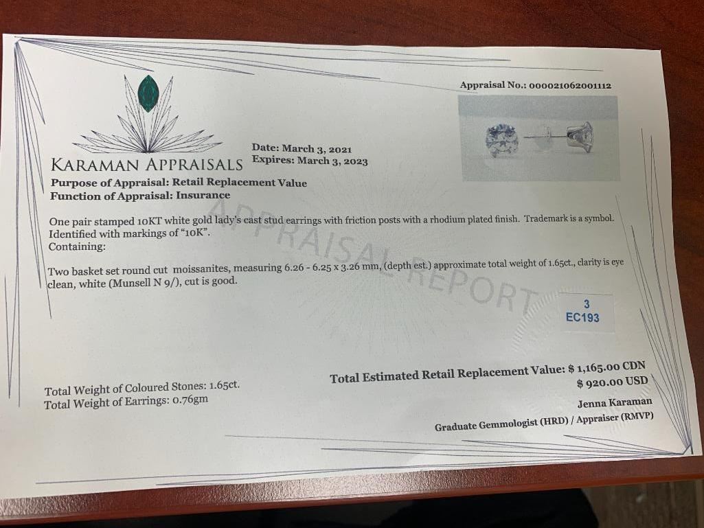10K White Gold Moissanite(1.65ct) Earrings (~weight 0.76g), Made in Canada, Appraised Retail $1165