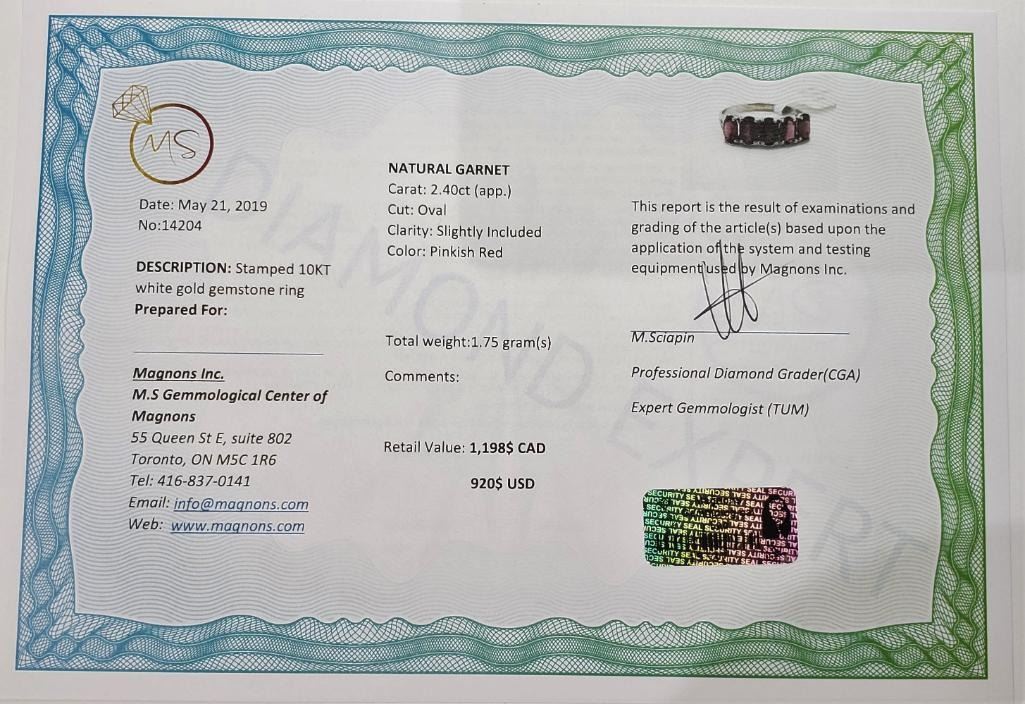10K White Gold Natural Garnet Ring (~Size 6.25) (~weight 1.75g), Made in Canada, Appraised Retail $1198