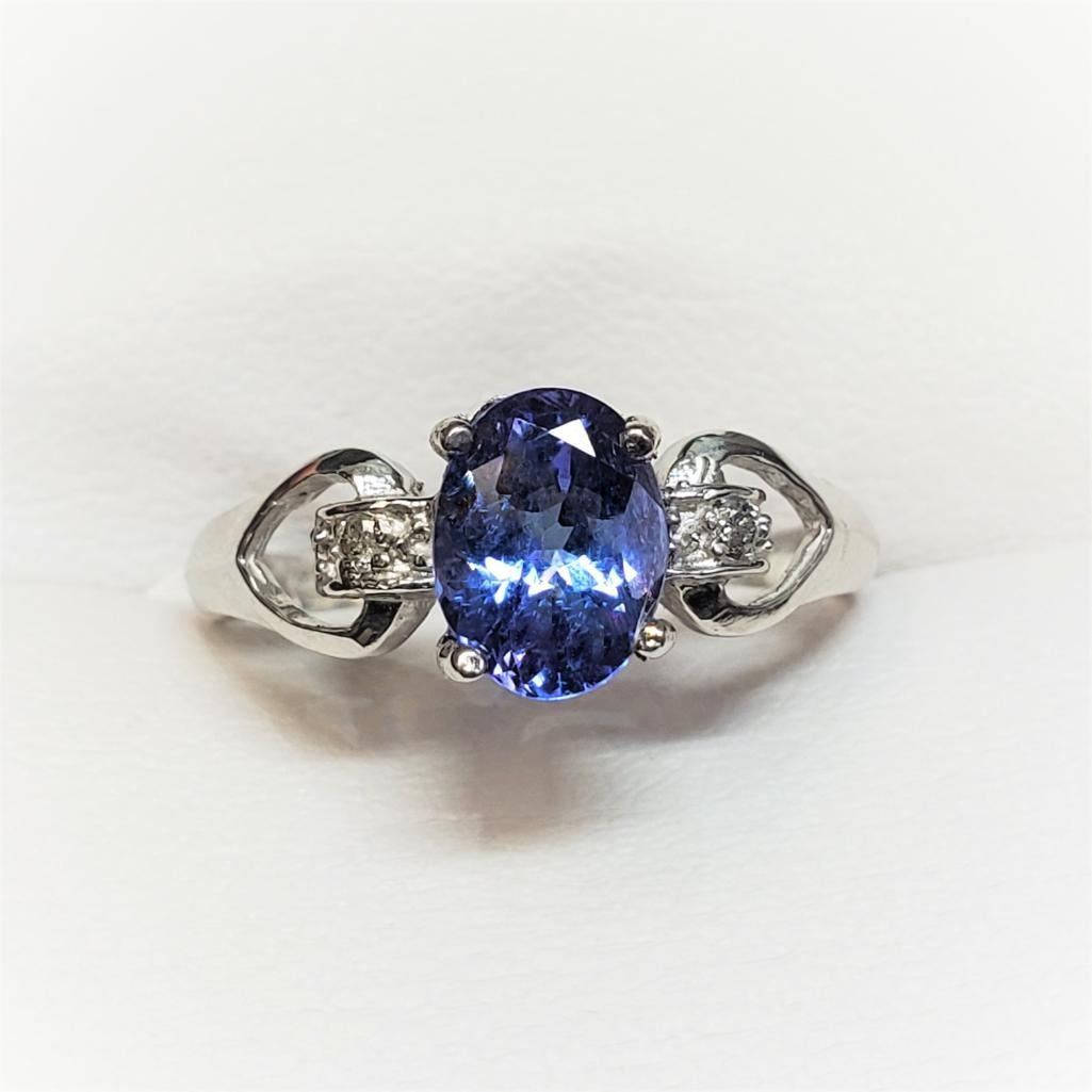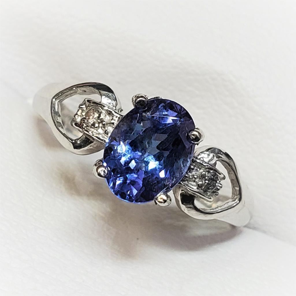 10K White Gold Tanzanite(1.3ct) Diamond(0.03ct) Claw Setting,1 Oval Mix Cut Tanzanite, 2 Diamond(Si1,G-H) Ring (~Size 7.25)(Ring is resizable for $40) (~weight 2.2g), Made in Canada, Appraised Retail $2800 (Estimated Selling Price from $300 to $600)