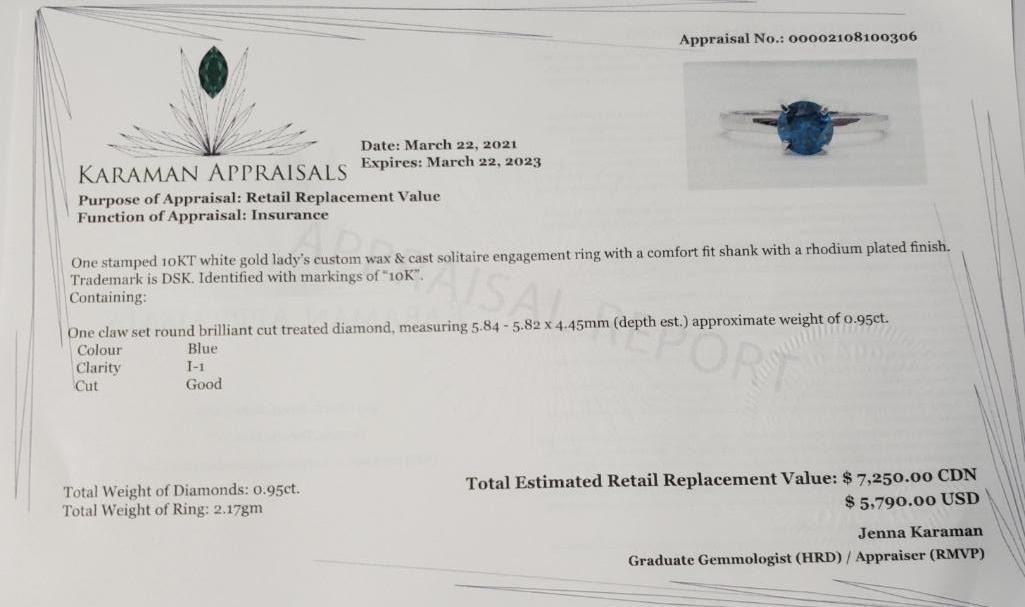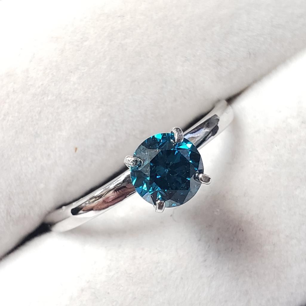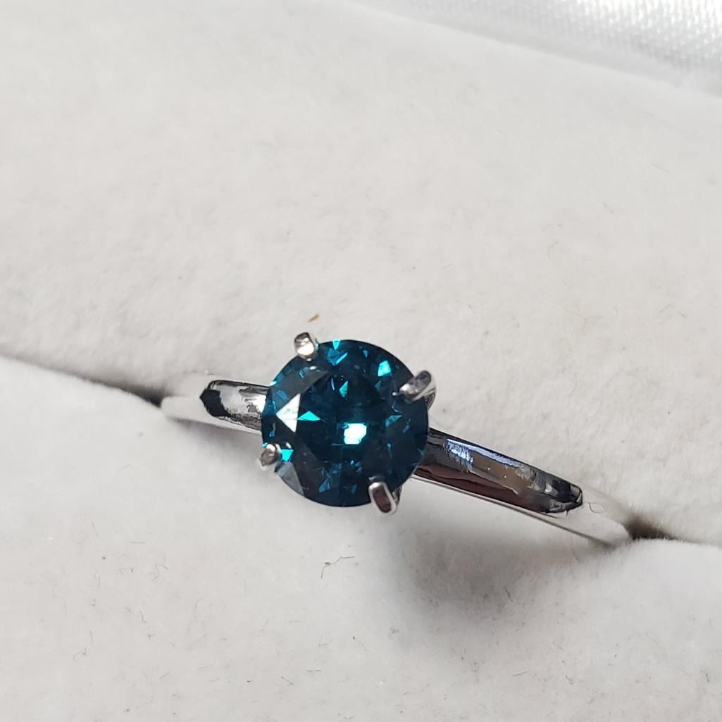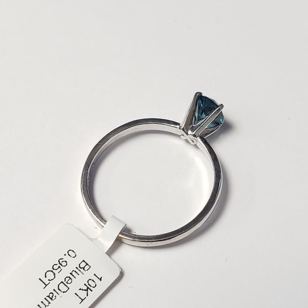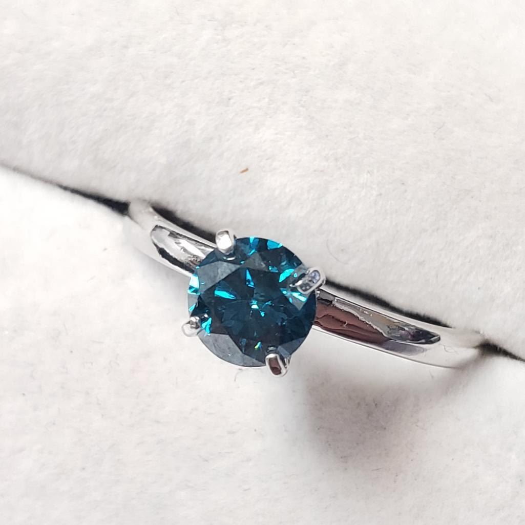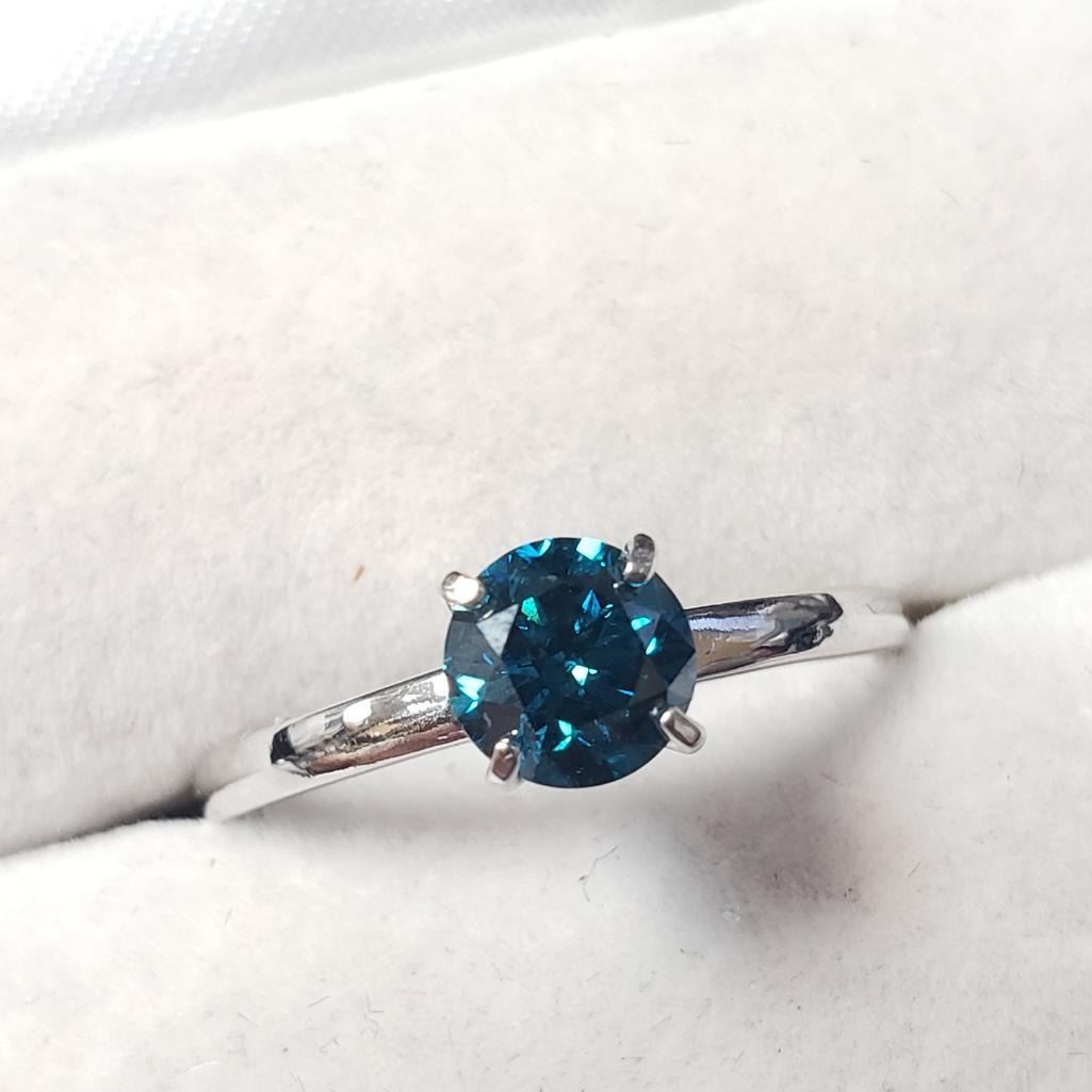10K White Gold Treated Blue Diamond (0.95Ct,I1) Ring (~Size 8.5)(Ring is resizable for $40) (~length inches) (~weight 2.17g), Made in Canada, Appraised Retail $7250
