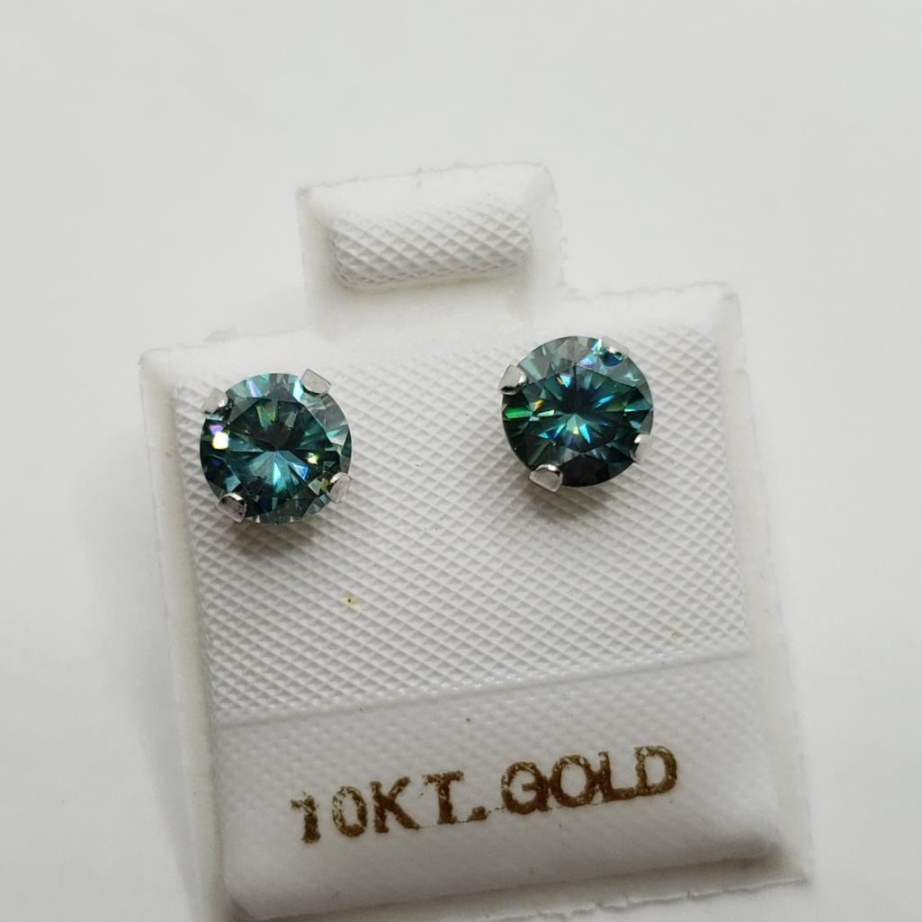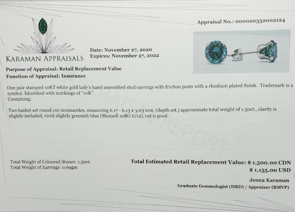 10K White Gold Vivid Greenish Blue Moissanite(1.5ct) Earrings (~Size )(Ring is resizable for $40) (~length inches) (~weight 0.69g), Made in Canada, Appraised Retail $1500.00