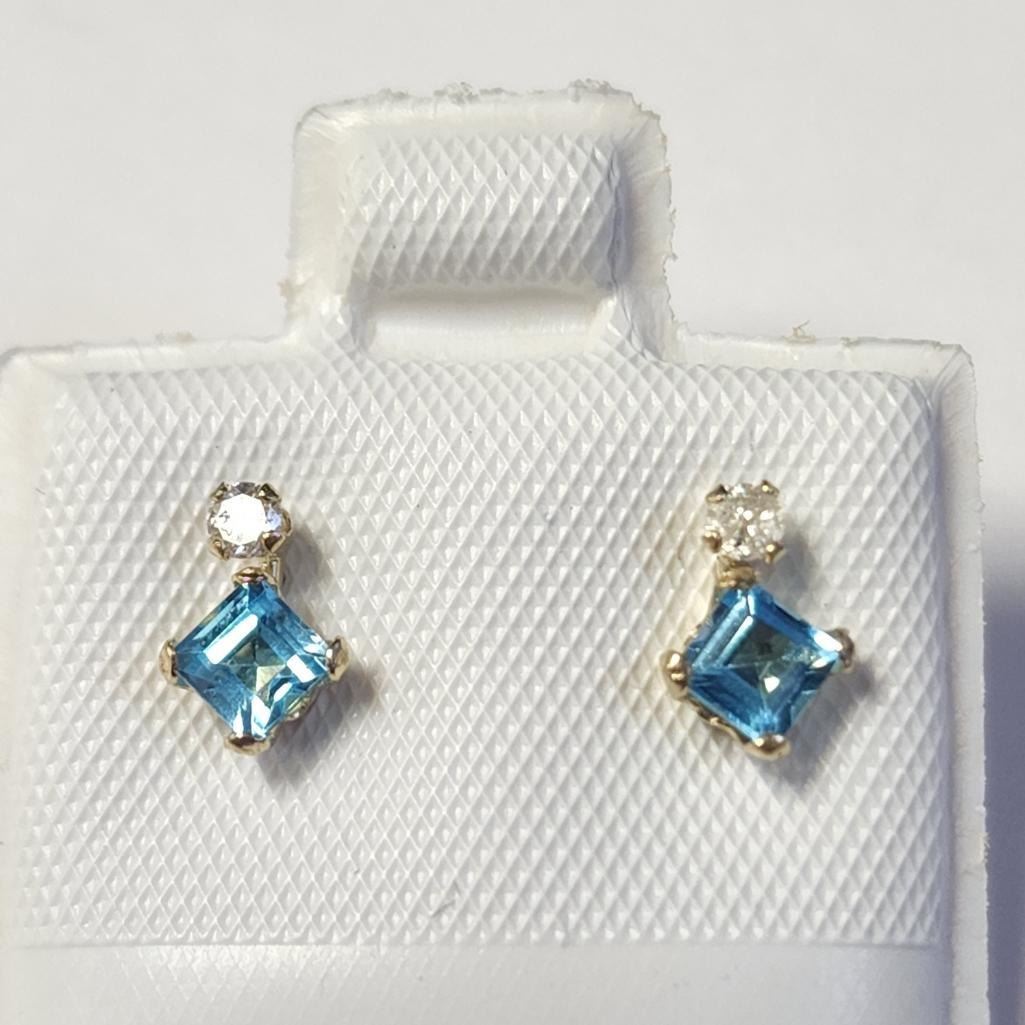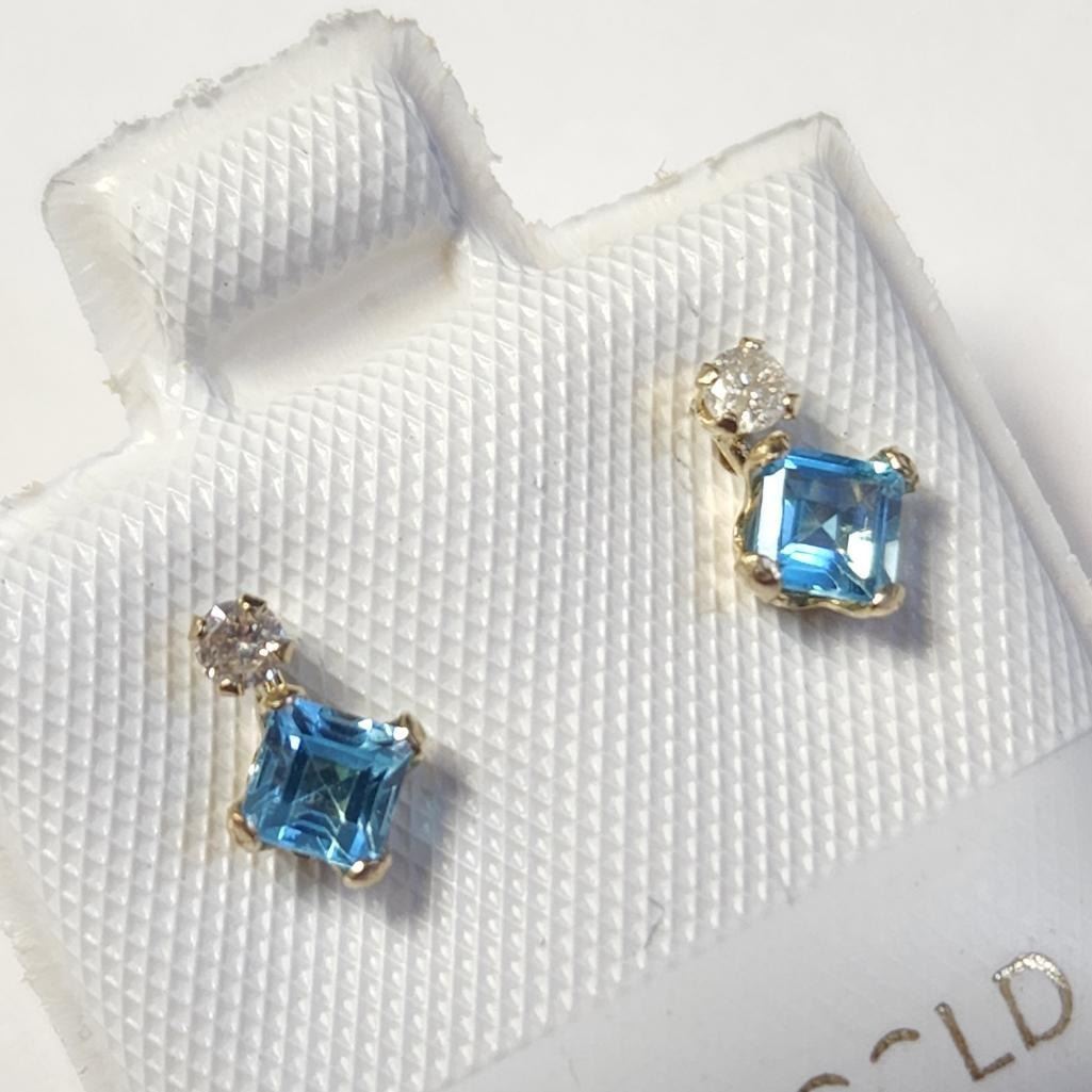 10K Yellow Gold Blue Topaz(0.44ct) Diamond(0.06ct) Earrings (~Size )(Ring is resizable for $40) (~length inches), Made in Canada, Suggested Retail Value $500