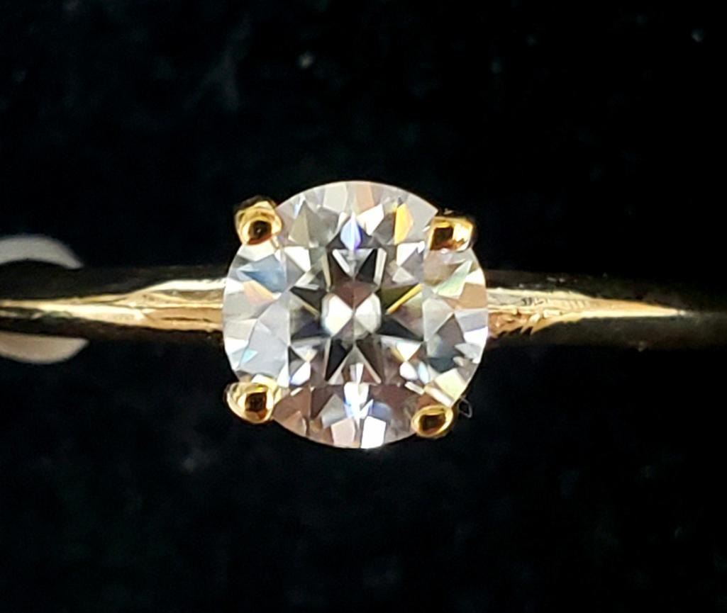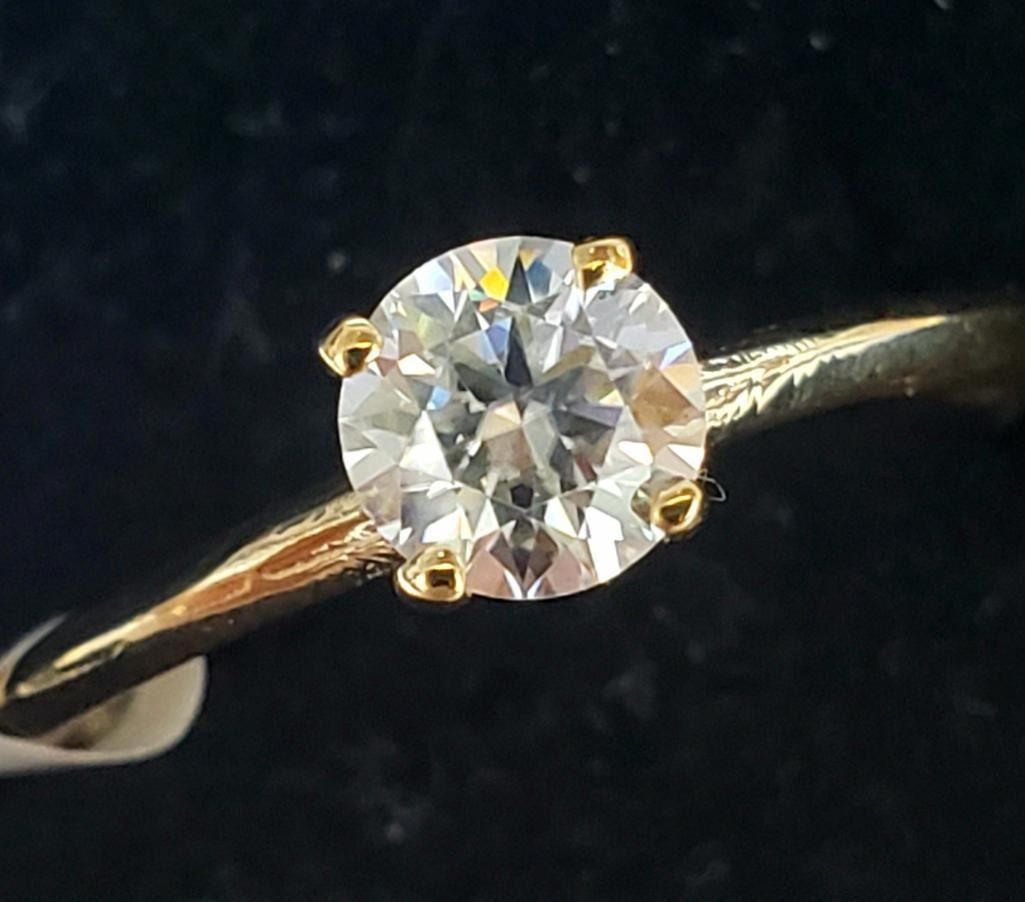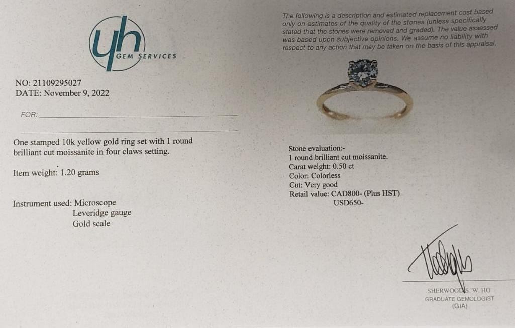 10K Yellow Gold Moissanite(0.5ct) Ring (~Size 6.5) (~weight 1.2g), Made in Canada, Appraised Retail $800