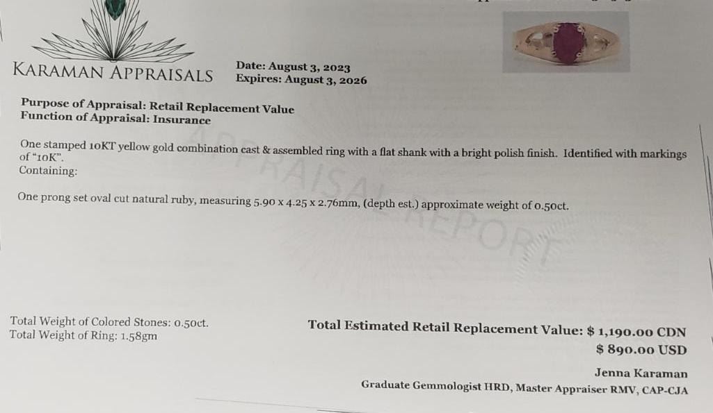 10K Yellow Gold Ruby(0.5ct) Ring (~Size 4.75)(Ring is resizable for $40) (~weight 1.58g), Made in Canada, Appraised Retail $1190