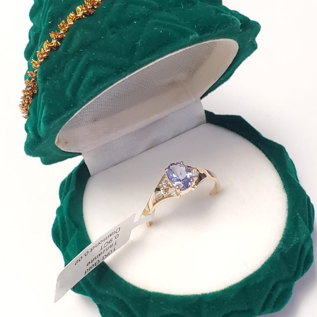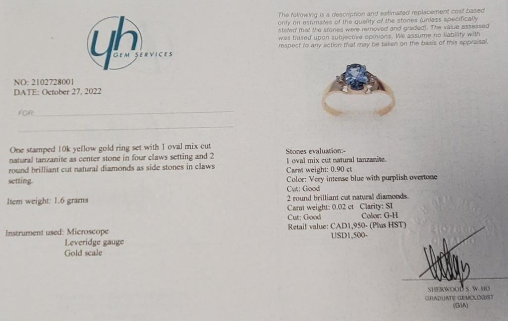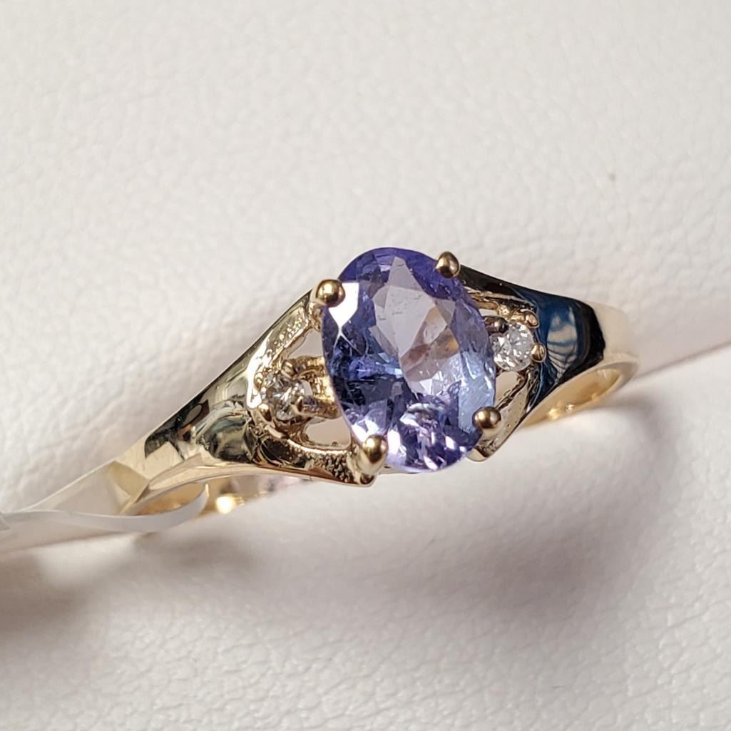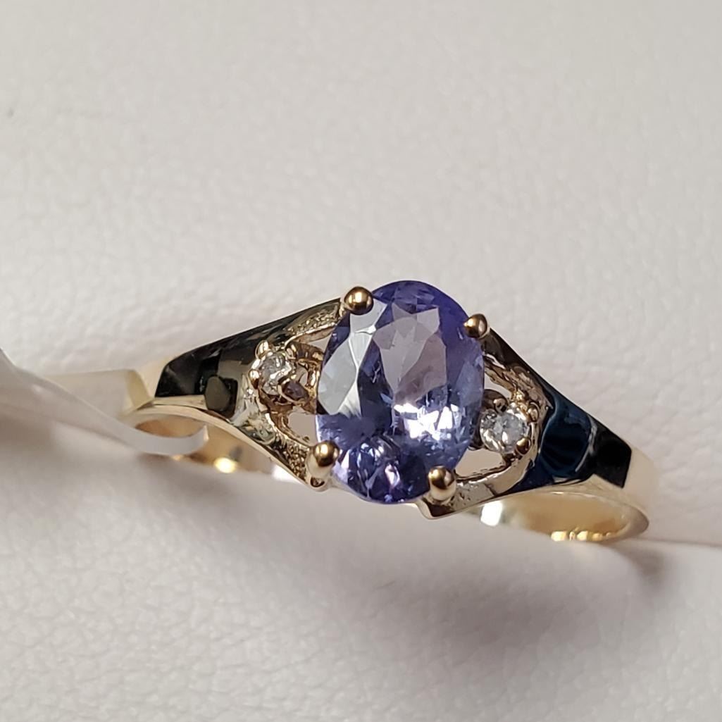 10K Yellow Gold Tanzanite(0.9ct) Diamond(0.02ct) Ring (~Size 7.5)(~weight 1.6g), Made in Canada, Appraised Retail $1950