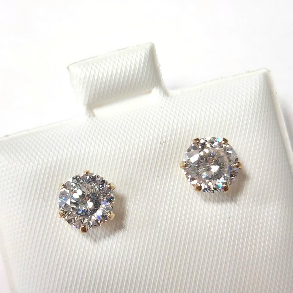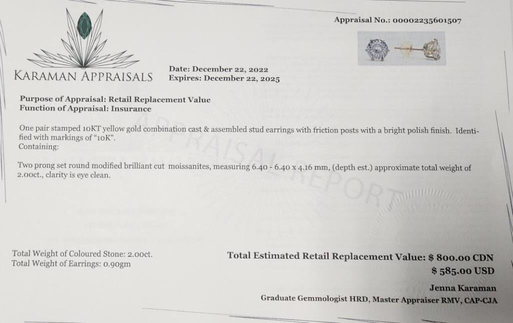 10K Yellow Gold White Moissanite Test Like Diamond Looks Better(2ct) Earrings (~weight 0.9g), Made in Canada, Appraised Retail $800