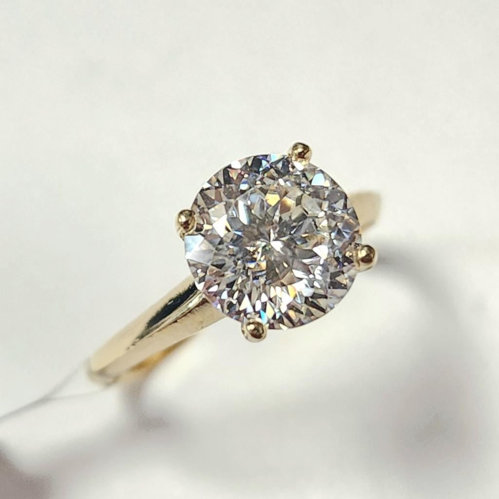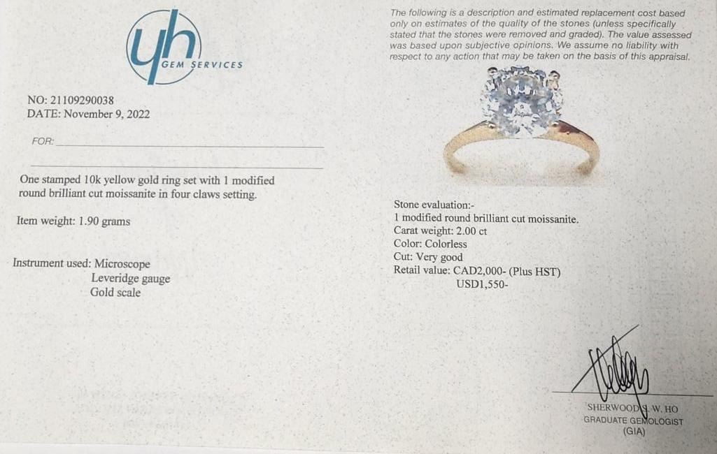10K Yellow Gold White Moissanite Test Like Diamond Looks Better(2ct) Ring (~Size 5.5) (~weight 1.9g), Made in Canada, Appraised Retail $2000