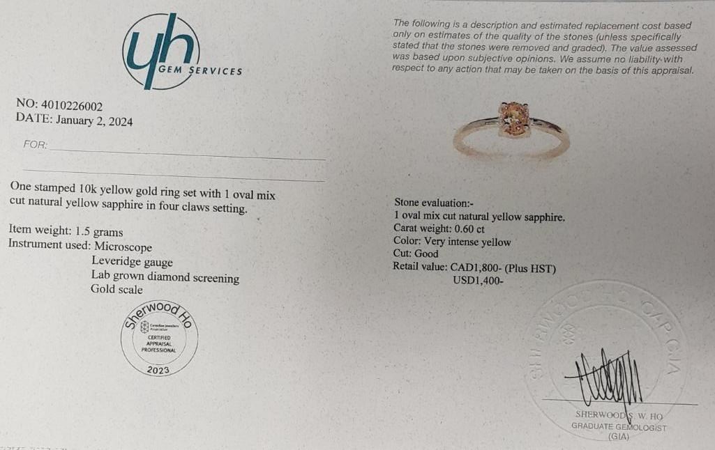 10K Yellow Gold Yellow Sapphire(0.6ct) Ring (~Size 7) (~weight 1800g), Made in Canada, Appraised Retail $1800