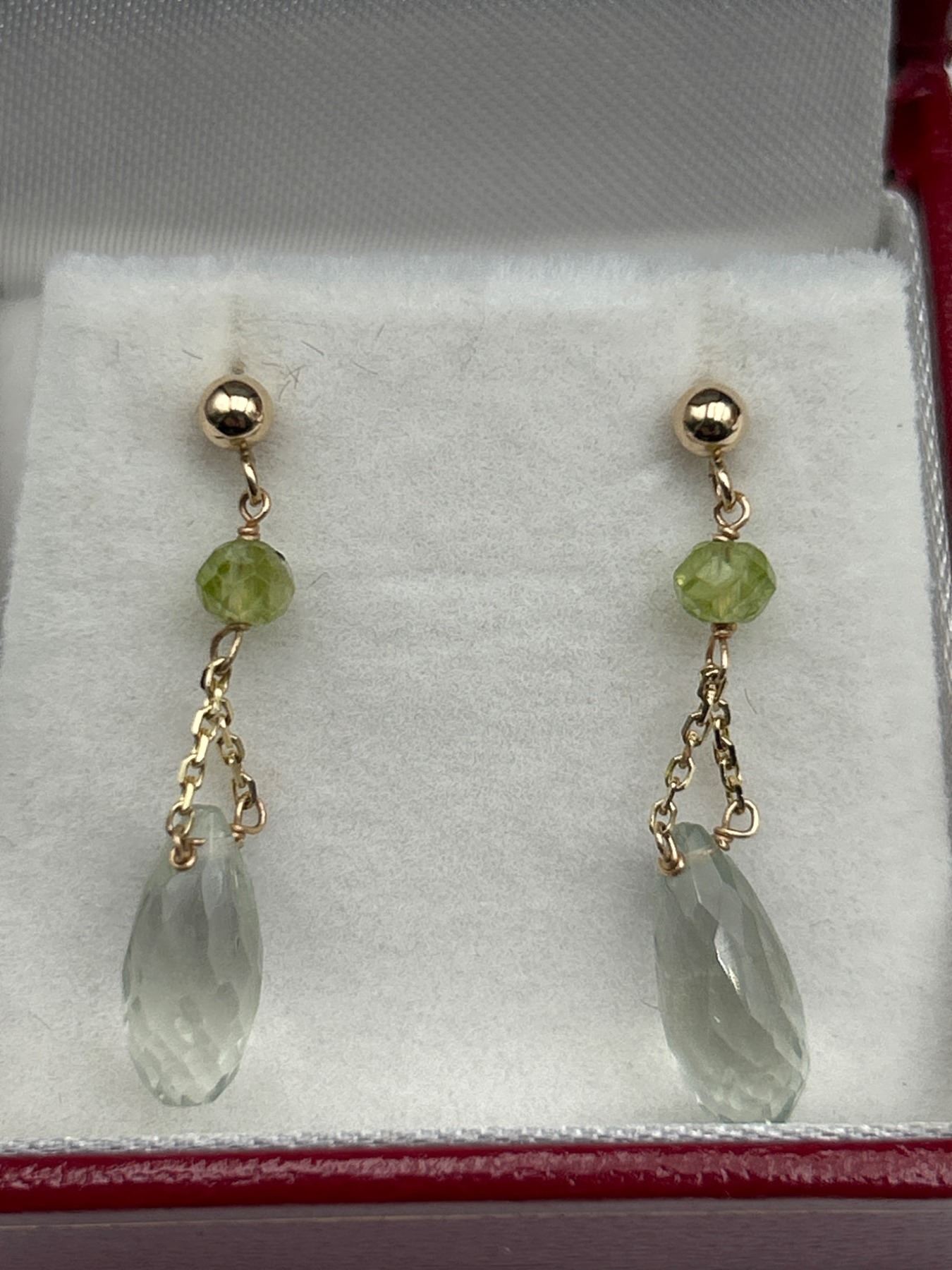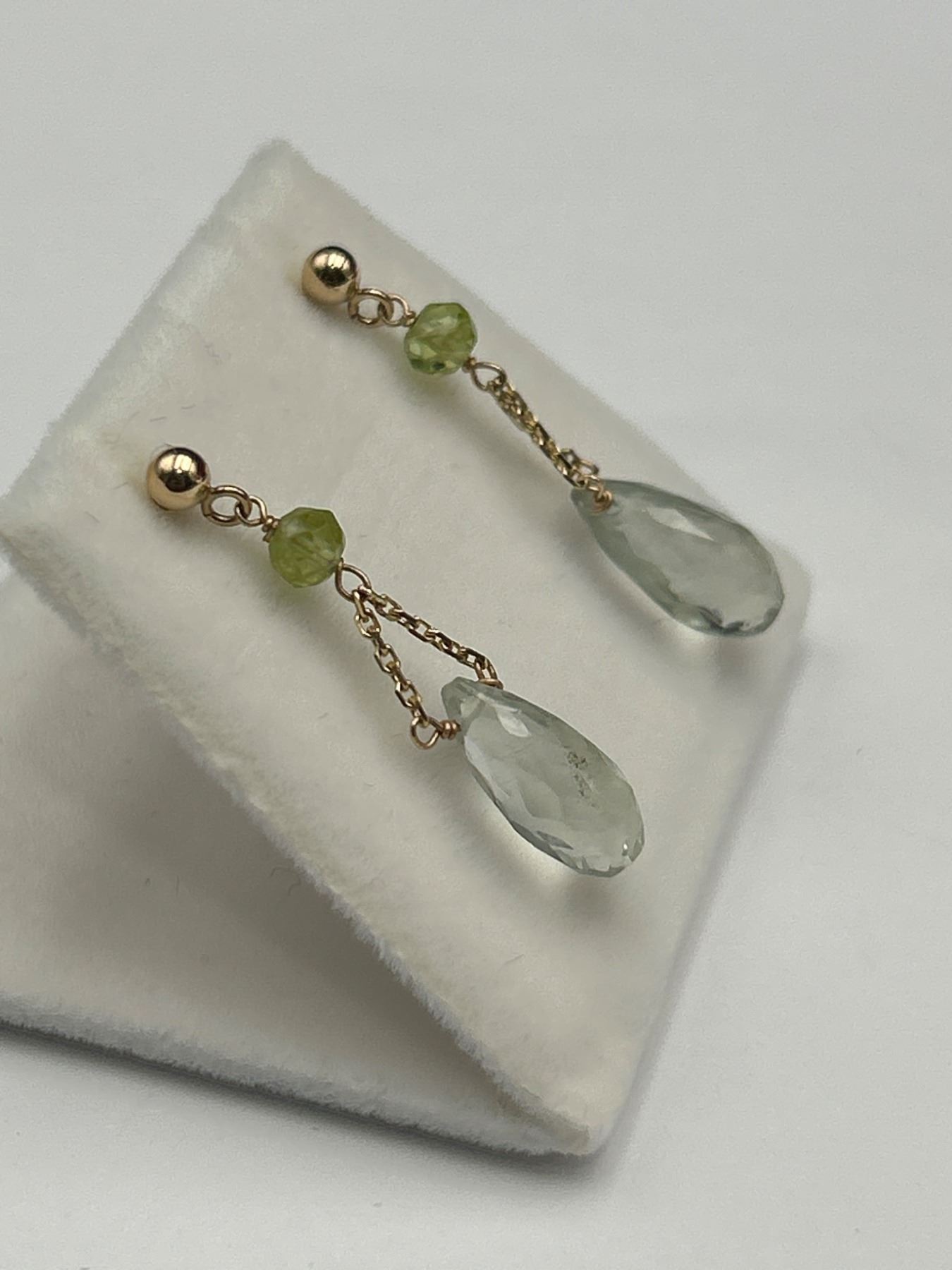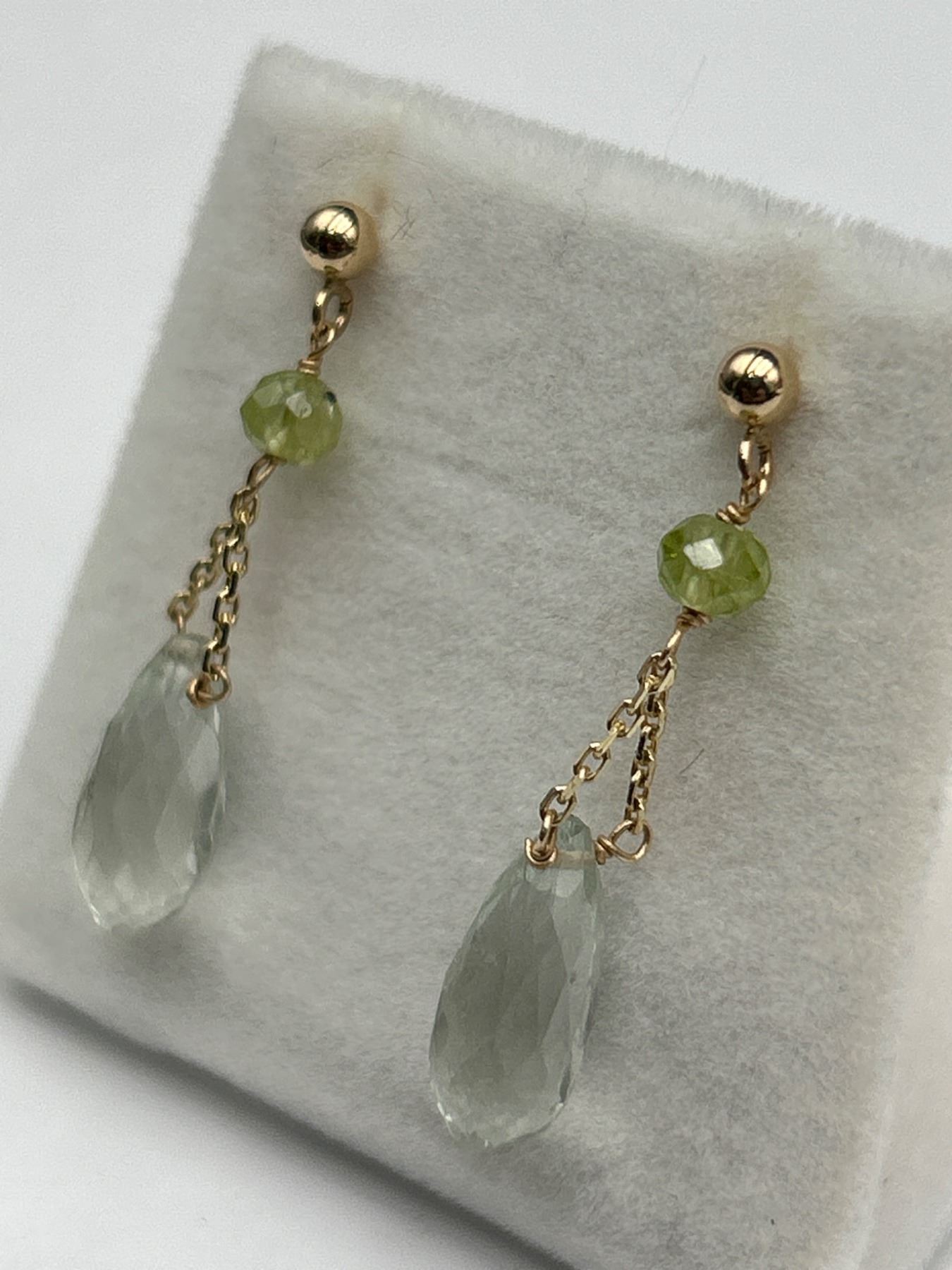 Dangle earrings in 14K yellow gold featuring faceted prasiolite and peridot stones. Each earring has a polished gold post style and drop design with a single peridot bead and pear-shaped prasiolite on a delicate gold chain. 1.39 gram total weight.