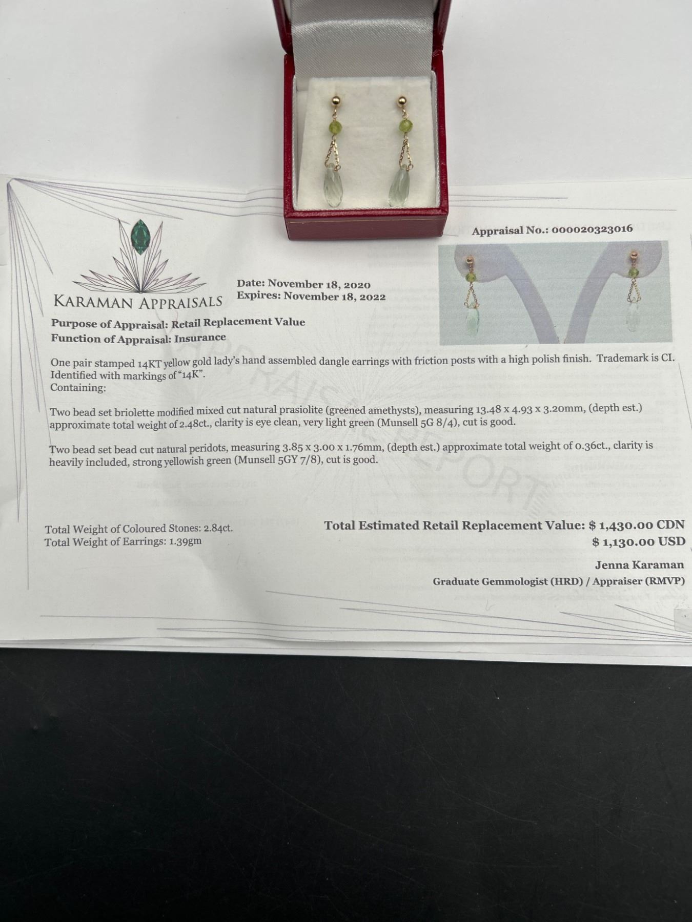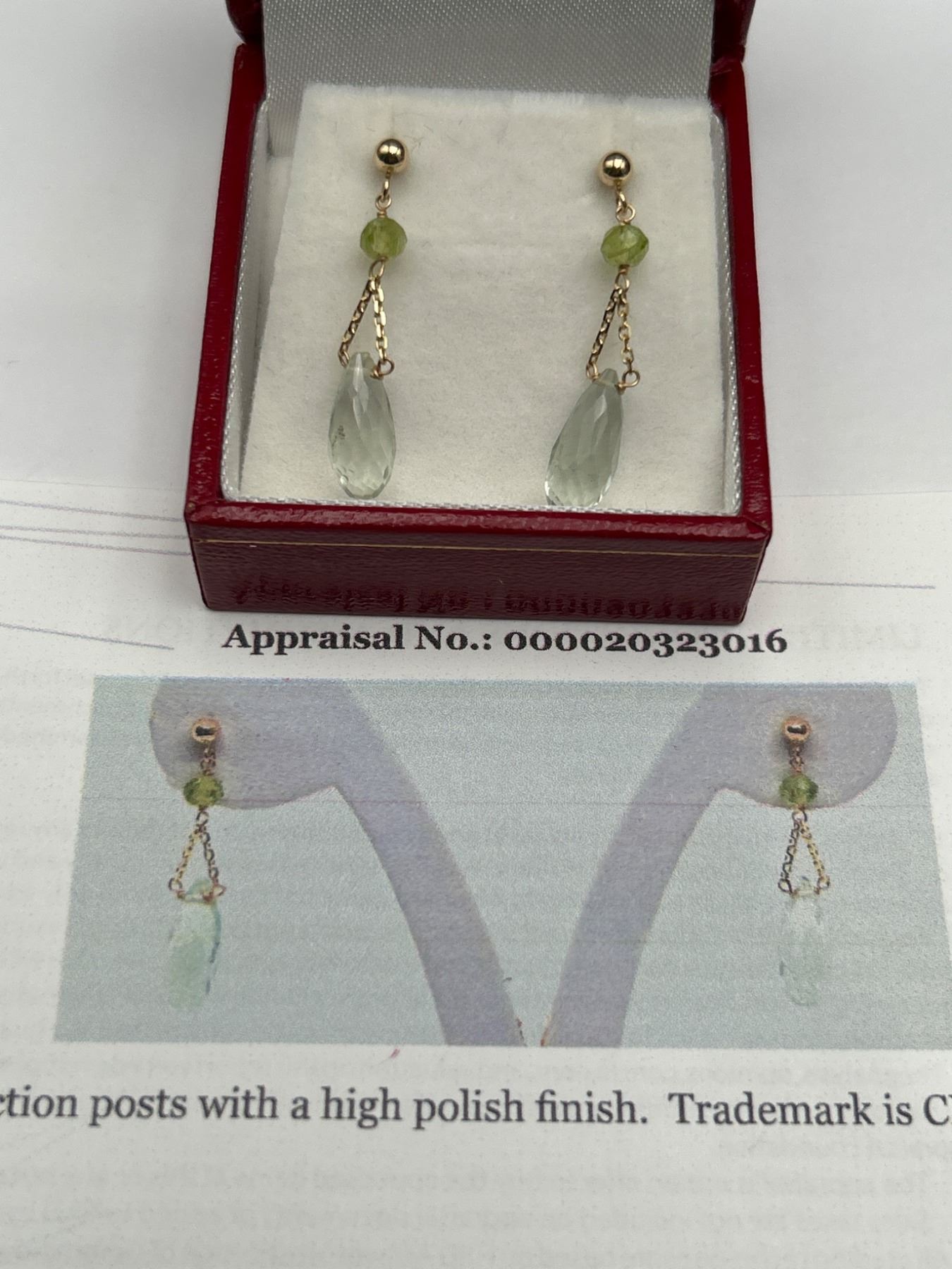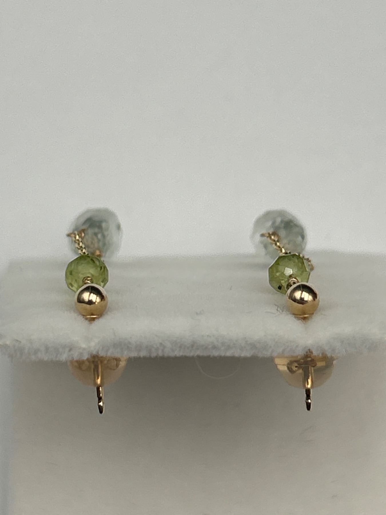 Dangle earrings in 14K yellow gold featuring faceted prasiolite and peridot stones. Each earring has a polished gold post style and drop design with a single peridot bead and pear-shaped prasiolite on a delicate gold chain. 1.39 gram total weight.
