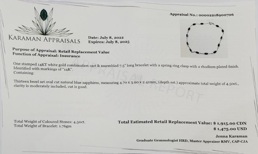 14K White Gold 13 Natural Blue Sapphire(4.5ct) Bracelet ) (~weight 1.76g), Made in Canada, Appraised Retail $1915