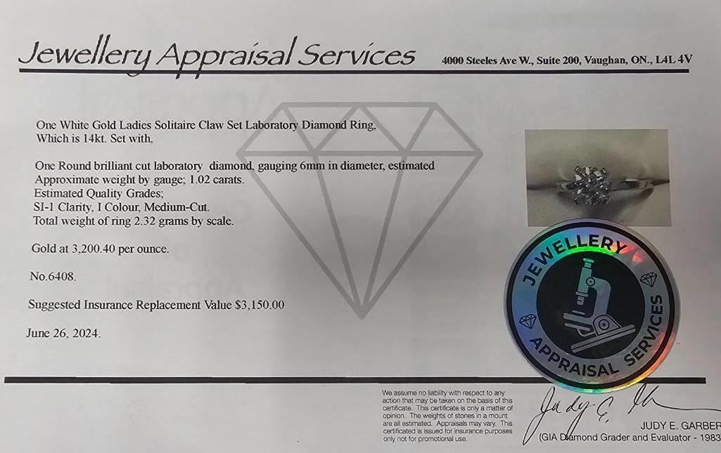 14K White Gold 2.32G Lab Diamond 1.02Ct Ring (~Size 6)(Ring is resizable for $40), Made in Canada, Appraised Retail $3150