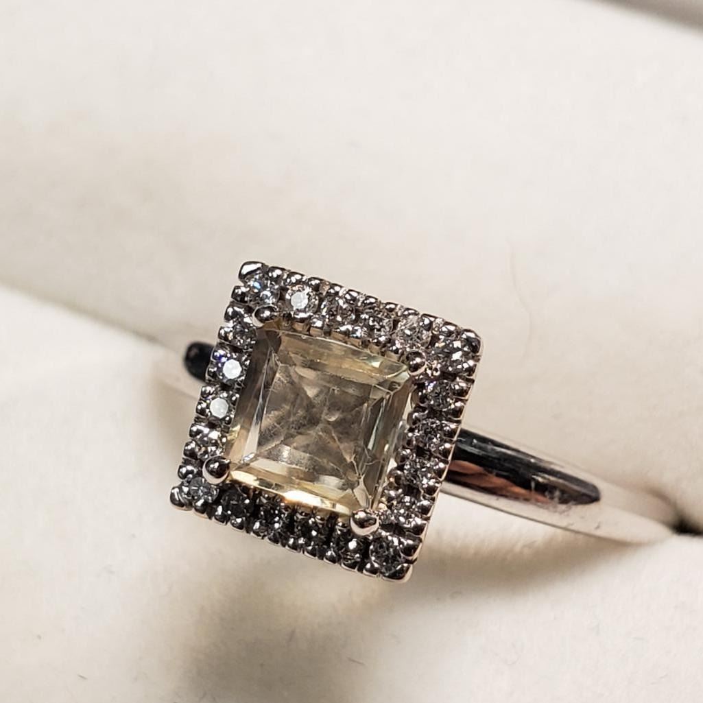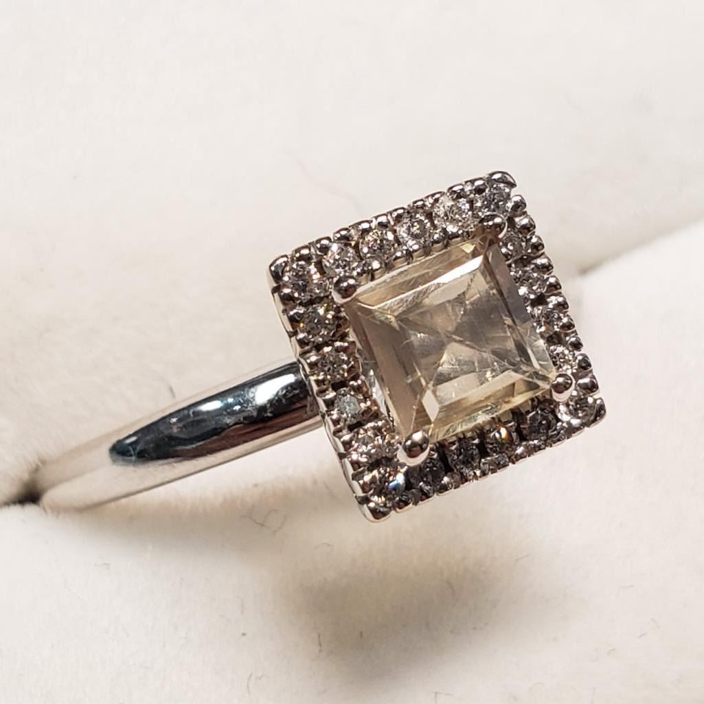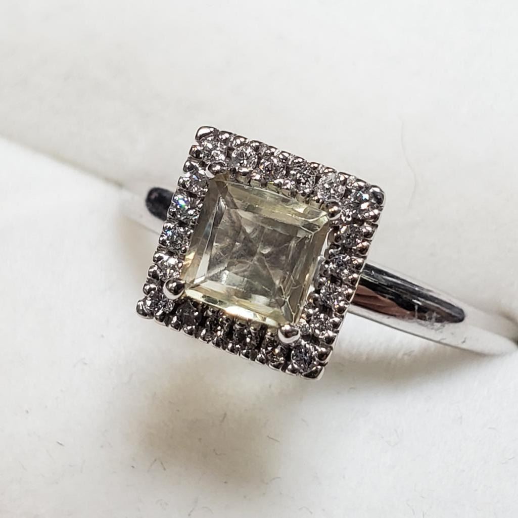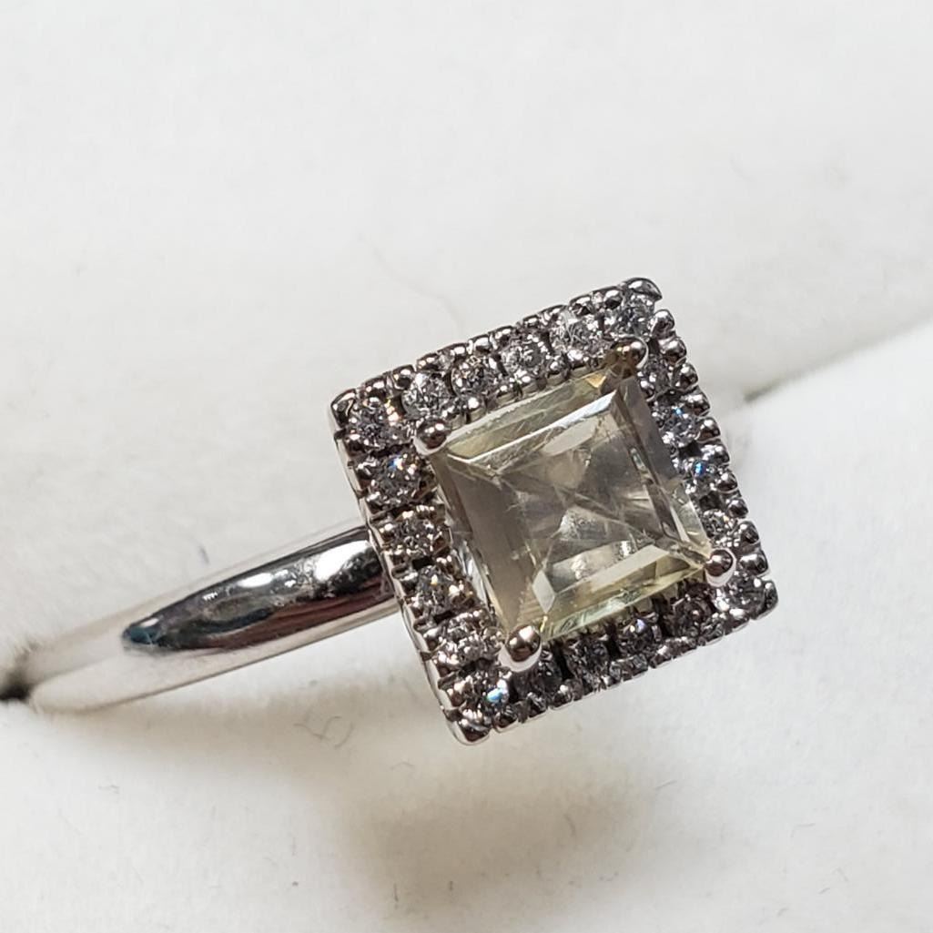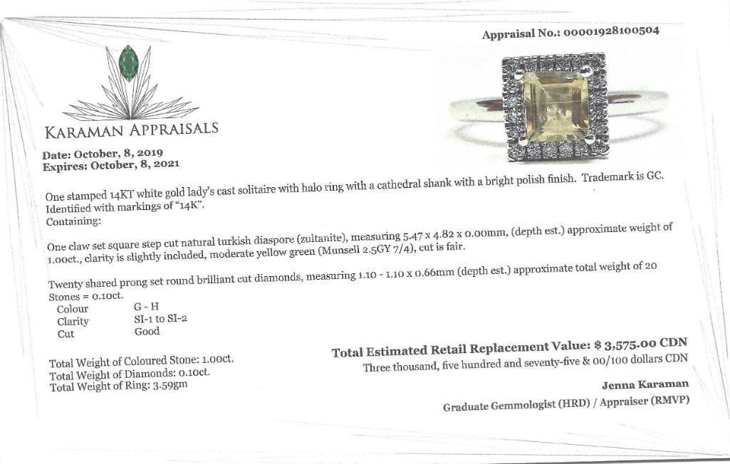 14K White Gold Amazing Rare Color Changing Sultanite (Turkish Diaspore)(1ct) Diamond(0.1ct) Ring (~Size 7) (~weight 3.59g), Made in Canada, Appraised Retail $3575 (Estimated Selling Price from $510 to $1020) The name Diaspore comes for the Greek word �diaspora� meaning to scatter. It was called this because of the way the gemstone seemed to scatter the light and sparkle. Diaspore has a unique color changing ability. It is one of the few color change gemstones in the world along with Sapphires, Garnets and Alexandrite. Diaspore is generally a yellowish green color in fluorescent light and it changes to a reddish pink color in incandescent light. The gem can also look in both colors at the same time depending upon what type of light is hitting it.