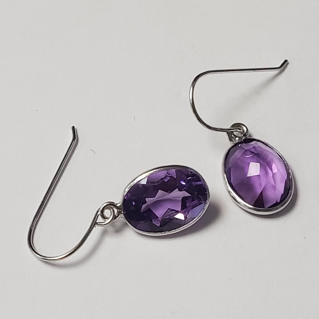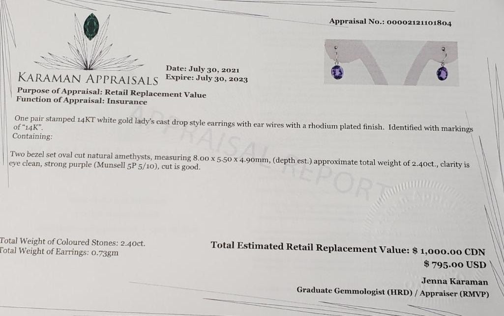 14K White Gold Amethyst(2.4ct) Earrings (~Size )(Ring is resizable for $40) (~length inches) (~weight 2.04g), Made in Canada, Appraised Retail $1000