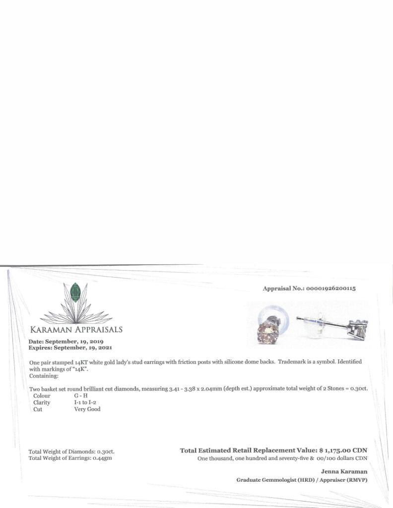 14K White Gold Diamond(0.3ct) Earrings, Suggested Retail Value $1000 (Estimated Selling Price from $150 to $300)