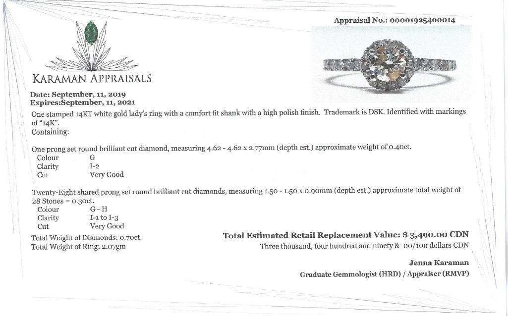 14K White Gold Diamond (0.40Ct,I-2,G) Diamond (0.30Ct,I1-I3,G-H) Ring (~Size 6) (~weight 2.07g), Made in Canada, Appraised Retail $3490 (Estimated Selling Price from $630 to $1260)