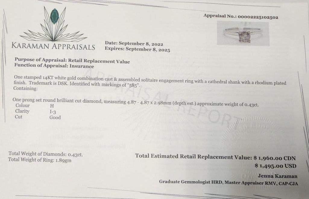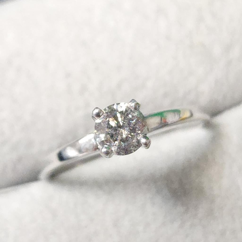 14K White Gold Diamond (0.43Ct,I3,H) Ring (~Size 6) (~weight 1.89g), Made in Canada, Appraised Retail $1960