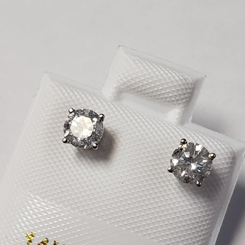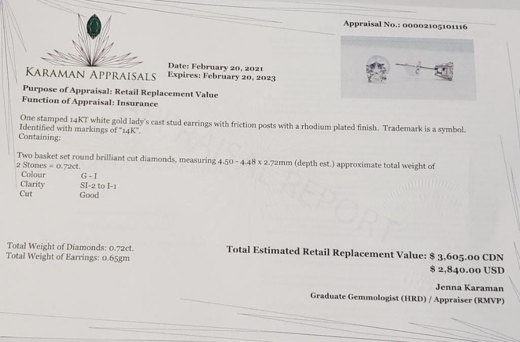 14K White Gold Diamond (0.72Ct,Si1-I1,G-I) Earrings (~Size )(Ring is resizable for $40) (~length inches) (~weight 0.65g), Made in Canada, Appraised Retail $2200