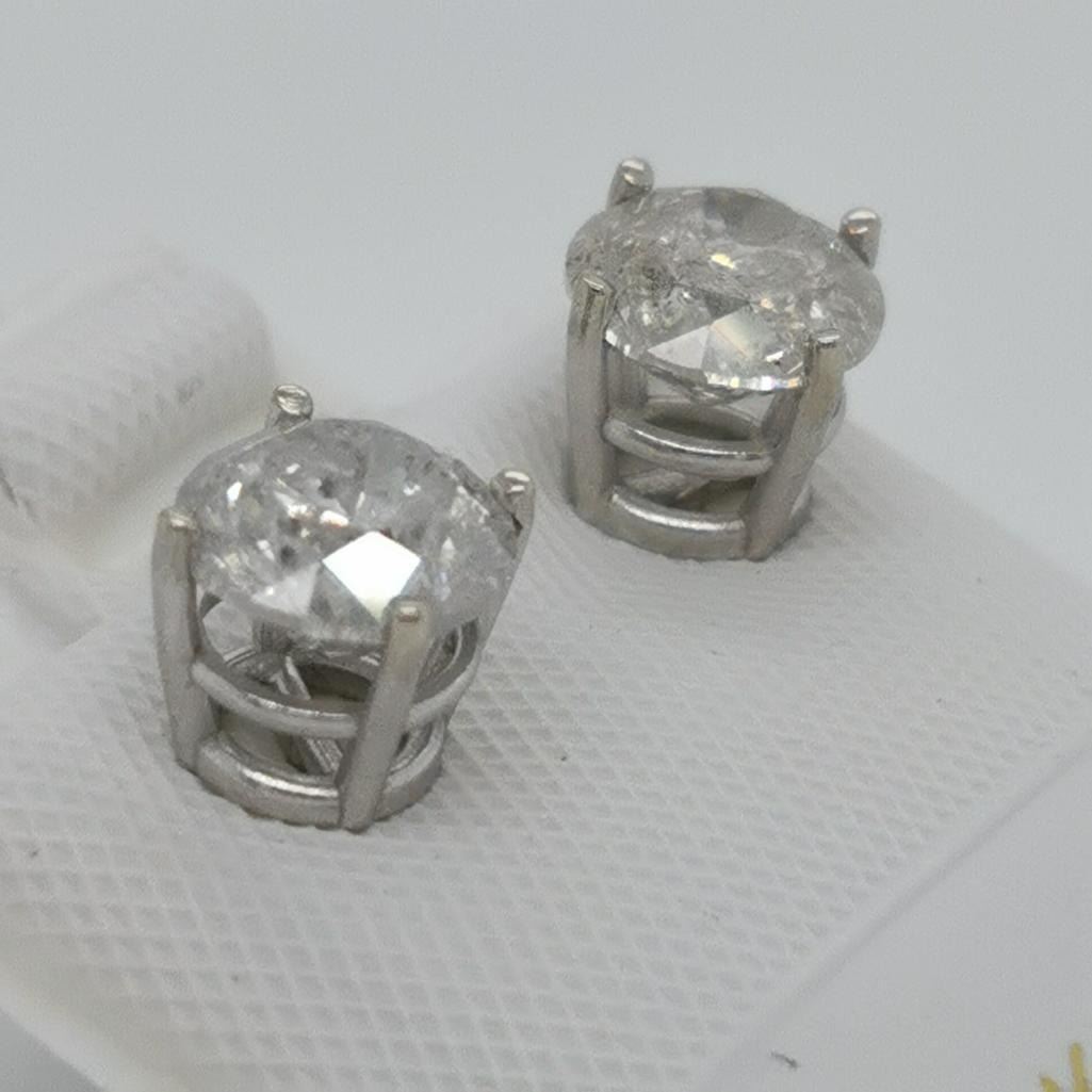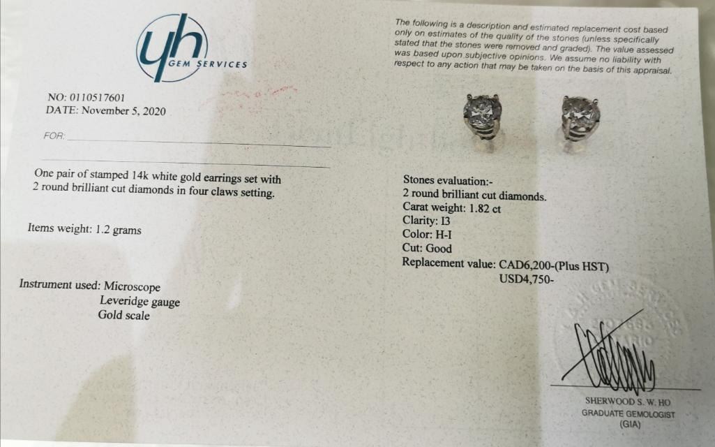 14K White Gold Diamond(1.82ct) Brilliant Cut Diamonds, I3 Clarity Earrings (~weight 1.2g), Made in Canada, Appraised Retail $6200 (Estimated Selling Price from $960 to $1920)