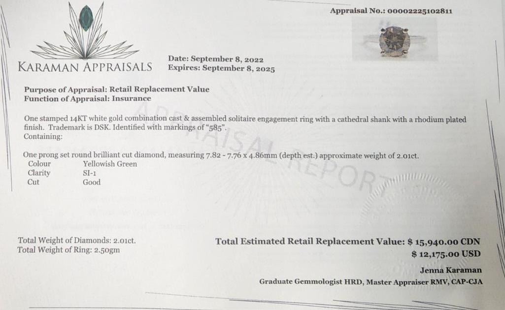 14K White Gold Diamond (2.01Ct,Si2,Yellowish Green) Ring (~Size 6) (~weight 2.5g), Made in Canada, Appraised Retail $15940