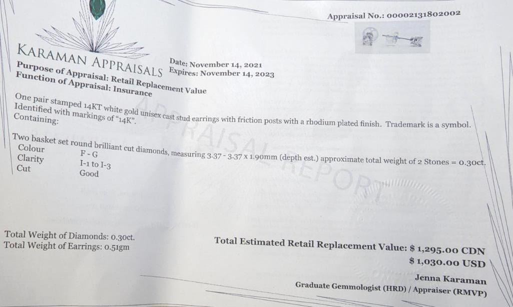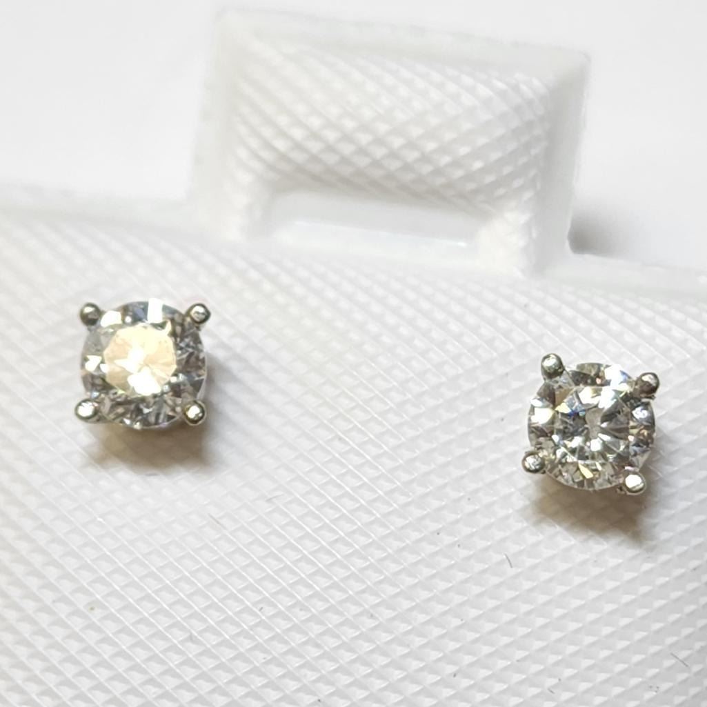 14K White Gold Diamond .30 Carat (I1, F-G) Solitaire Earrings Set Made in Canada -Appraised Value $1295.00
