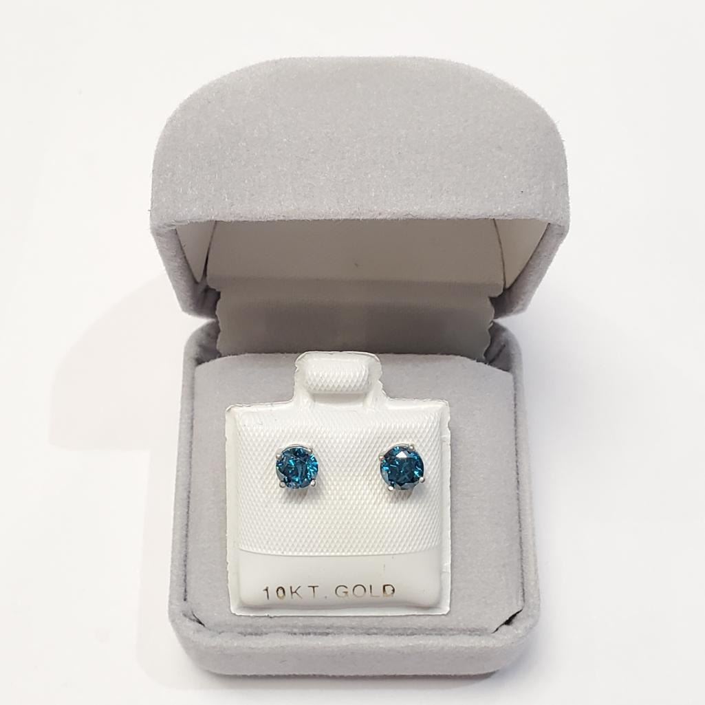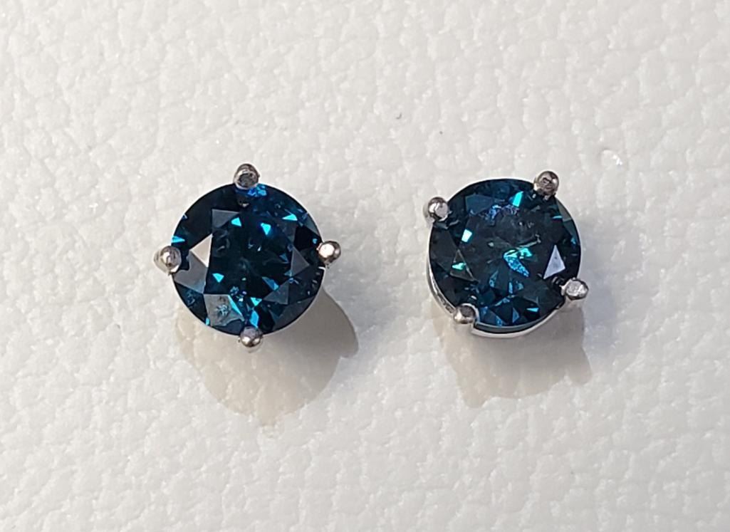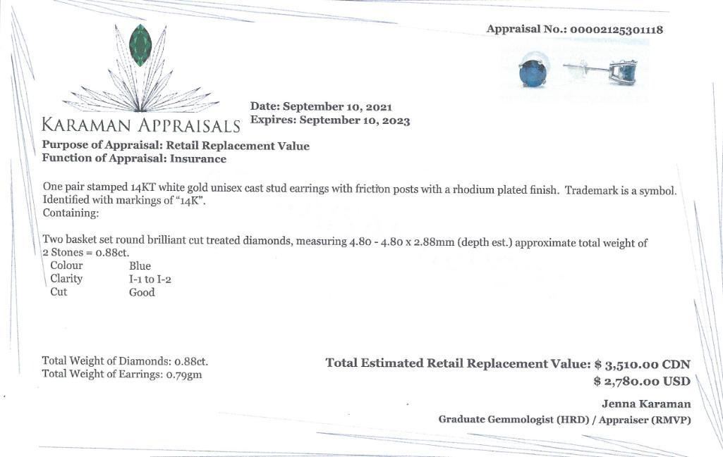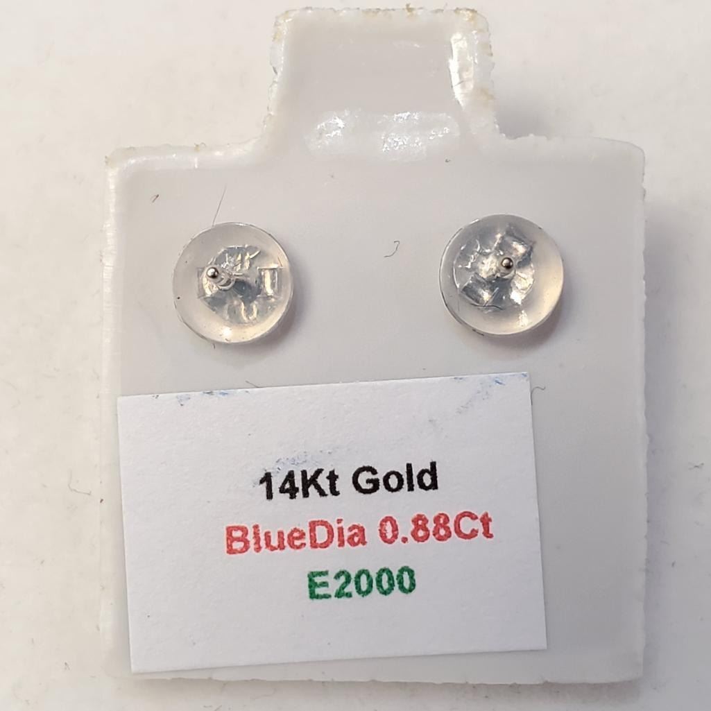14K White Gold Diamonds(0.88Ct,I1-I2,Blue) Unisex Cast Stud Earrings (~weight 0.79g), Made in Canada, Appraised Retail $3510