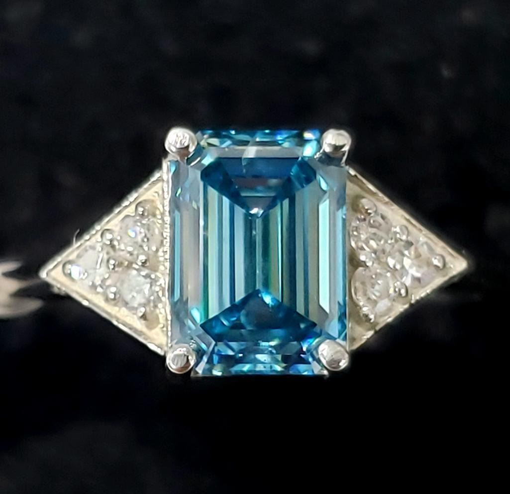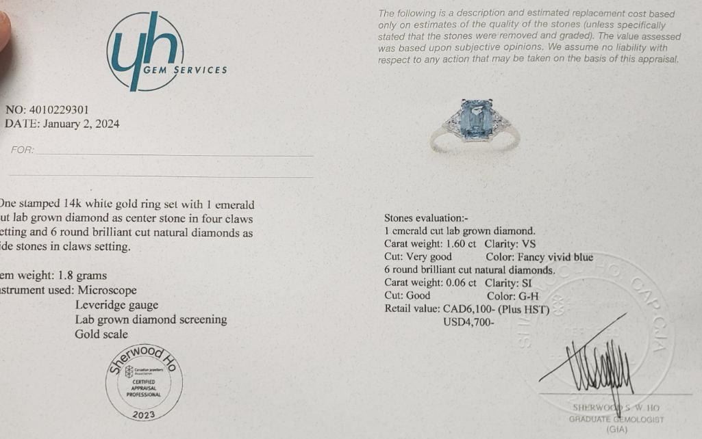 14K White Gold Lab Blue & Natural Diamond 1.6+0.06Ct Ring (~Size 6.5)(Ring is resizable for $40) (~weight 1.8g), Made in Canada, Appraised Retail $6100