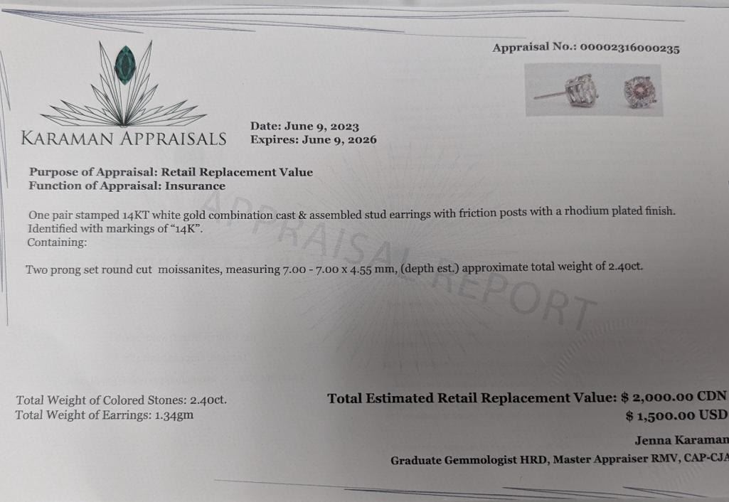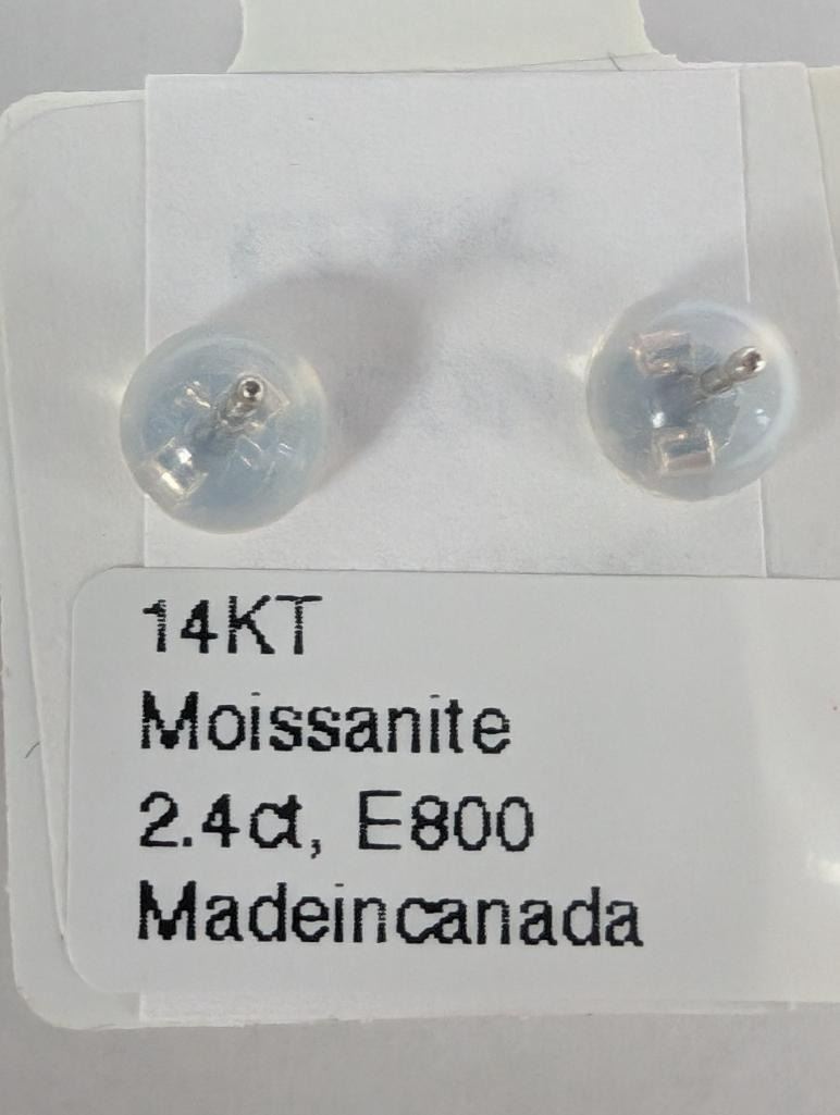 14K White Gold Moissanite 2.4Ct Laser Cut Earrings, Made in Canada, Appraised Retail $2000
