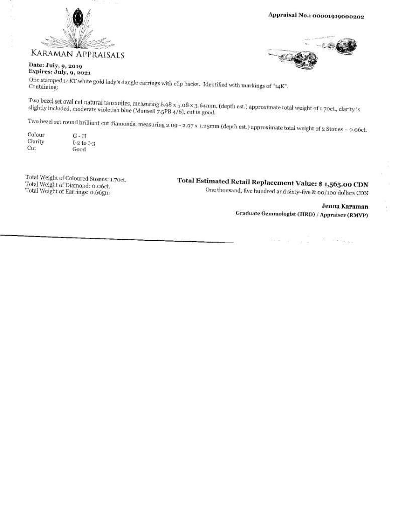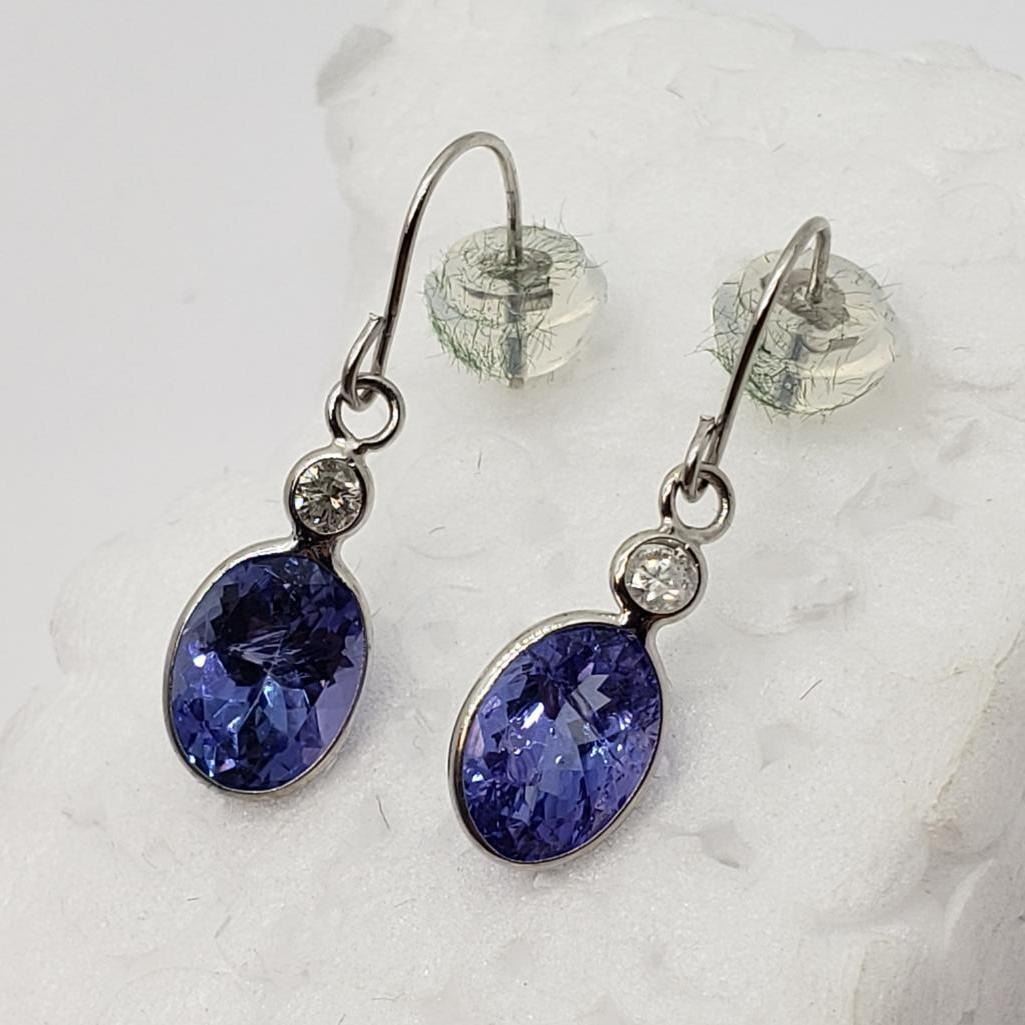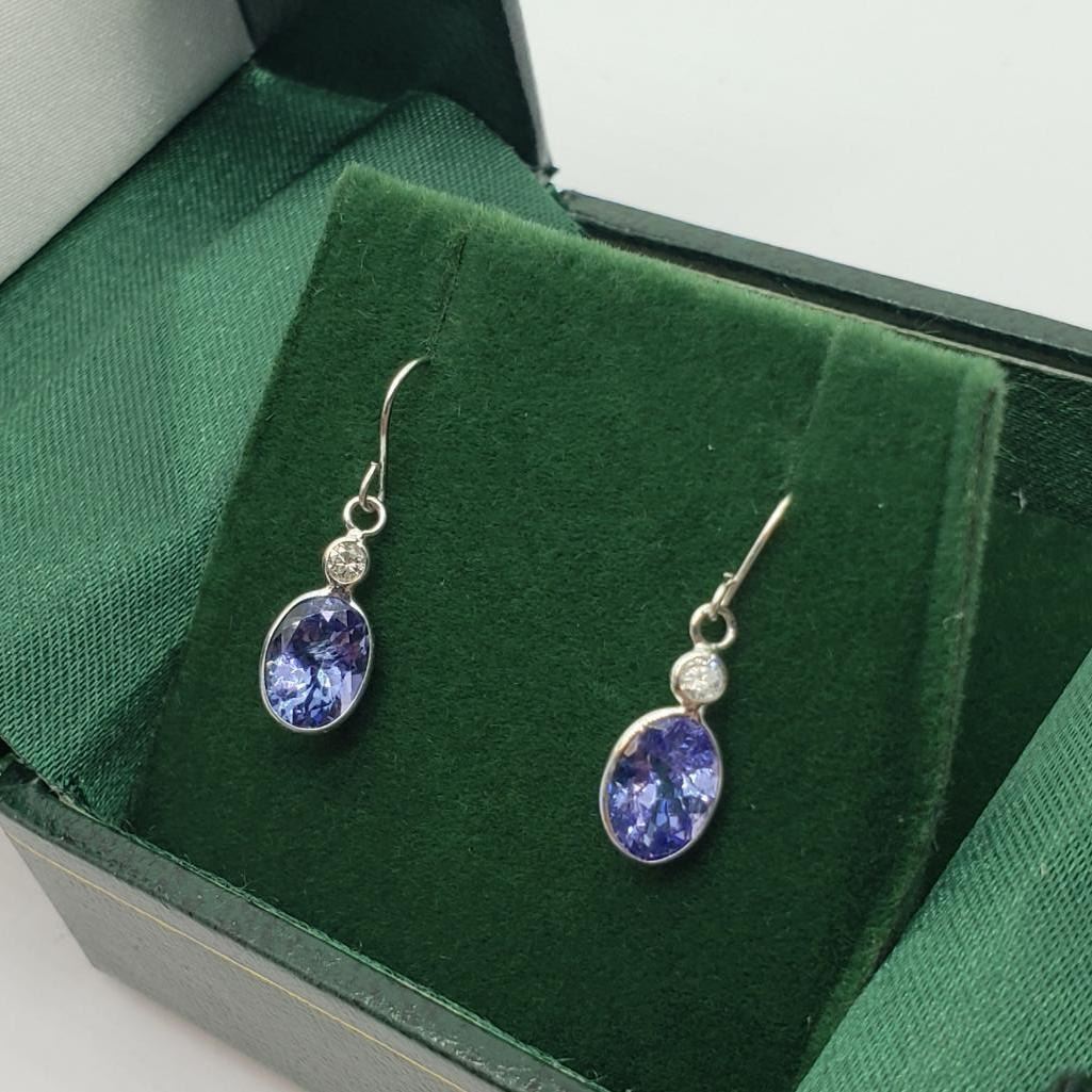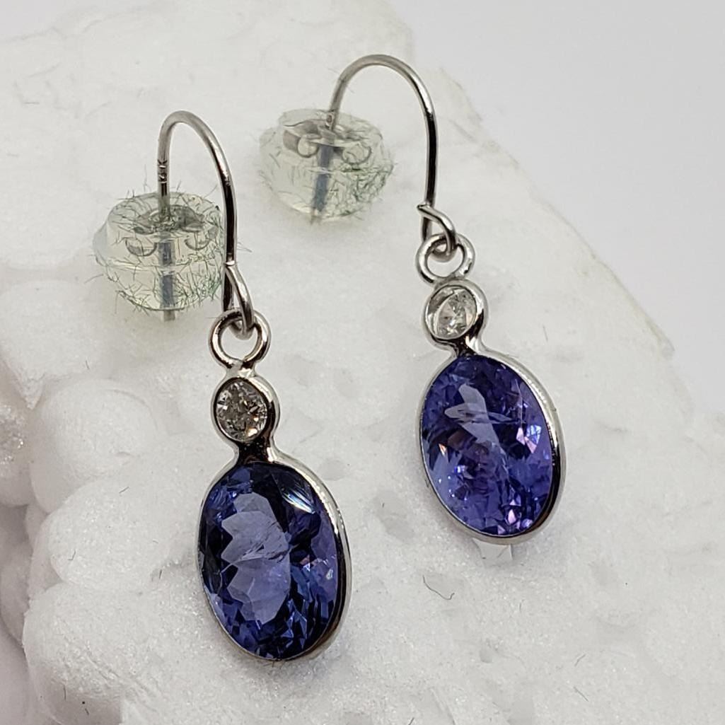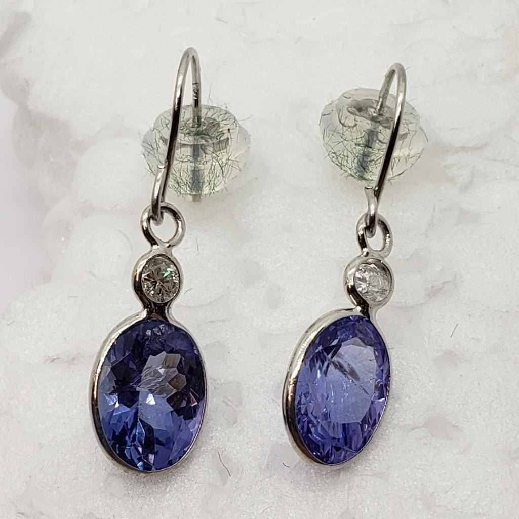 14K White Gold Tanzanite (1.7ct) Diamond (I2 - I3) (0.06ct) Dangle Earrings (~weight 0.66g), Made in Canada, Insurance Value $1565 (Estimated Selling Price from $210 to $420)