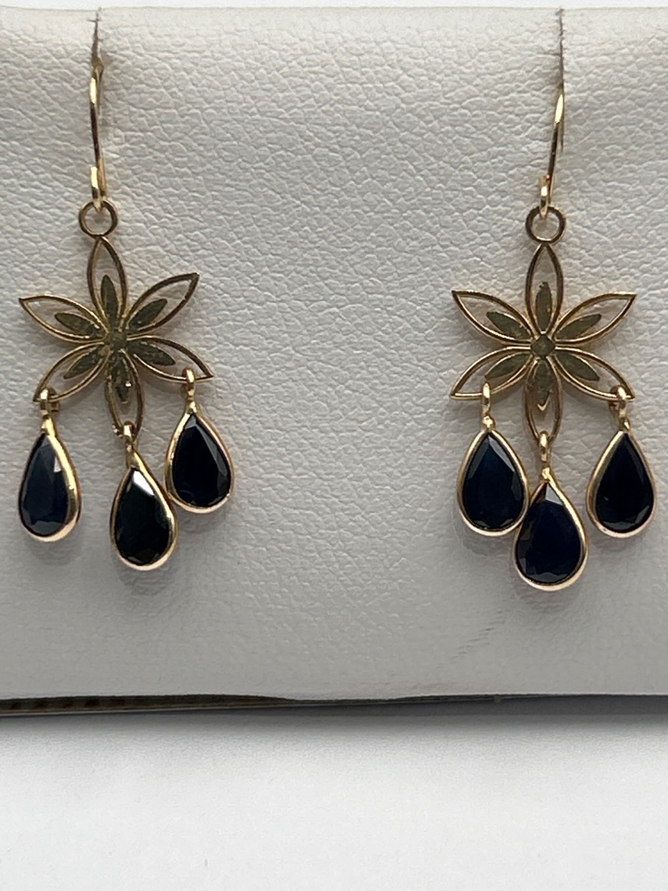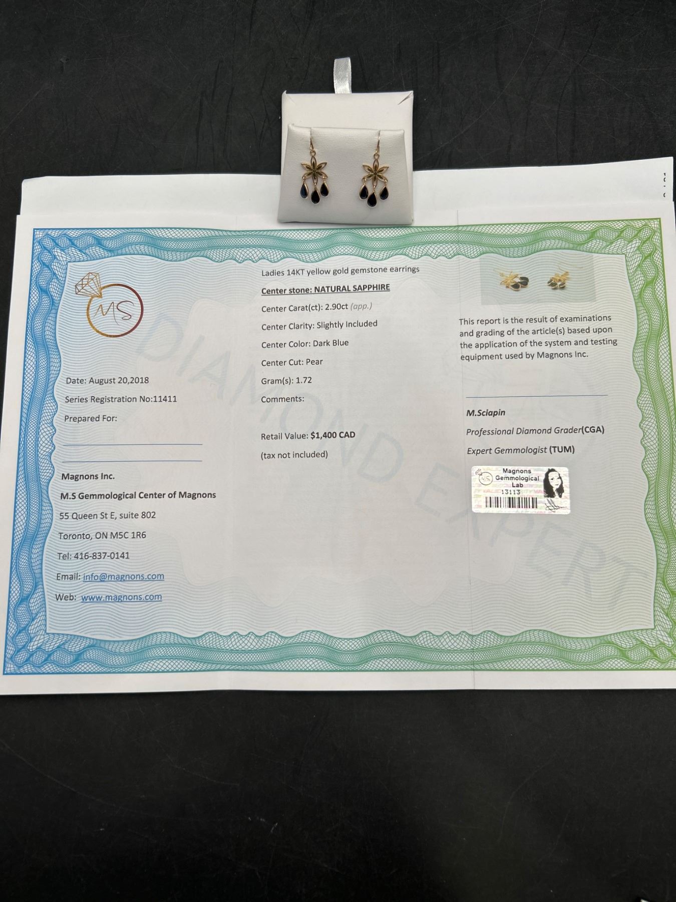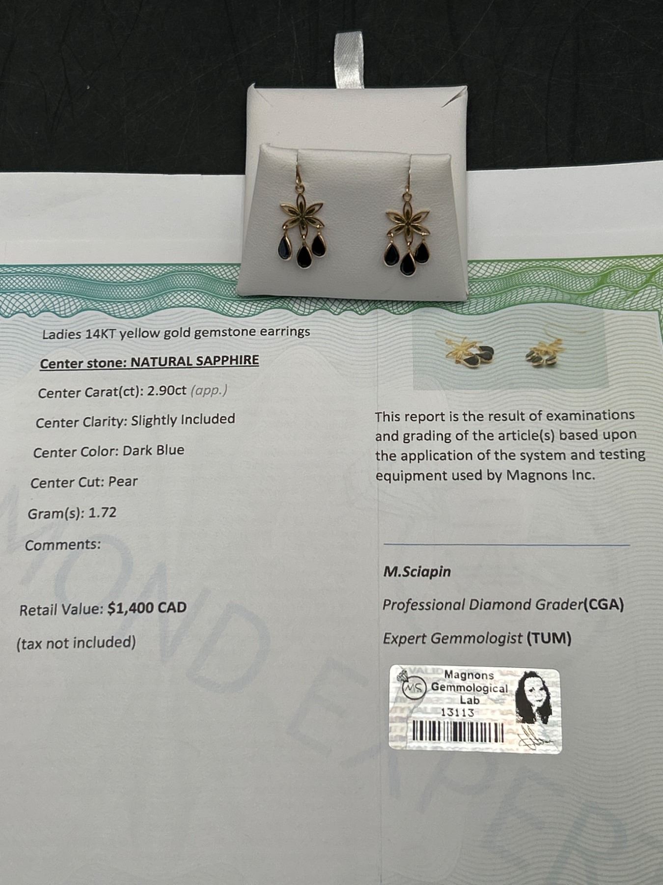 Ladies’ 14K yellow gold earrings featuring natural sapphires with an approximate total weight of 2.9 carats. Deep blue coloring, rated as slightly included in clarity. The earrings weigh approximately 1.72 grams. Certified by a gemologist and made in Canada. Includes documentation detailing the gemstone characteristics.