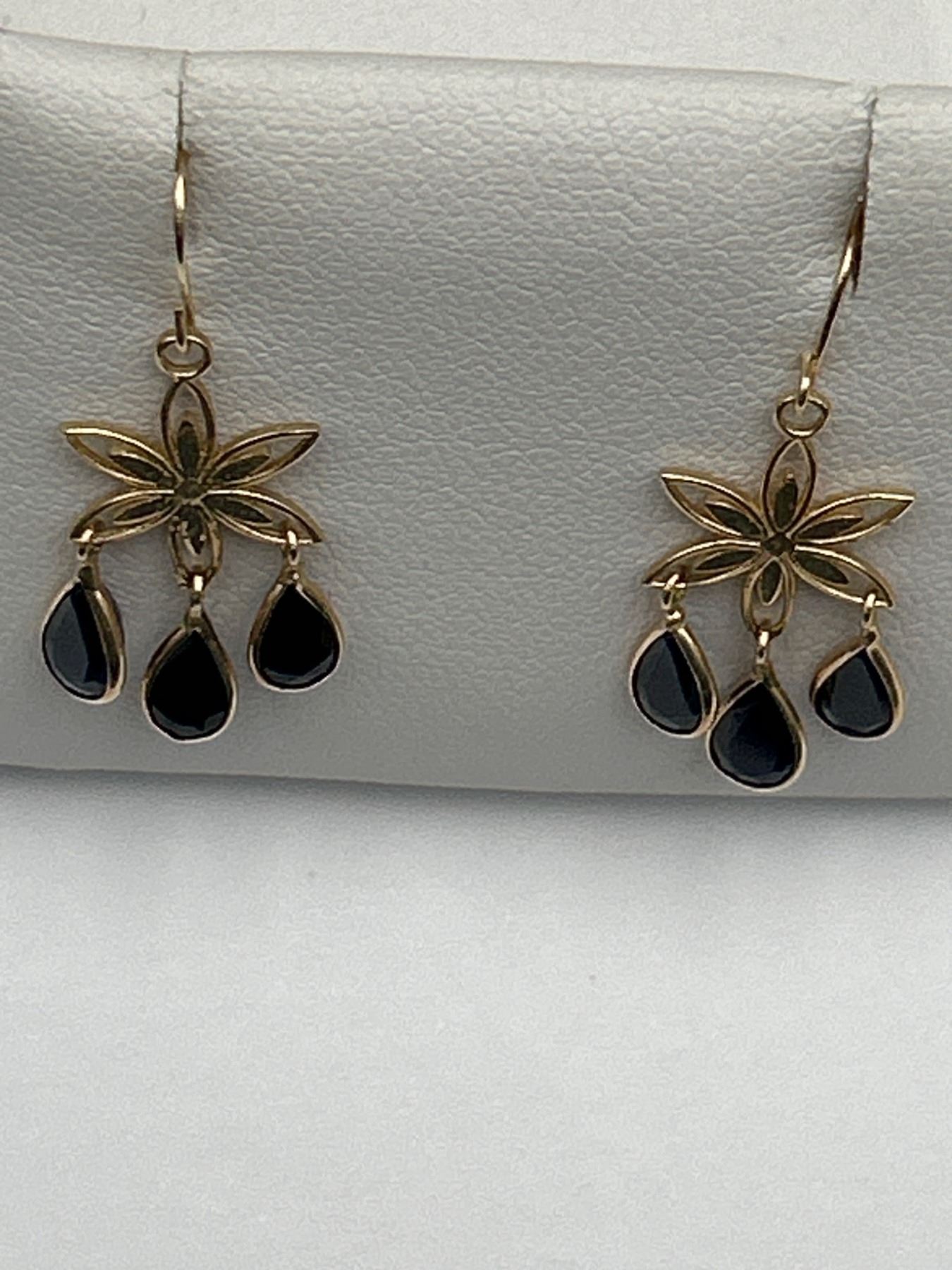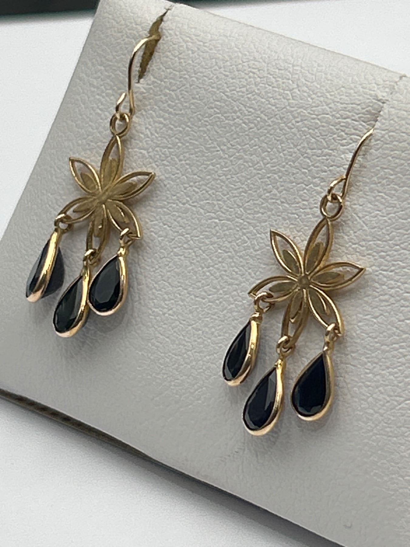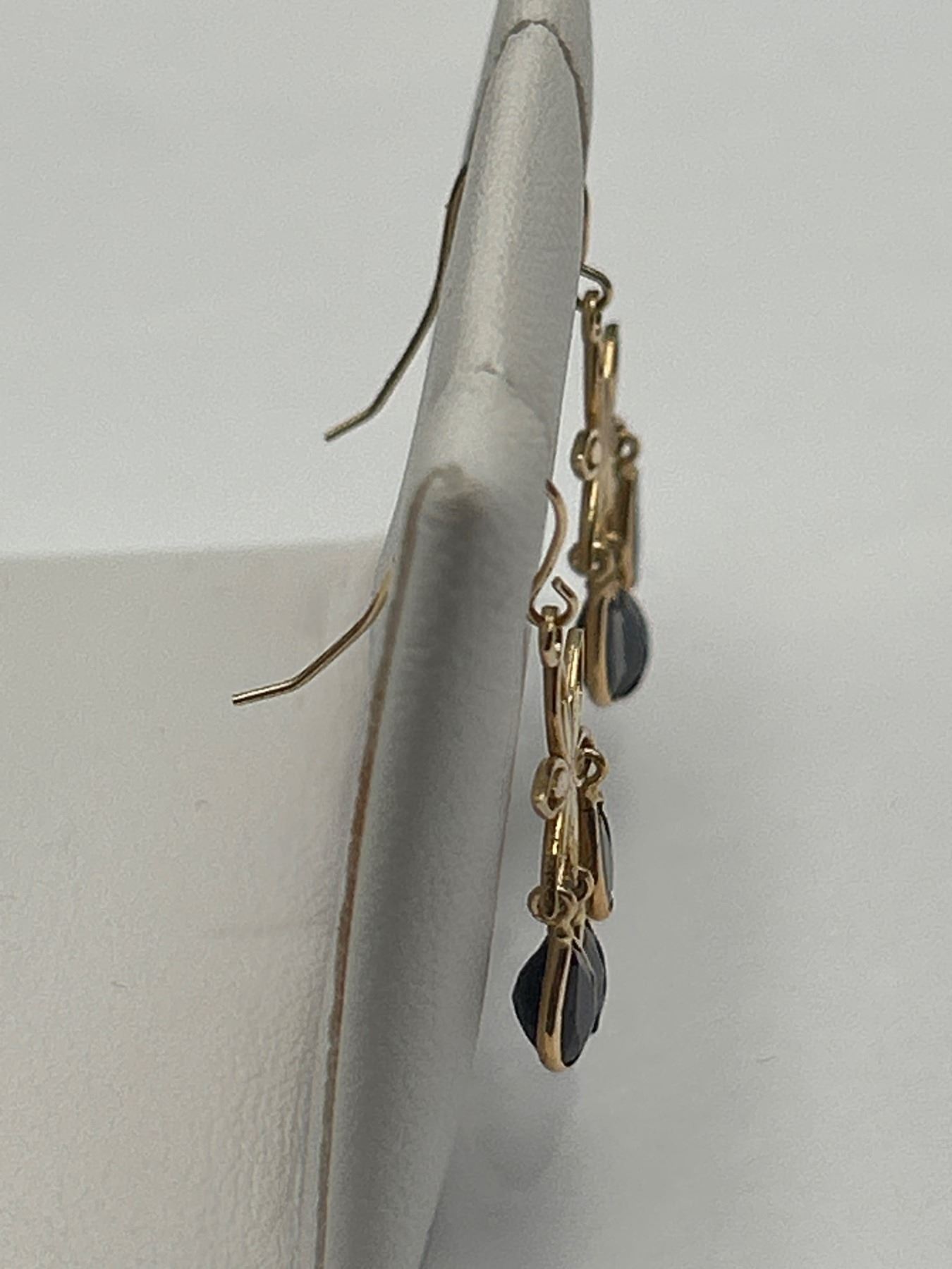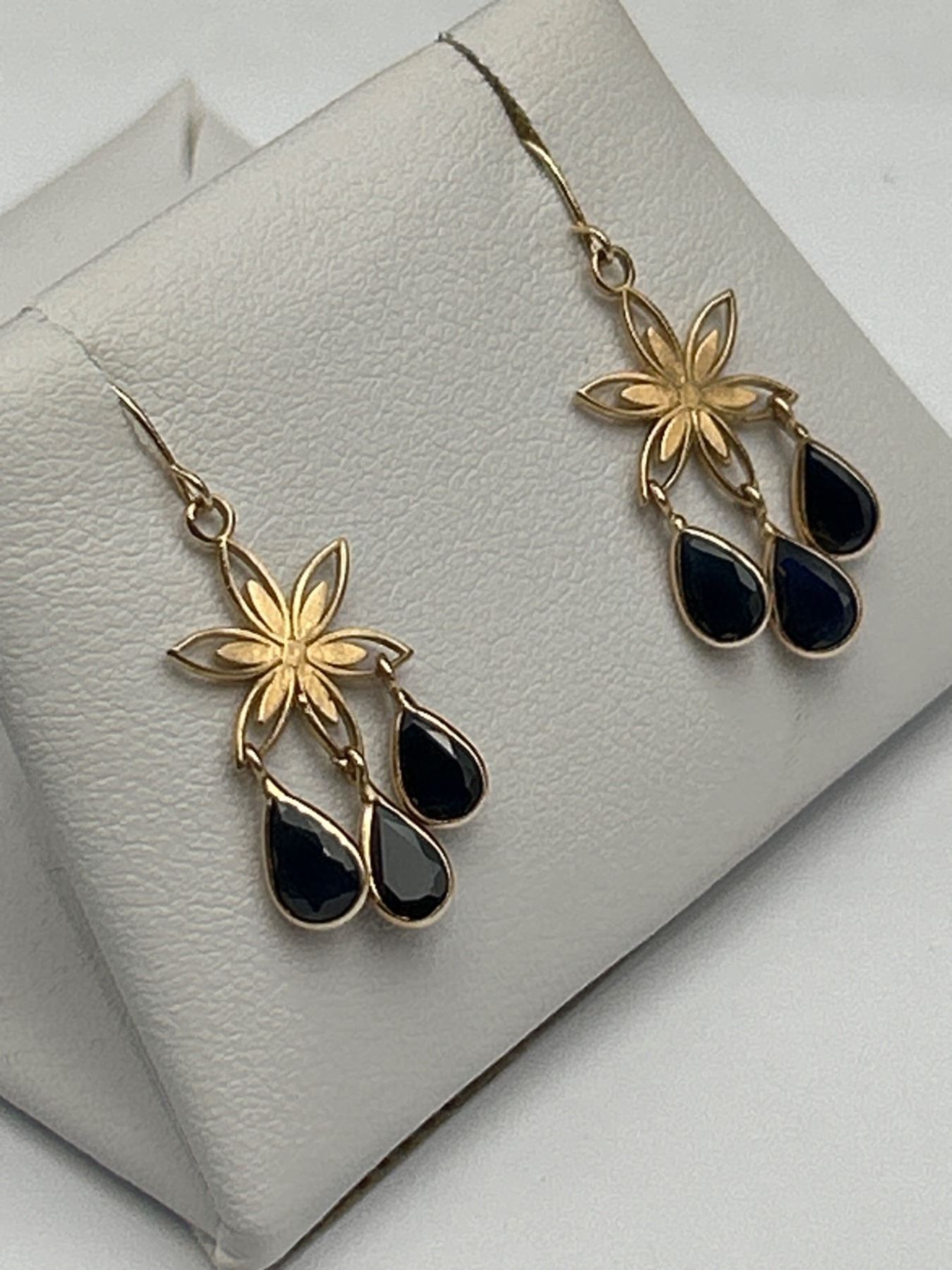Ladies’ 14K yellow gold earrings featuring natural sapphires with an approximate total weight of 2.9 carats. Deep blue coloring, rated as slightly included in clarity. The earrings weigh approximately 1.72 grams. Certified by a gemologist and made in Canada. Includes documentation detailing the gemstone characteristics.