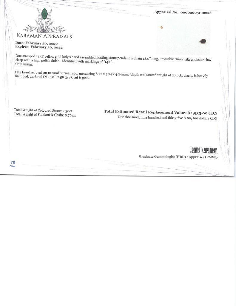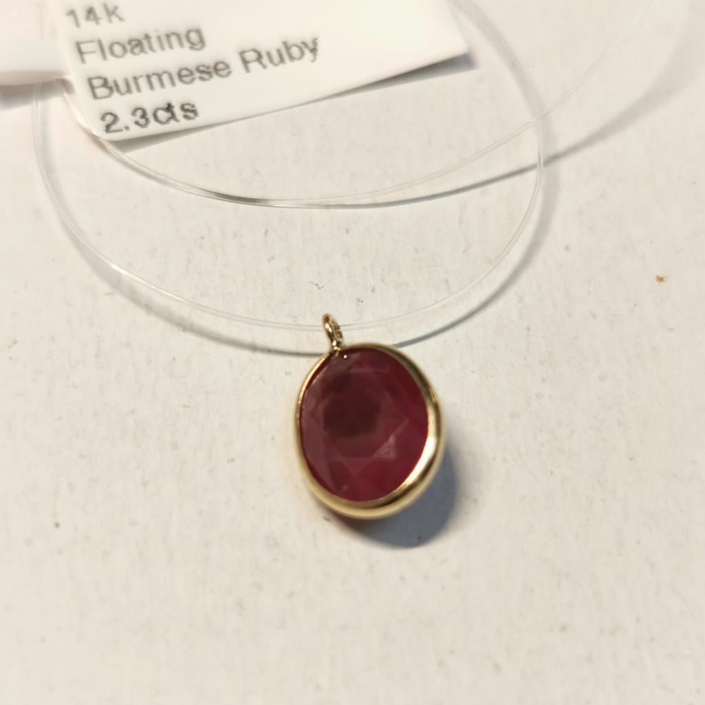 14K Yellow Gold Floating Burmese Ruby(2.3ct) Necklace, Custom Designed in Canada, Appraised Retail $1935