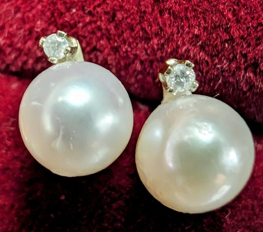 14K Yellow Gold Fresh Water Pearl And Diamond 0.02Ct Earrings, Made in Canada, Suggested Retail Value $240