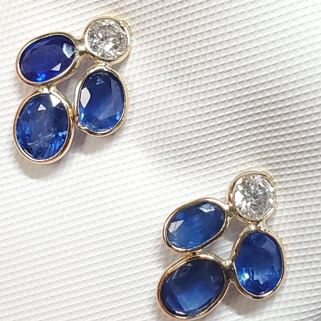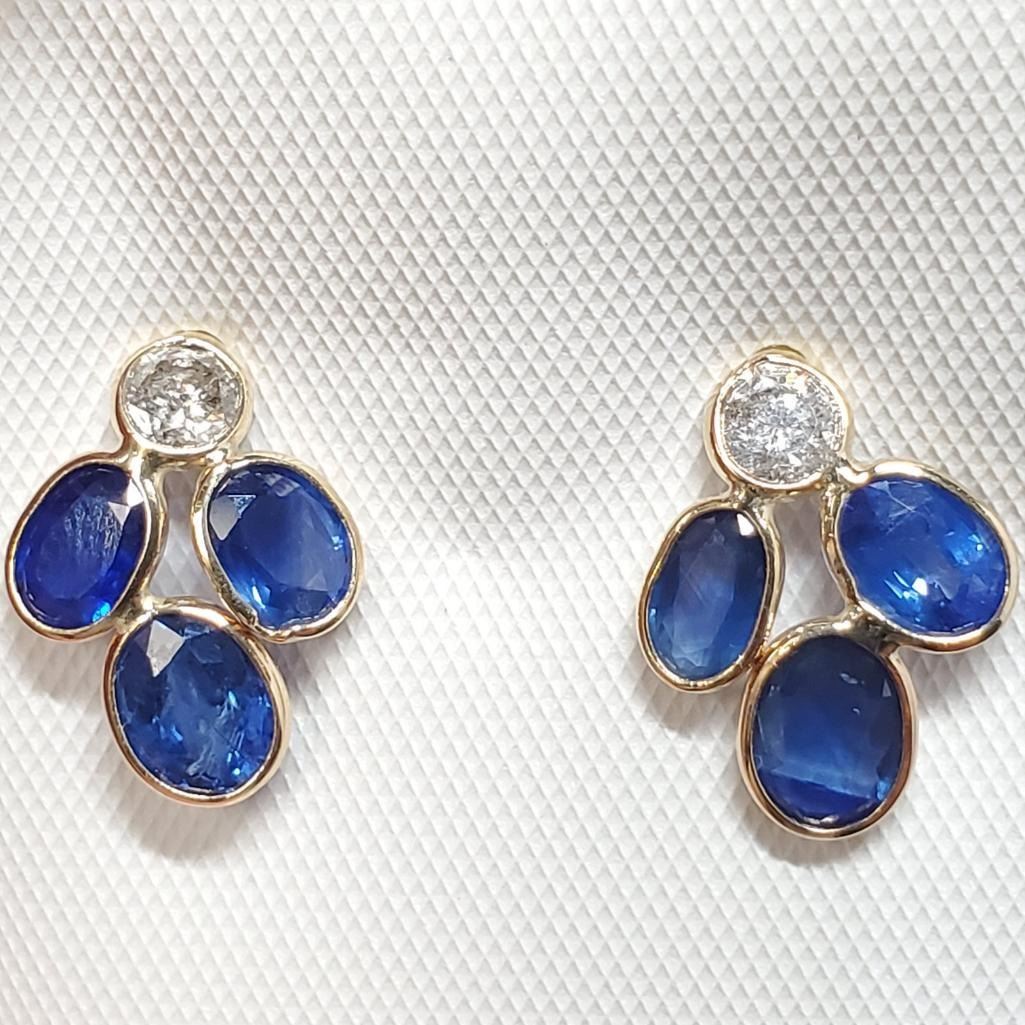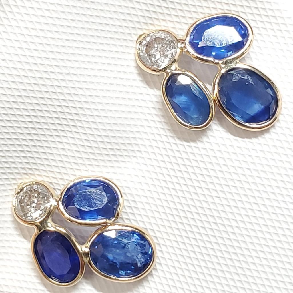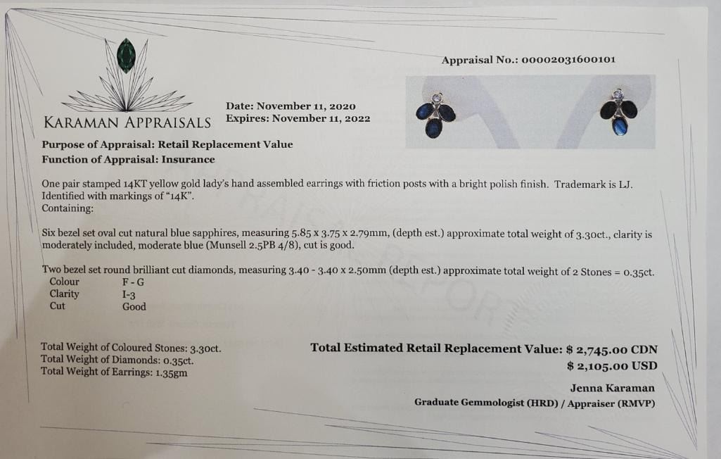 14K Yellow Gold Natural Blue Sapphire(3.3ct) Diamond(0.35ct) Colour(F-G), Clarity (I-3) Earrings (~weight 1.35g), Made in Canada, Appraised Retail $2745 (Estimated Selling Price from $360 to $720)