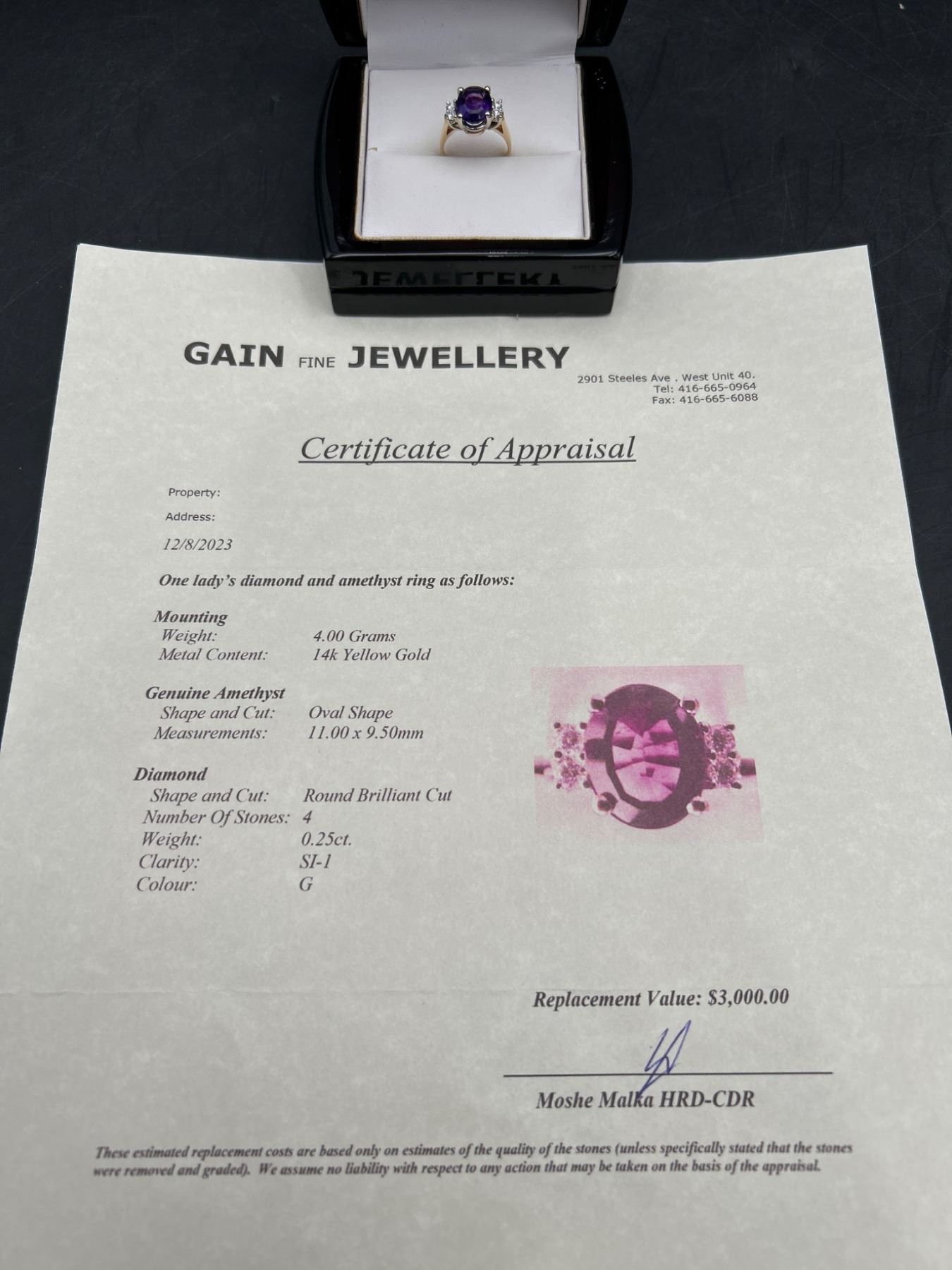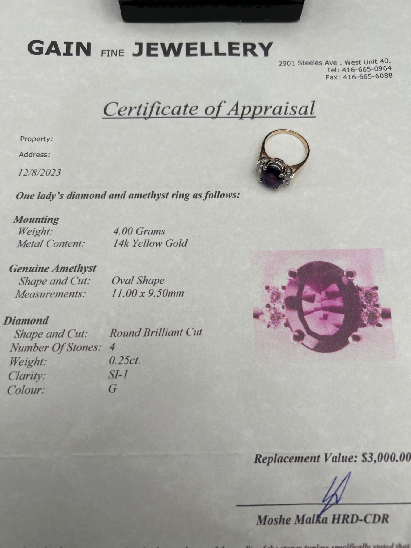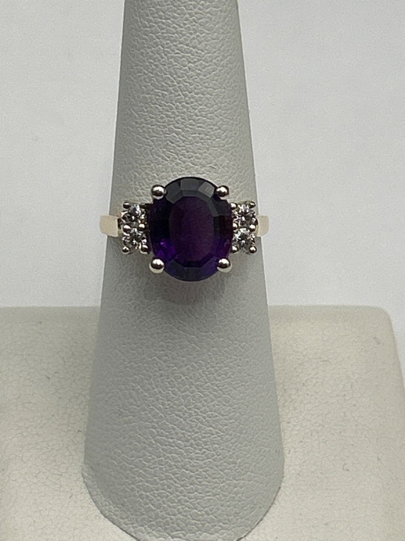 This ring features a 4.00-gram 14k yellow gold mounting with a genuine amethyst centerpiece in an oval shape (11.00 x 9.50 mm). The amethyst is complemented by 4 round brilliant-cut diamonds with a total weight of 0.25 carats, SI-1 clarity, and G color. Comes with a detailed appraisal valuing the item at $3,000. Size 8