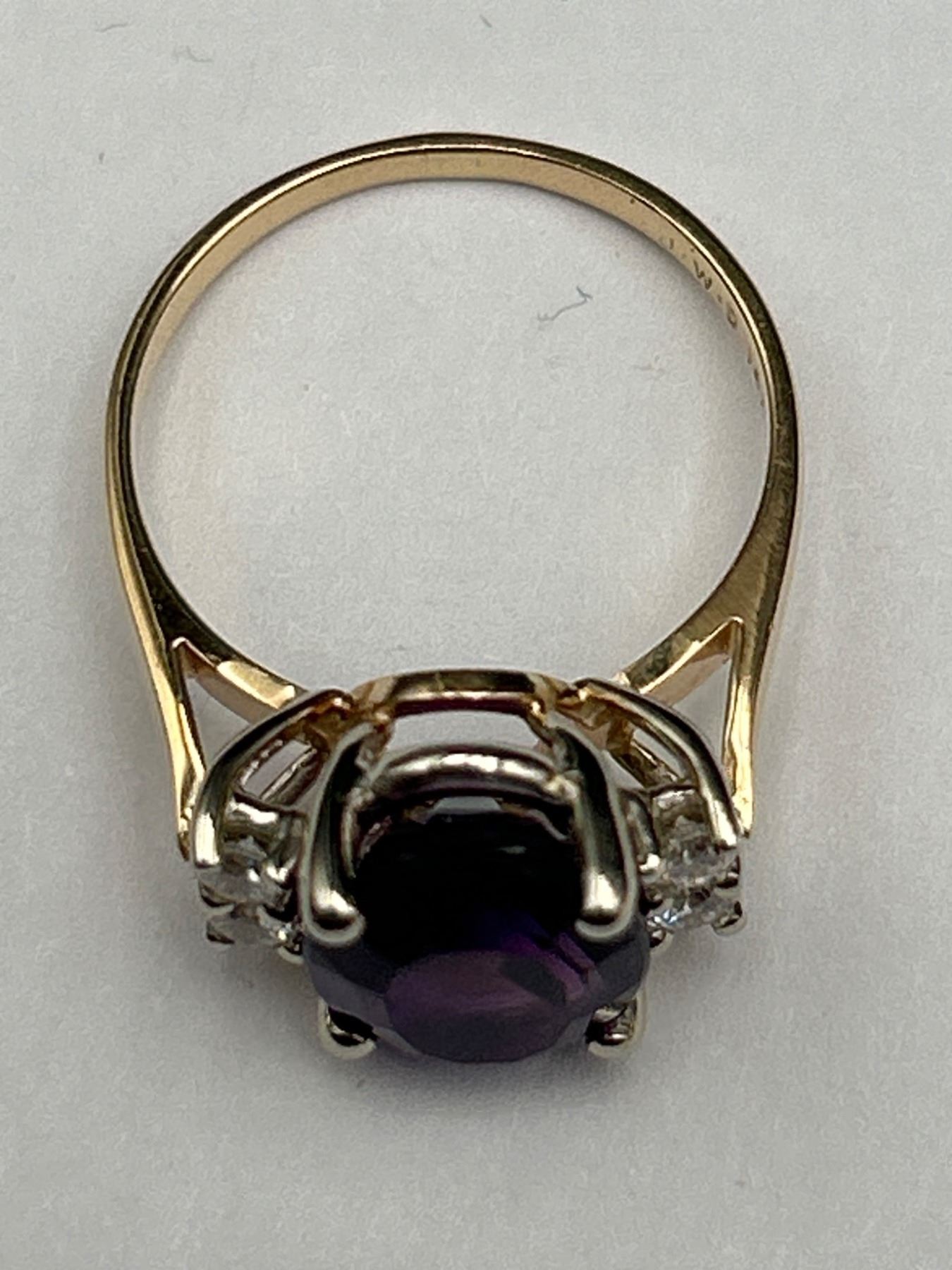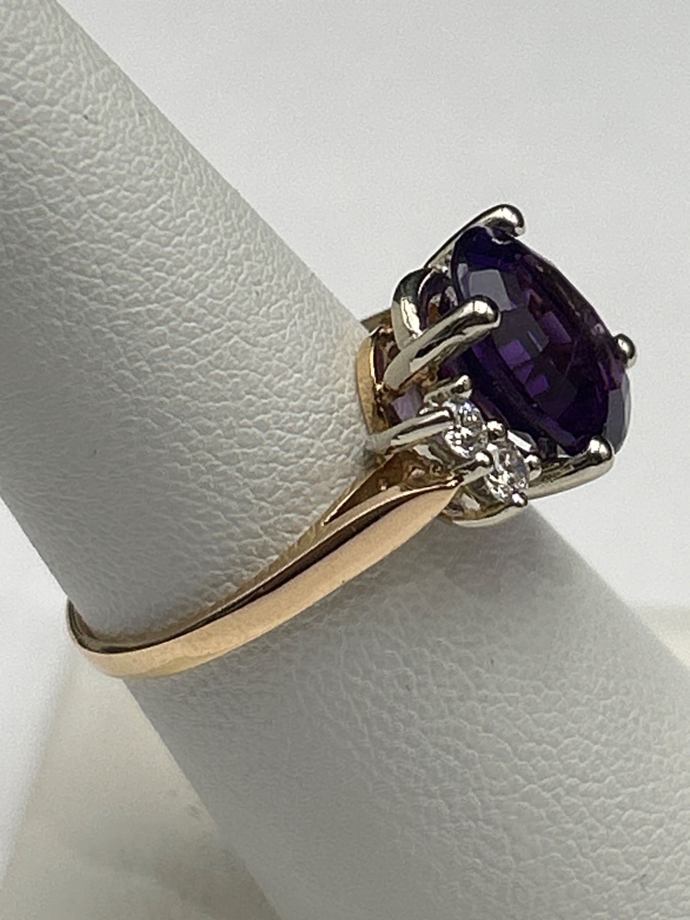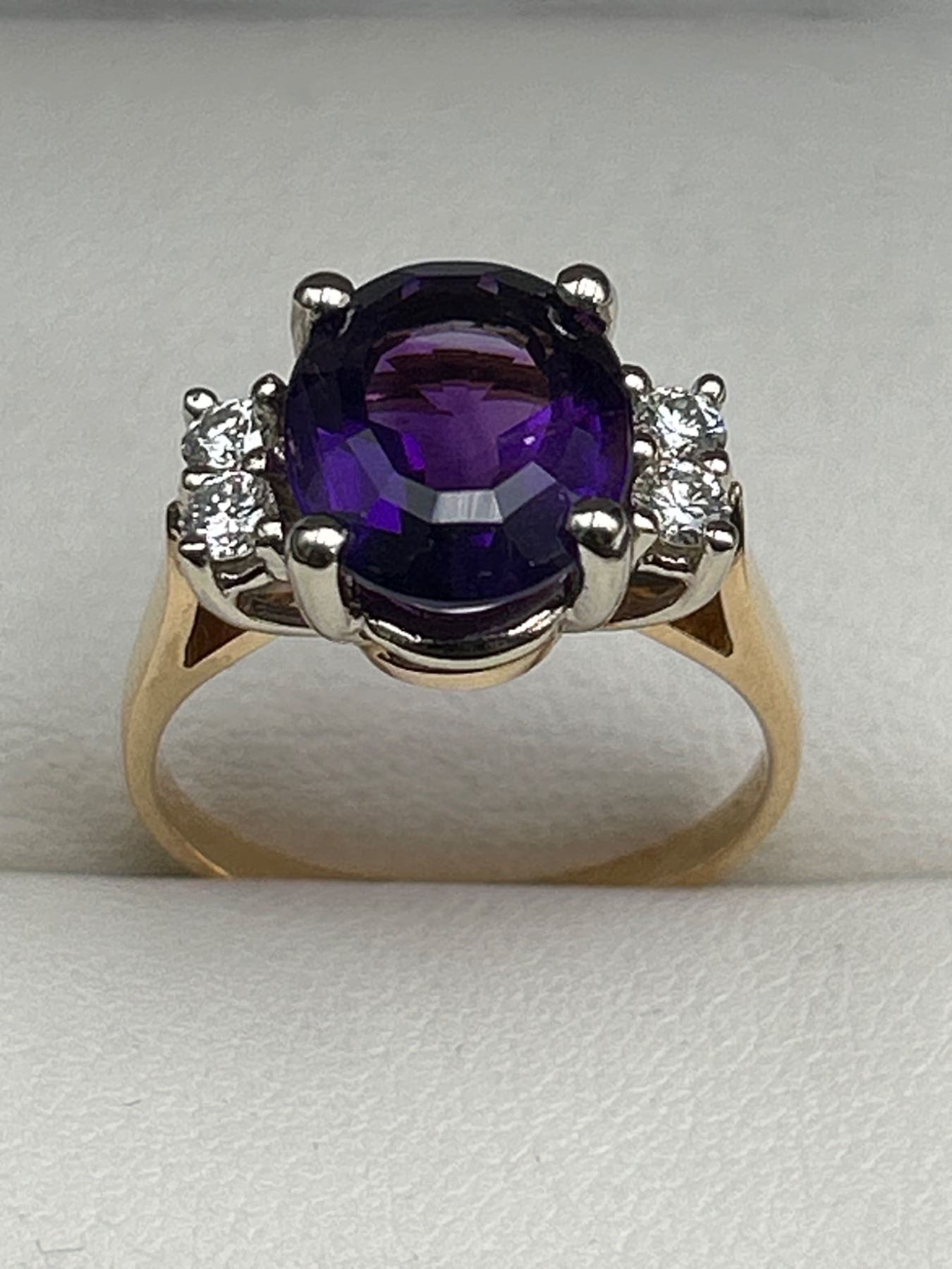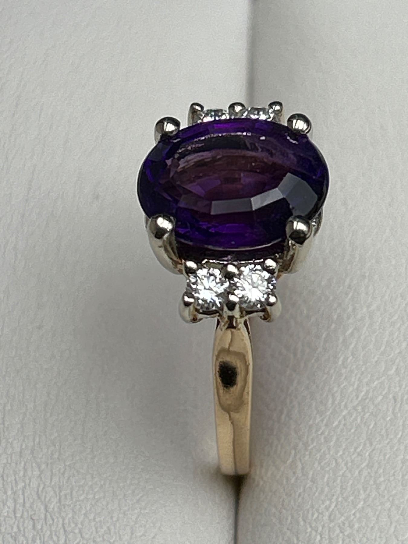 This ring features a 4.00-gram 14k yellow gold mounting with a genuine amethyst centerpiece in an oval shape (11.00 x 9.50 mm). The amethyst is complemented by 4 round brilliant-cut diamonds with a total weight of 0.25 carats, SI-1 clarity, and G color. Comes with a detailed appraisal valuing the item at $3,000. Size 8