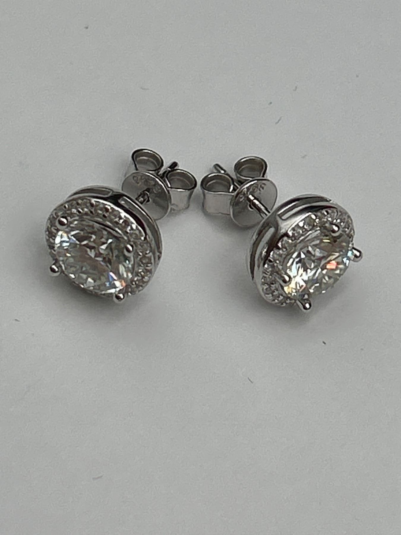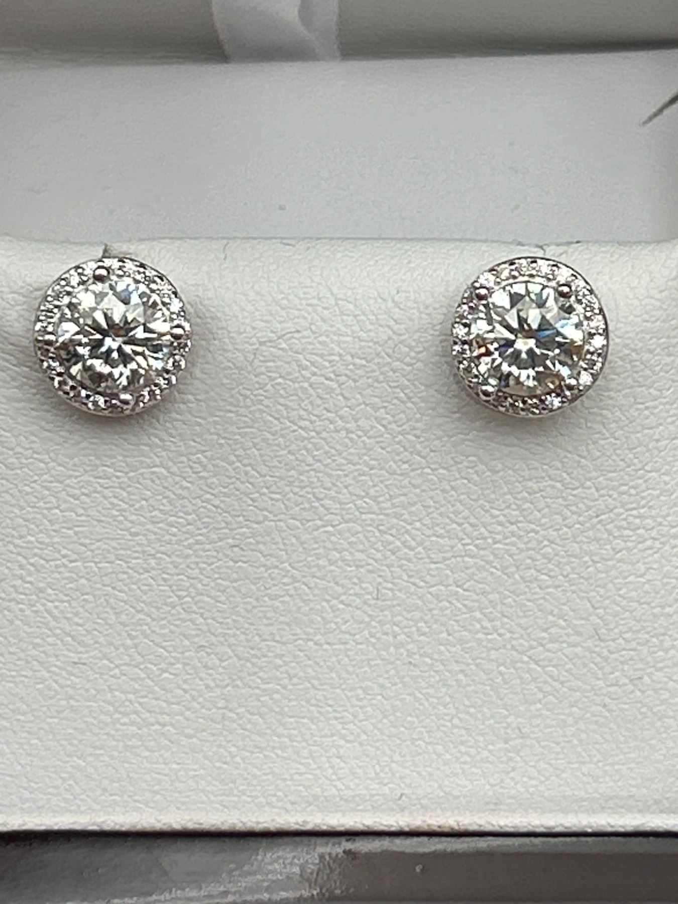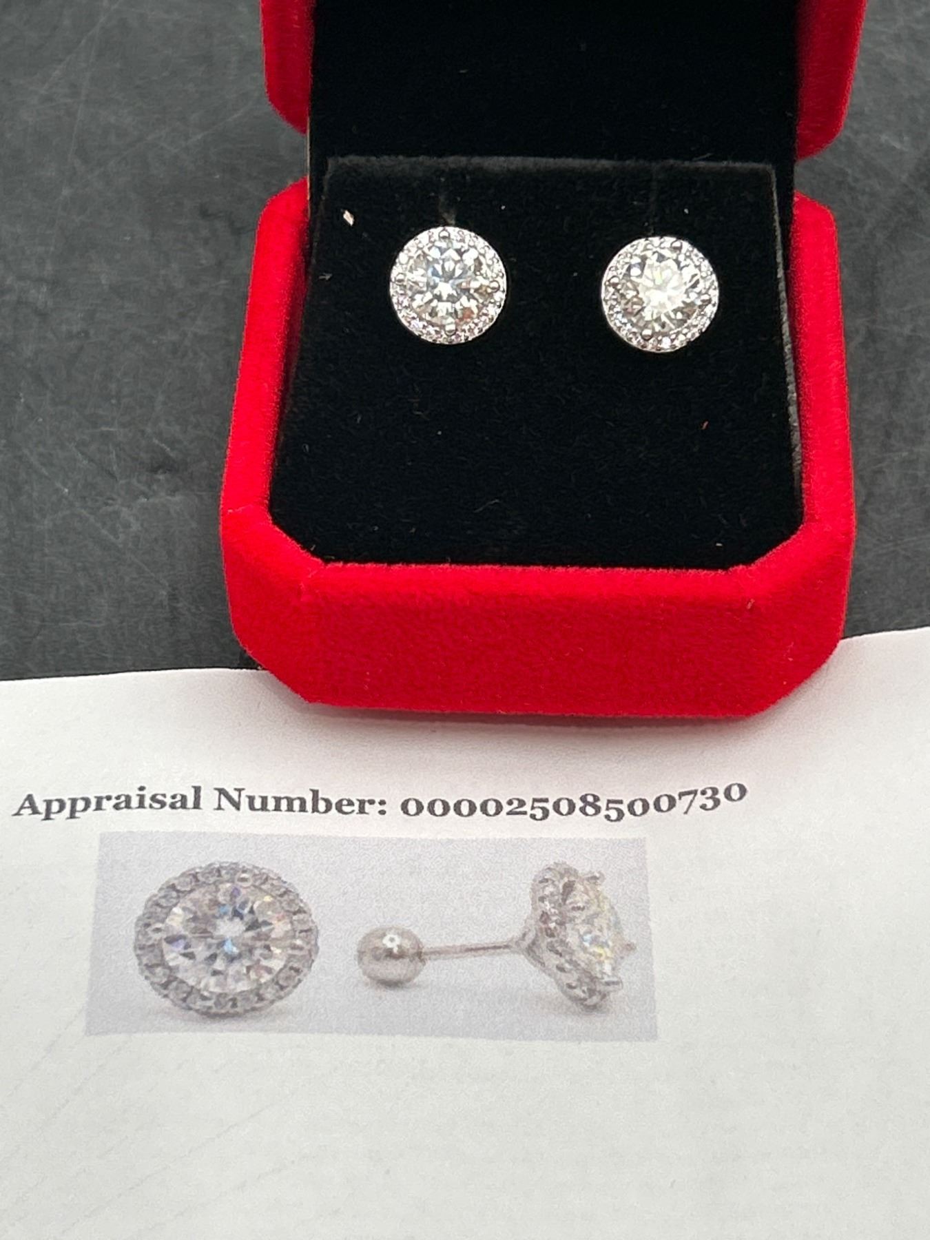 2.00 CT TW GRA CERTIFIED ROUND BRILLIANT CUT MOISSANITE STONES VVS D COLOR WITH 40 ROUND BRILLIANT CUT CUBIC ZIRCONIA SET IN ROUND HALOS SET IN 925 SILVER EARRINGS RETAIL VALUE $1,580.00