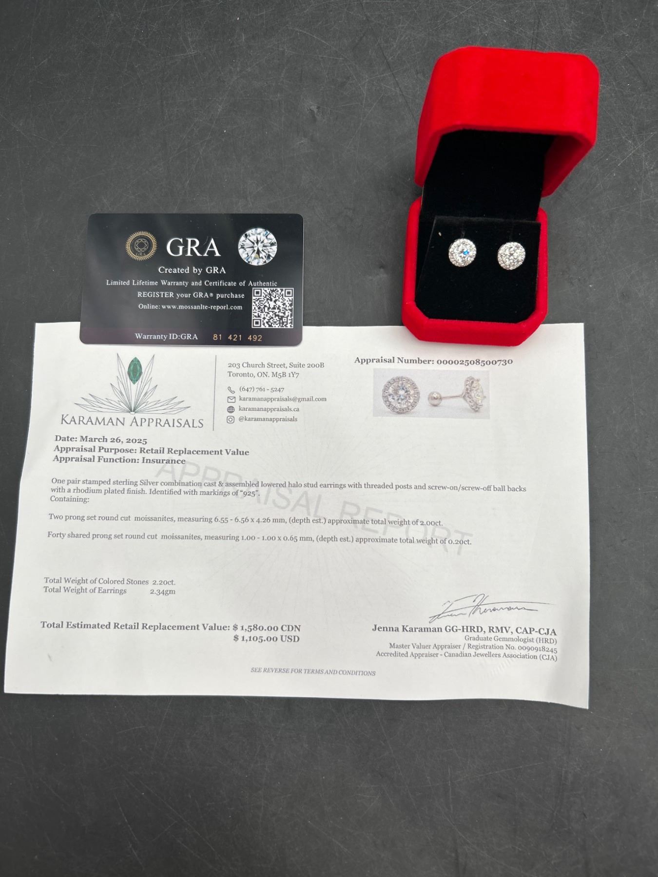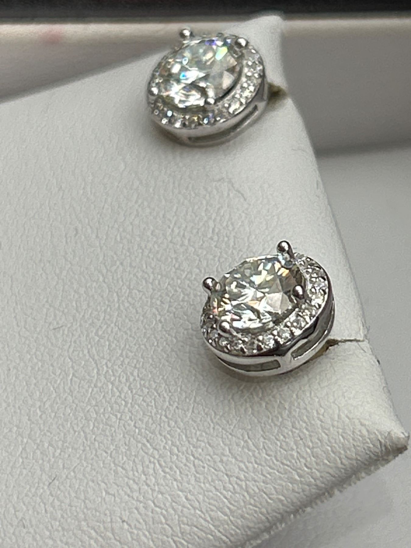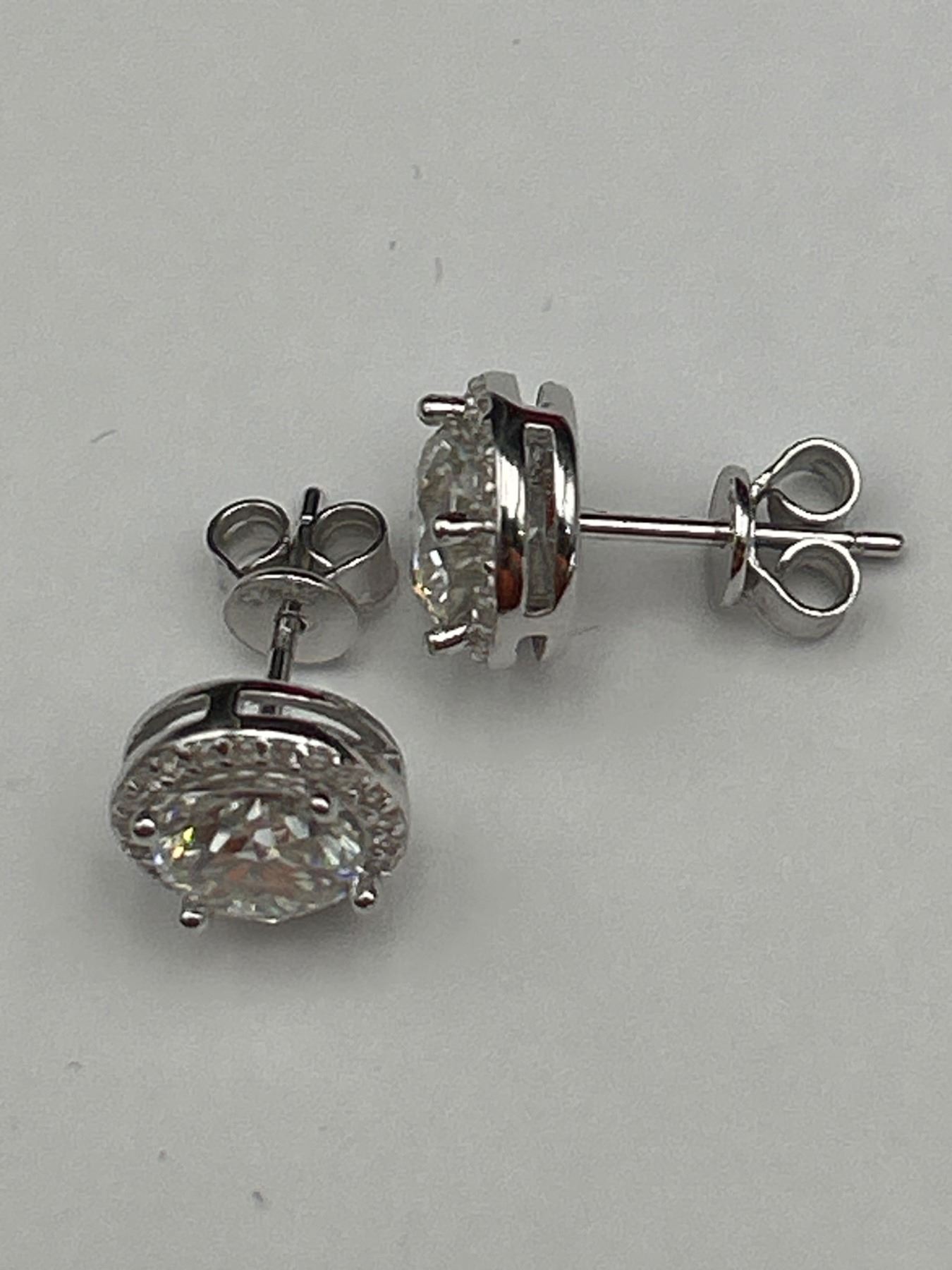 2.00 CT TW GRA CERTIFIED ROUND BRILLIANT CUT MOISSANITE STONES VVS D COLOR WITH 40 ROUND BRILLIANT CUT CUBIC ZIRCONIA SET IN ROUND HALOS SET IN 925 SILVER EARRINGS RETAIL VALUE $1,580.00