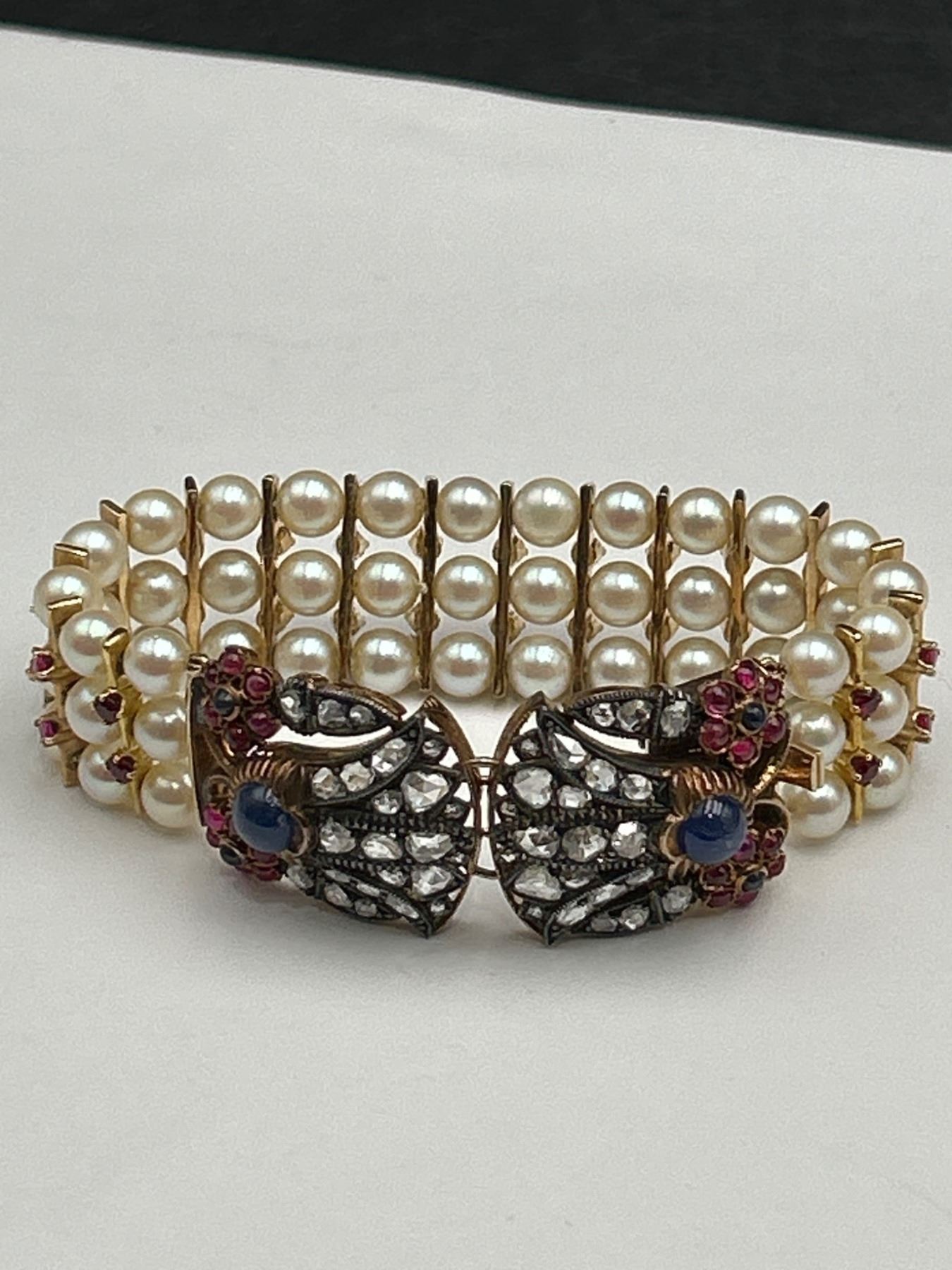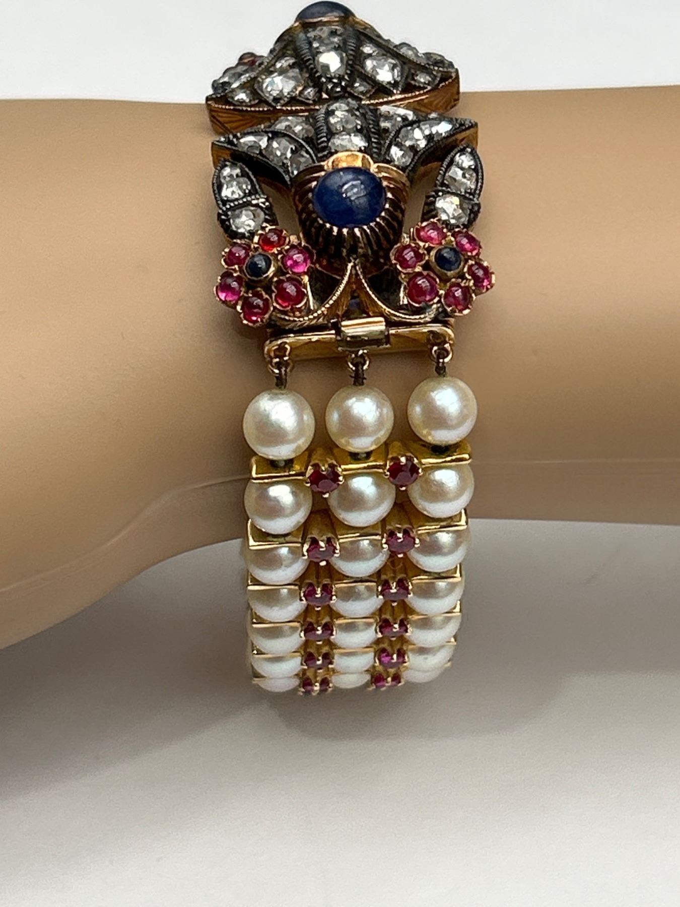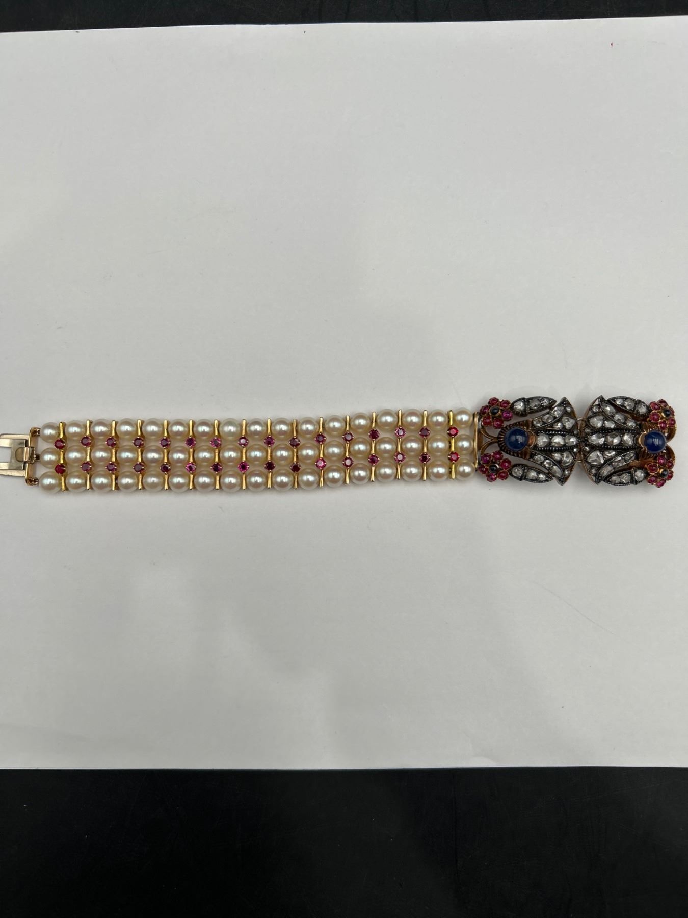 This is a multistrand Art Deco bracelet Set in 18K & 14K Gold featuring rows of pearls interspersed with Ruby, Diamonds & Sapphires. The clasp includes intricate designs with gemstones, . The clasp showcases an ornate arrangement of stones and metalwork. The bracelet combines classic elements and detailed craftsmanship.All specs and details in Appraisal report . Appraised at $9250.00