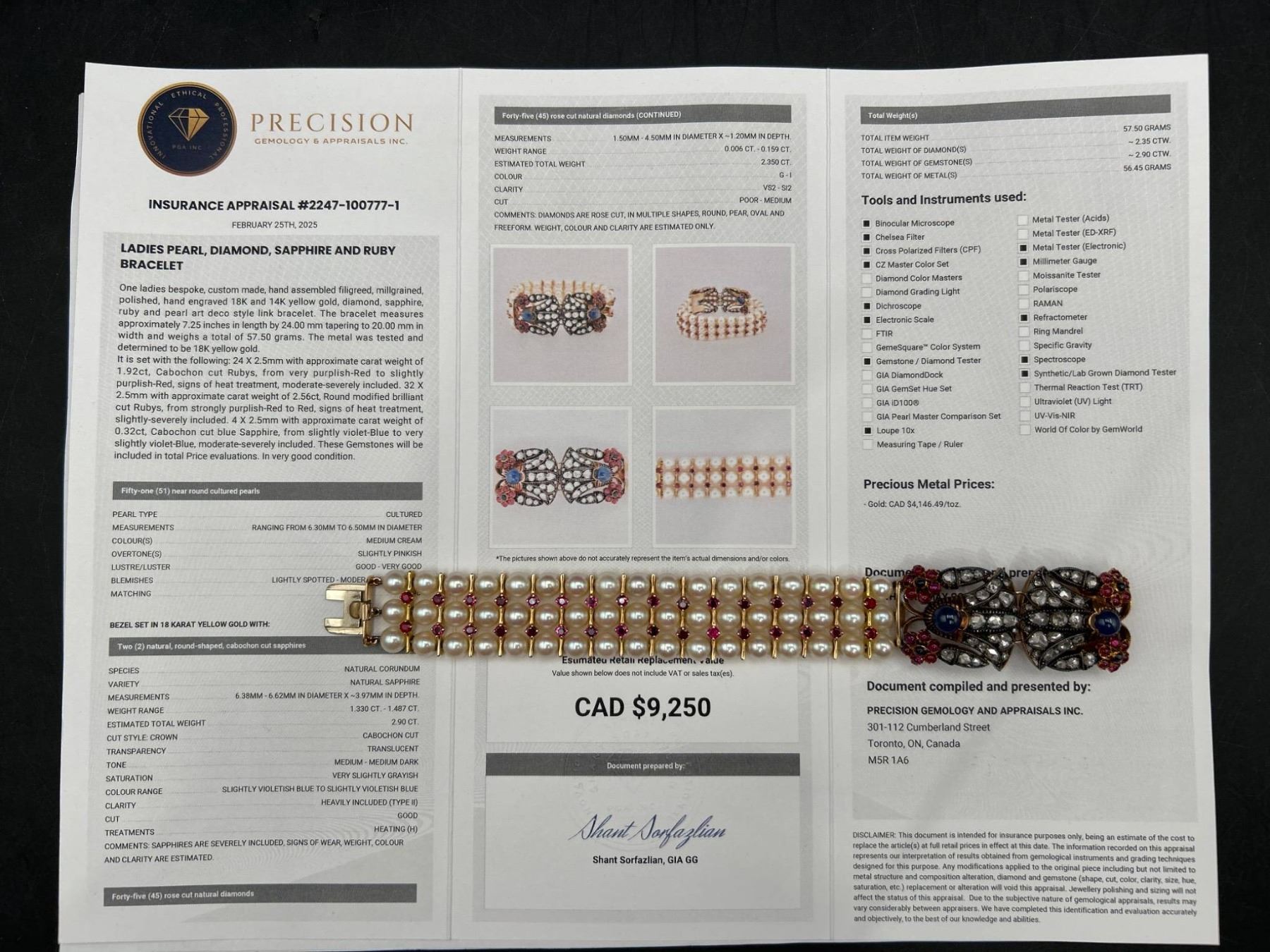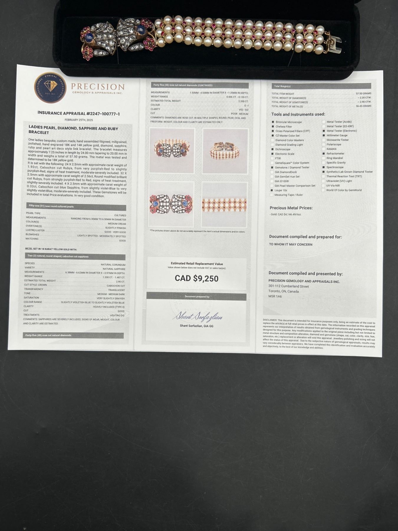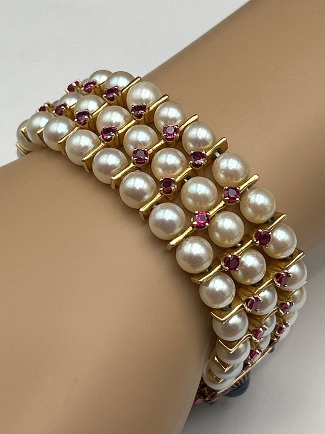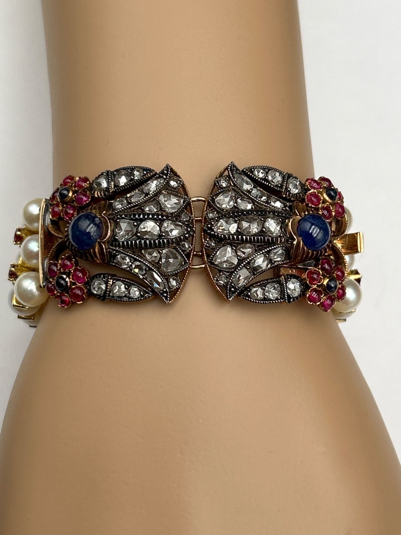 This is a multistrand Art Deco bracelet Set in 18K & 14K Gold featuring rows of pearls interspersed with Ruby, Diamonds & Sapphires. The clasp includes intricate designs with gemstones, . The clasp showcases an ornate arrangement of stones and metalwork. The bracelet combines classic elements and detailed craftsmanship.All specs and details in Appraisal report . Appraised at $9250.00