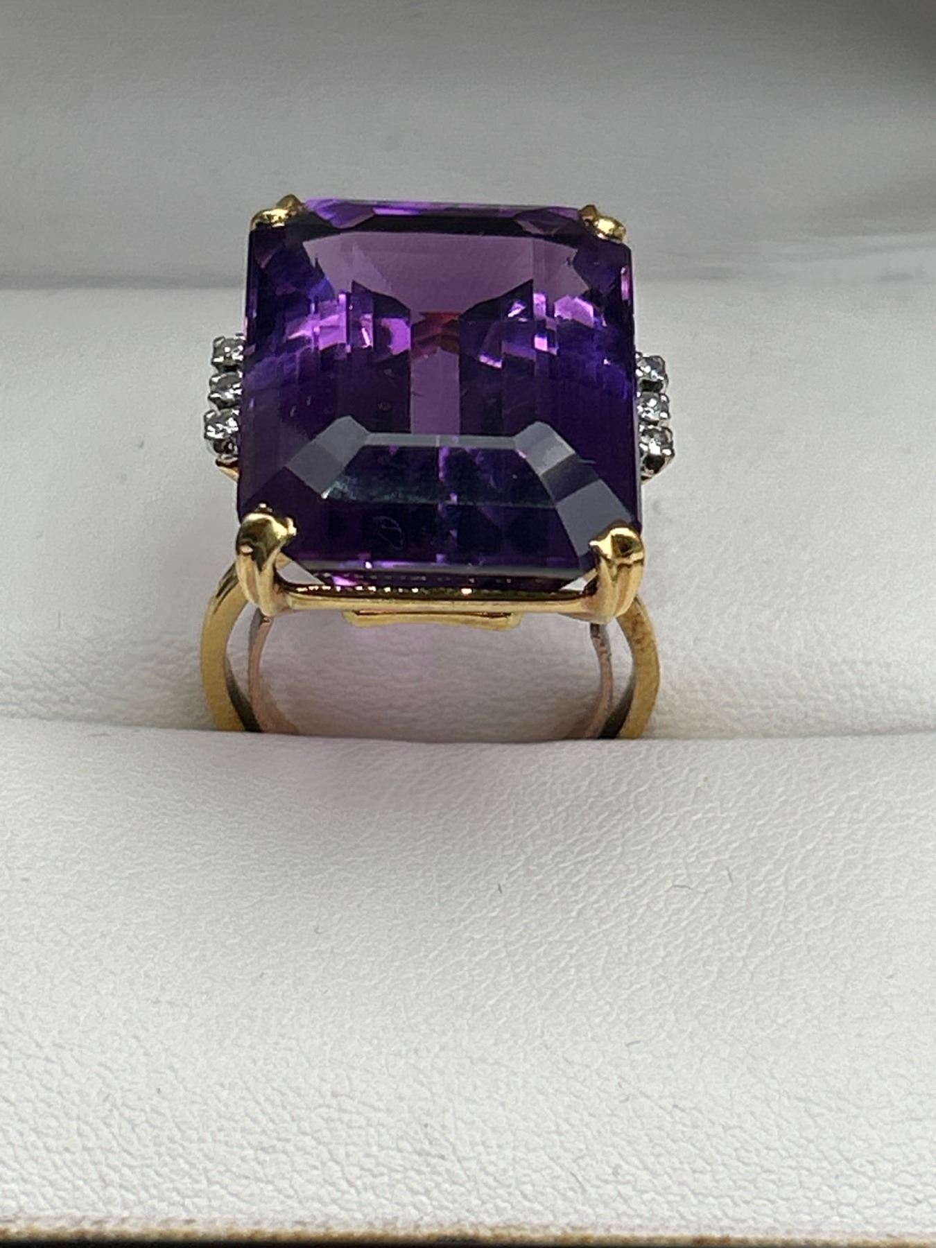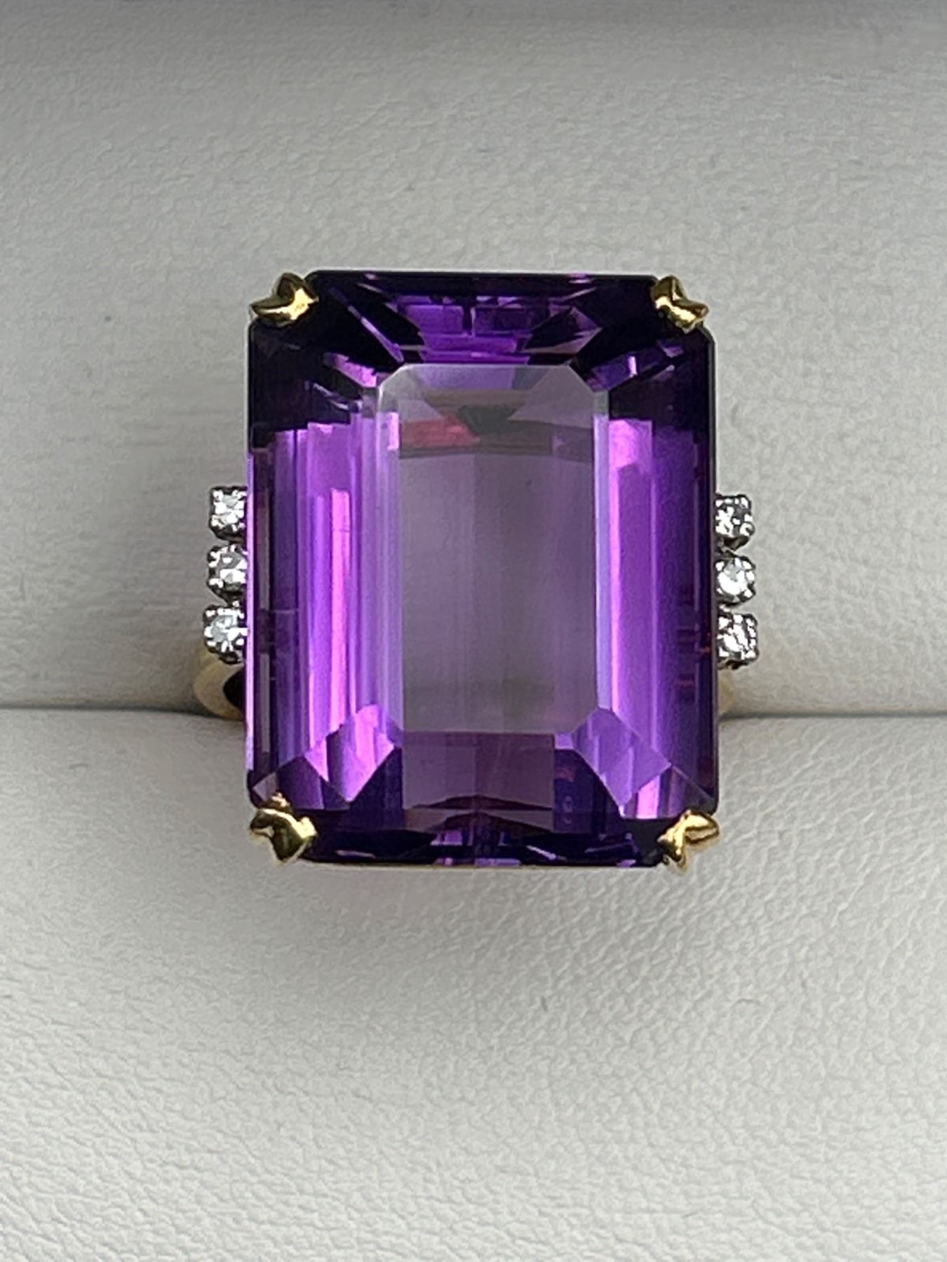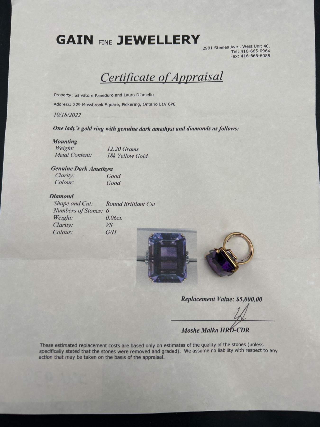 This listing features a 18k yellow gold ring set with an 18-carat rectangular amethyst gemstone. Accented by diamonds on either side of the amethyst, the ring is presented with an approximate weight of 12.2 grams. The amethyst exhibits a dark purple color and is classified as ‘Good’ cut and clarity. The diamonds are round brilliant cut, weighing approximately 0.12 carats with medium color and good clarity. Appraisal certificate valued replacement cost at CAD 5,000.00.
