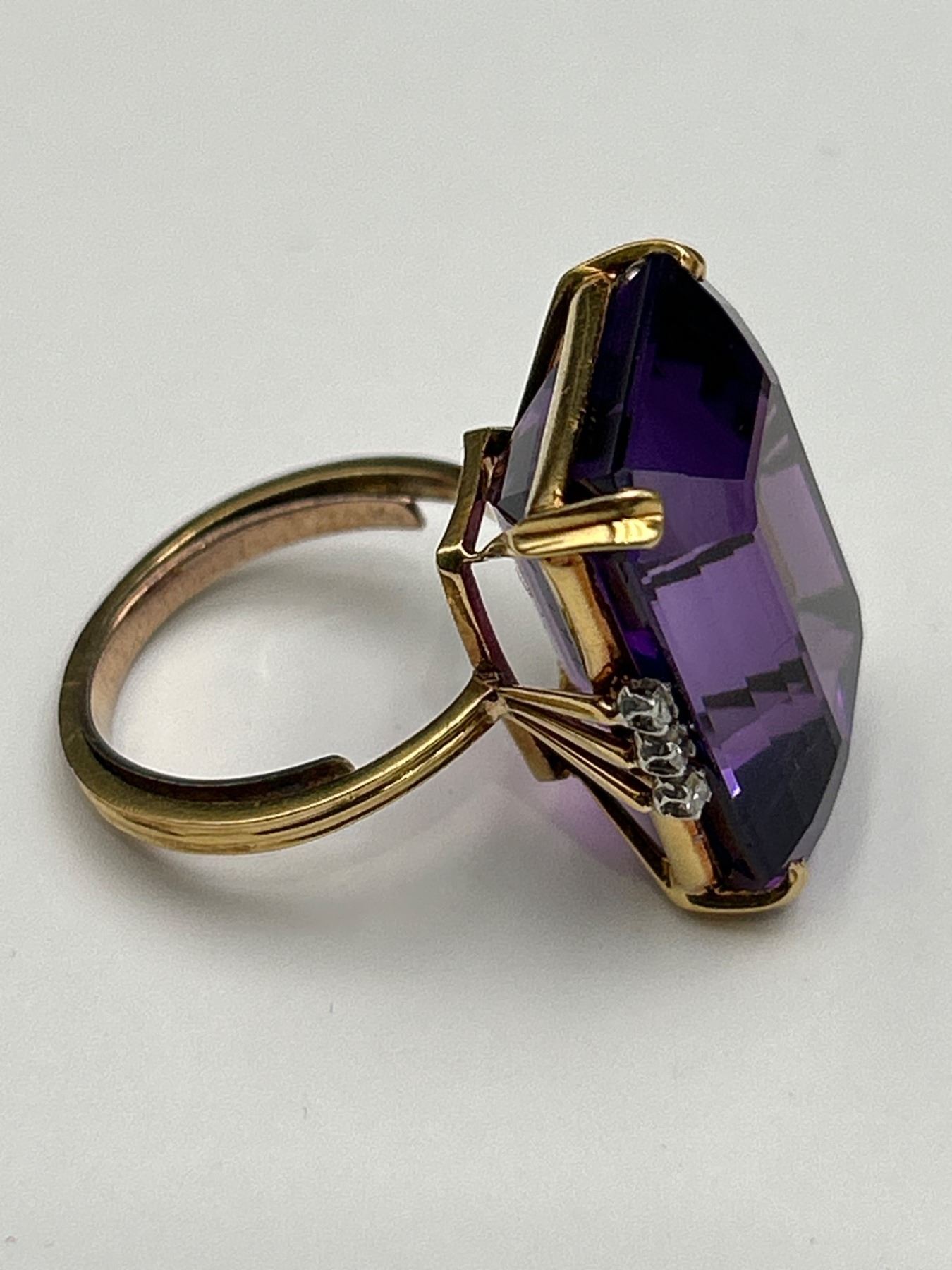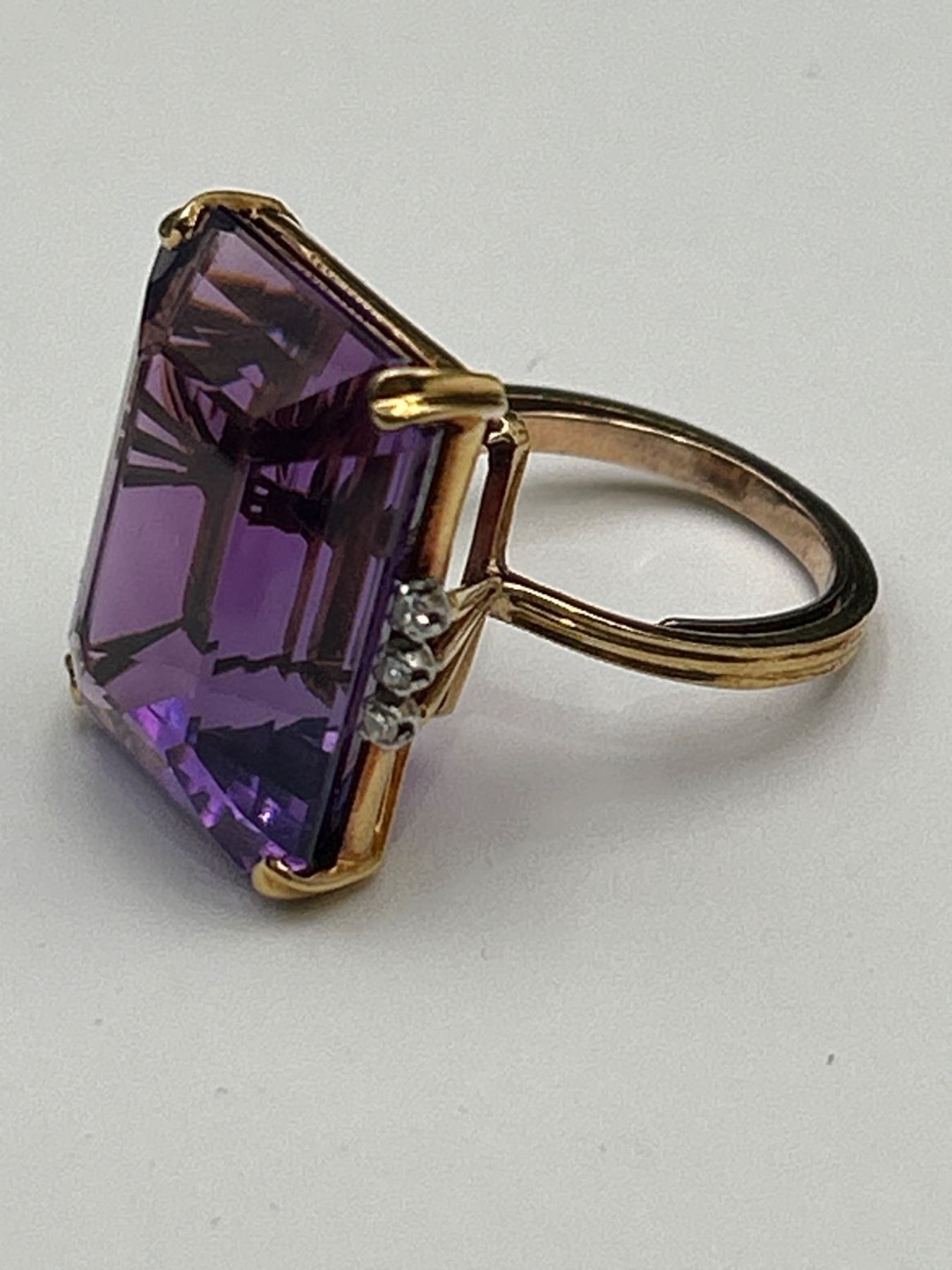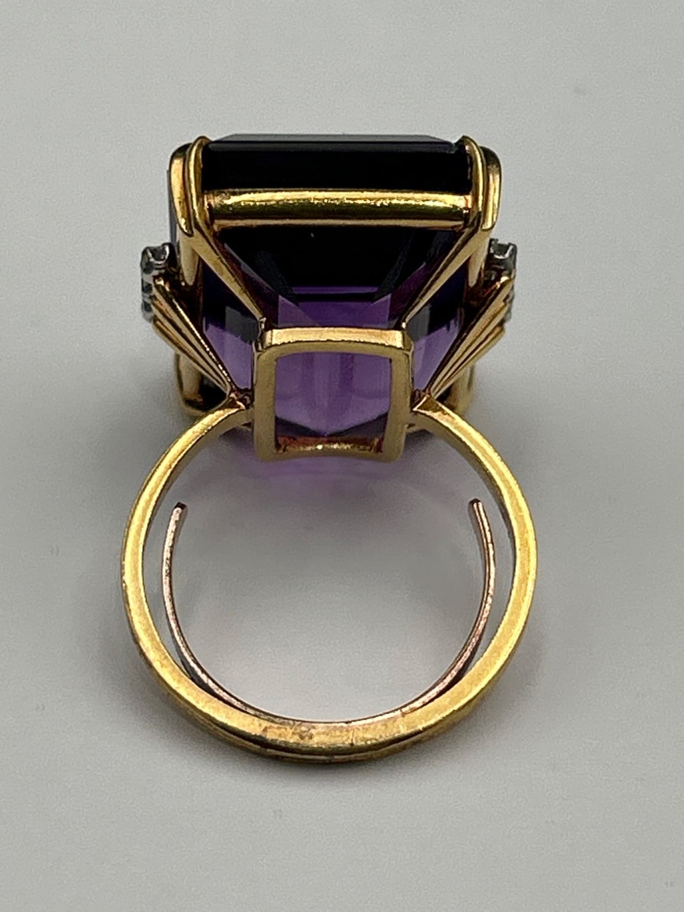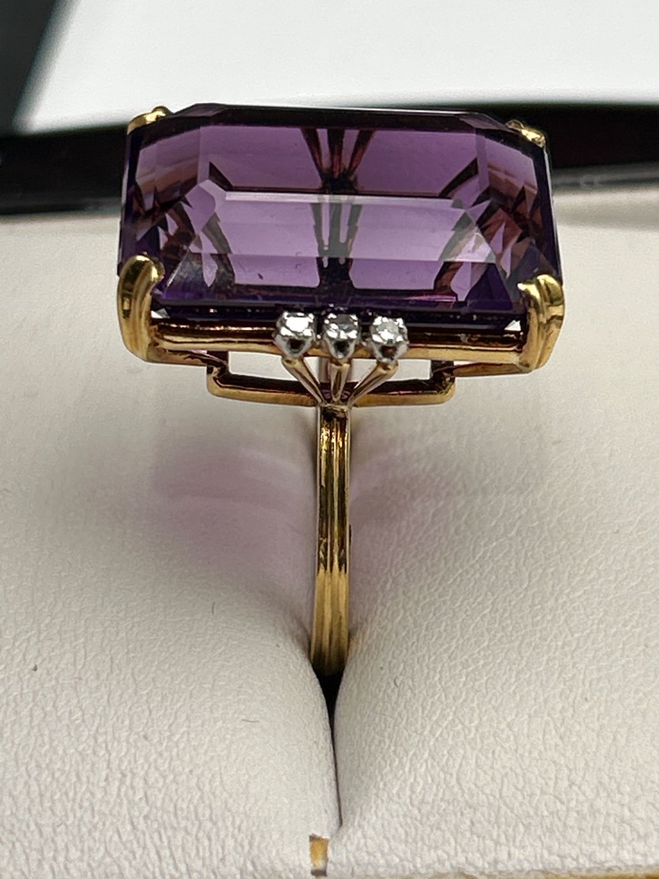 This listing features a 18k yellow gold ring set with an 18-carat rectangular amethyst gemstone. Accented by diamonds on either side of the amethyst, the ring is presented with an approximate weight of 12.2 grams. The amethyst exhibits a dark purple color and is classified as ‘Good’ cut and clarity. The diamonds are round brilliant cut, weighing approximately 0.12 carats with medium color and good clarity. Appraisal certificate valued replacement cost at CAD 5,000.00.
